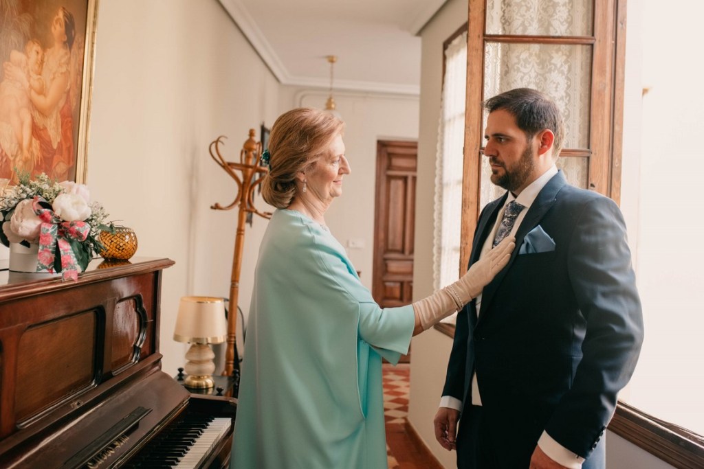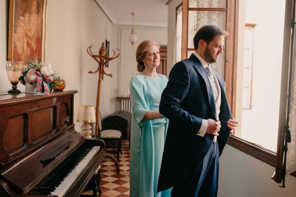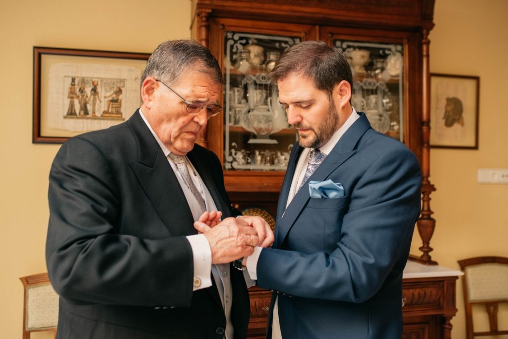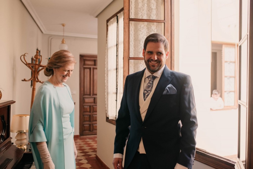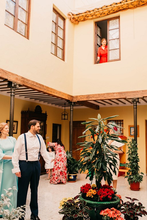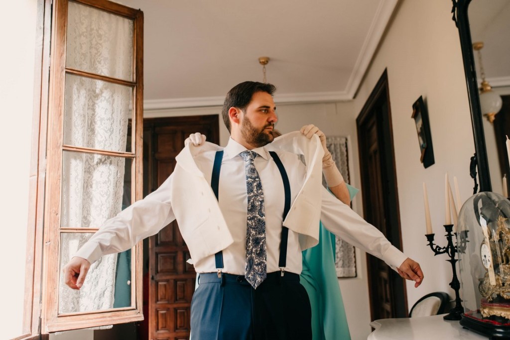El día de la boda, la casa de Carlos era un ir y venir de invitados, que se iban agolpando en su enorme patio, mientras nosotros realizábamos el reportaje de fotos. Carlos eligió un chaqué azul, con una bonita corbata a juego.
