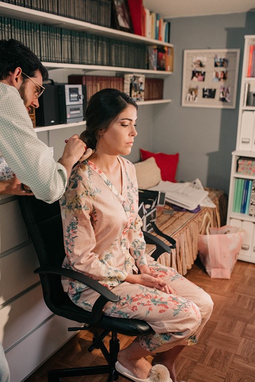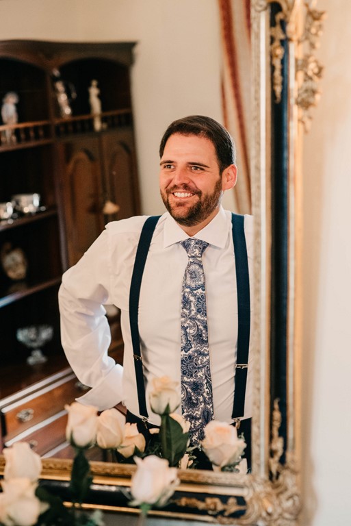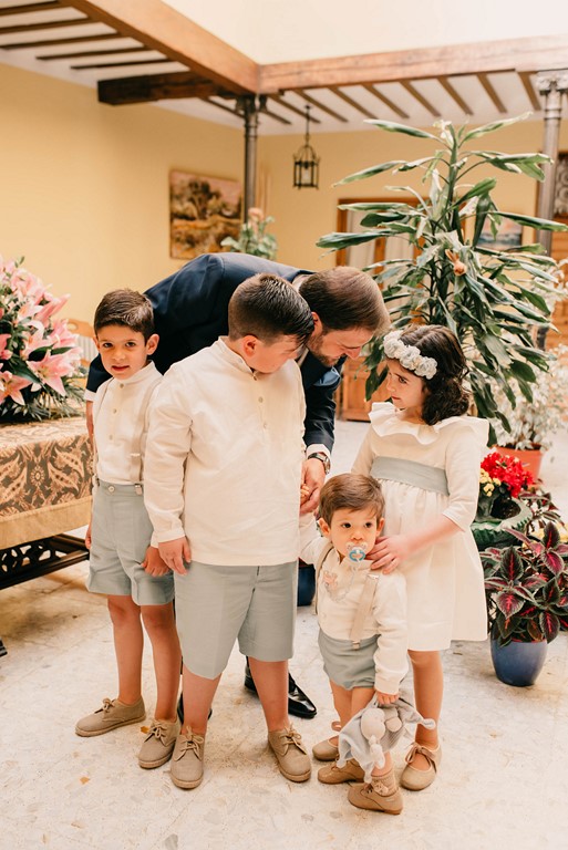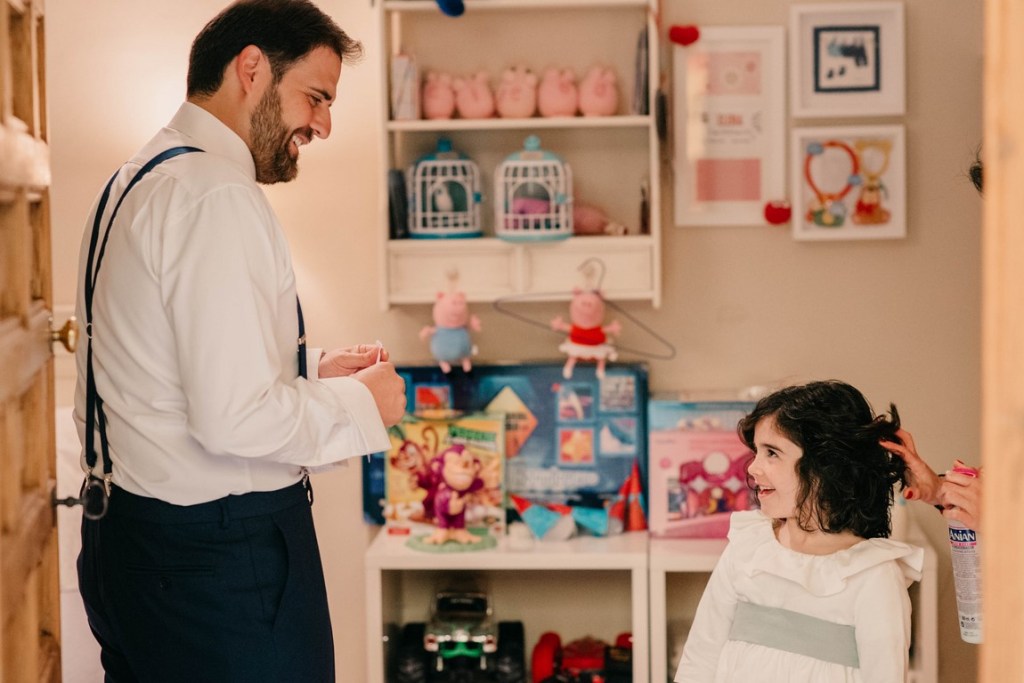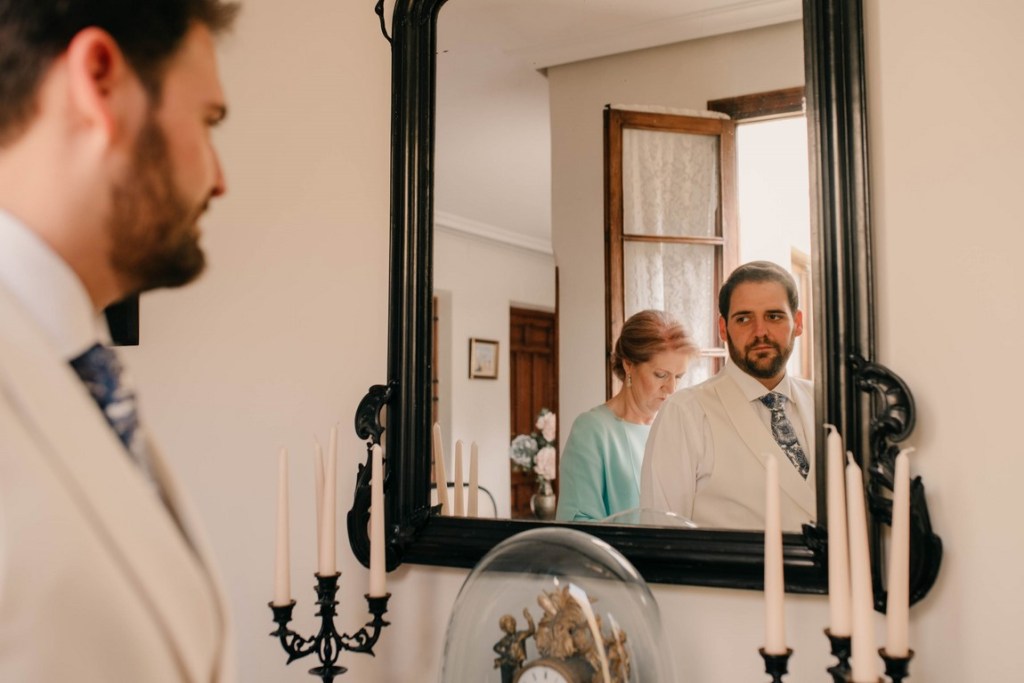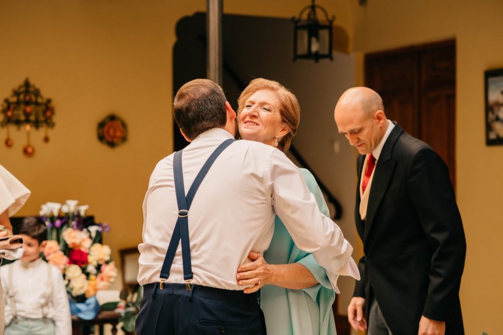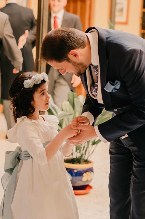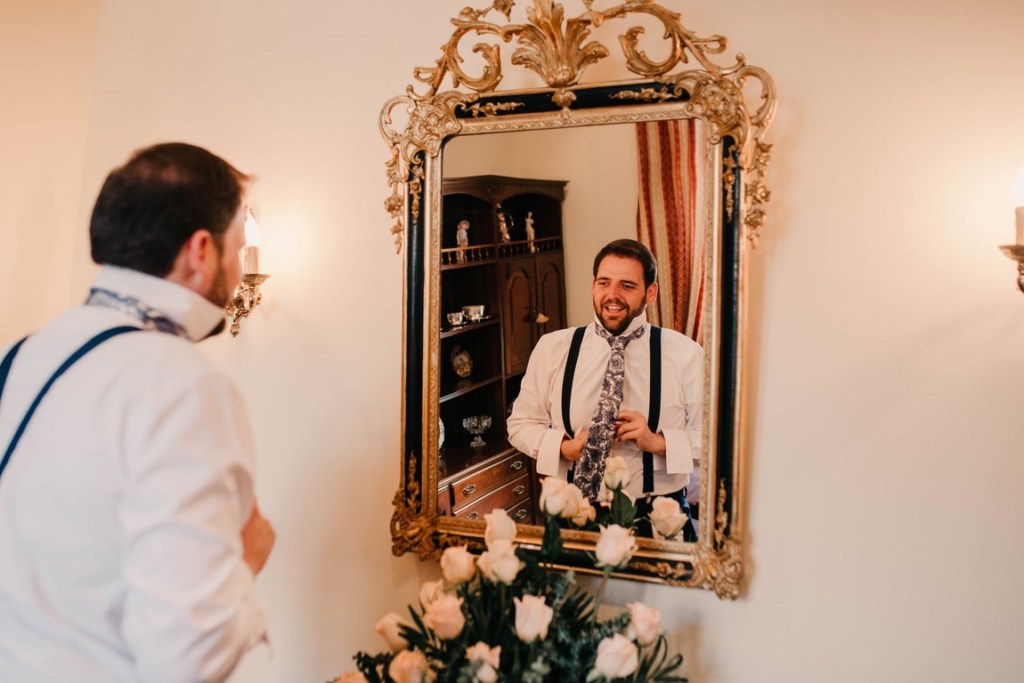 El día de la boda, la casa de Carlos era un ir y venir de invitados, que se iban agolpando en su enorme patio, mientras nosotros realizábamos el reportaje de fotos. Carlos eligió un chaqué azul, con una bonita corbata a juego.