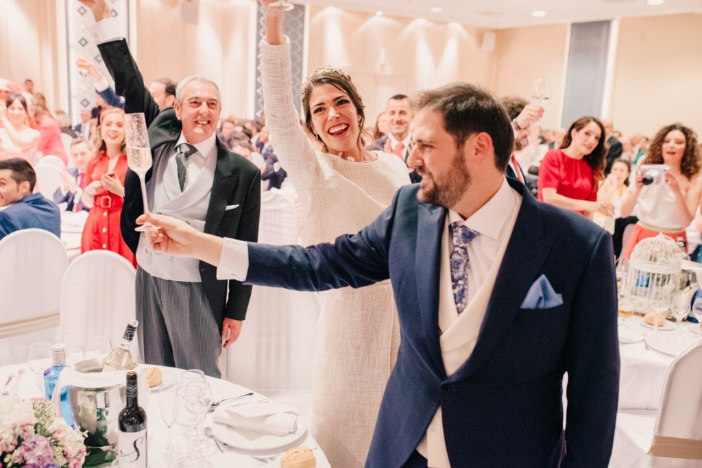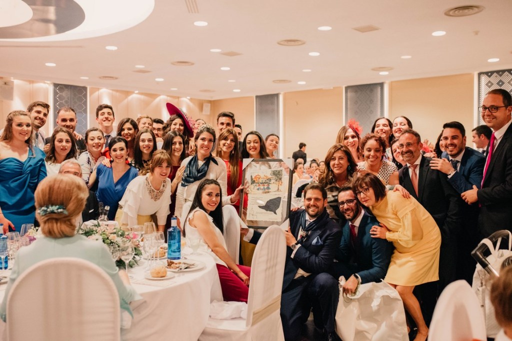 La celebración se llevó a cabo en los salones Cervantes, entre numerosas mesas y se sucedieron algunas sorpresas para los novios, que acabarían su gran día tras un cuidado baile y unos fuegos artificiales llenos de luz y color.