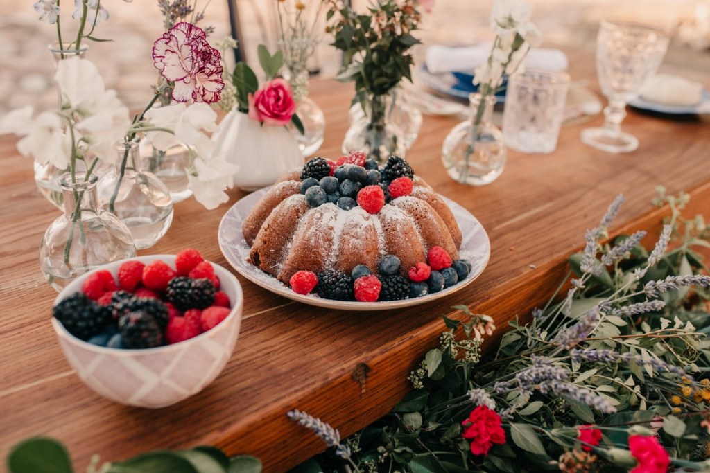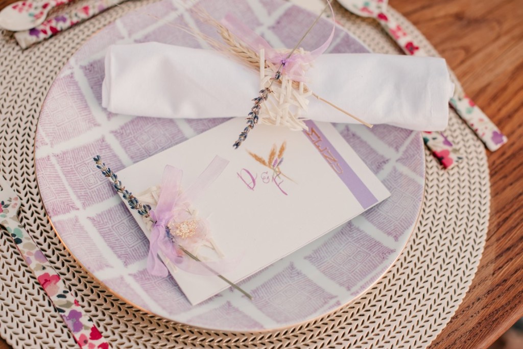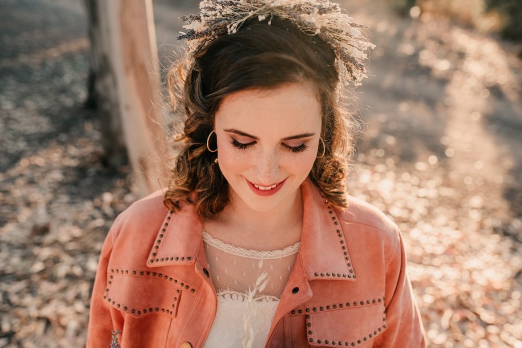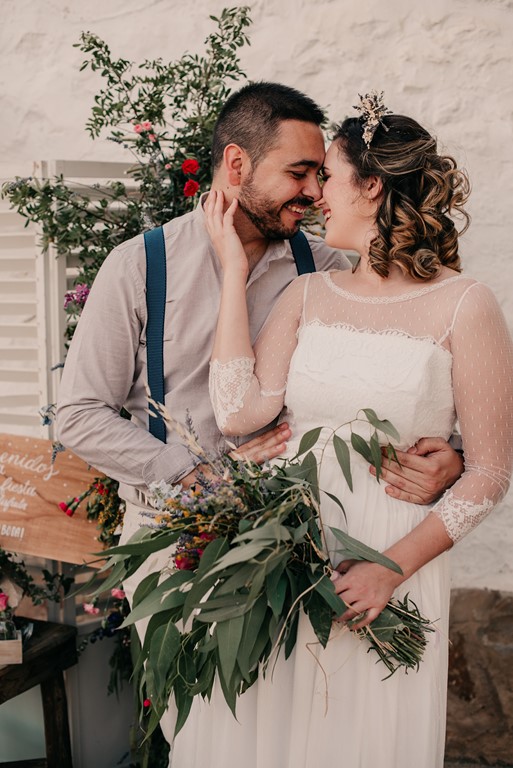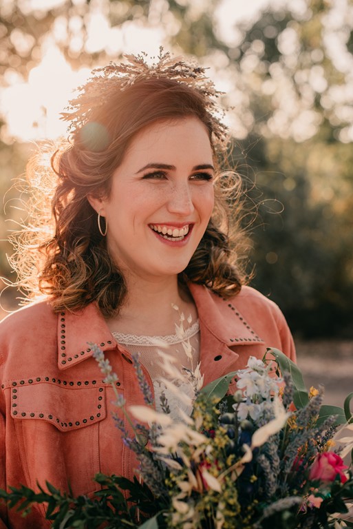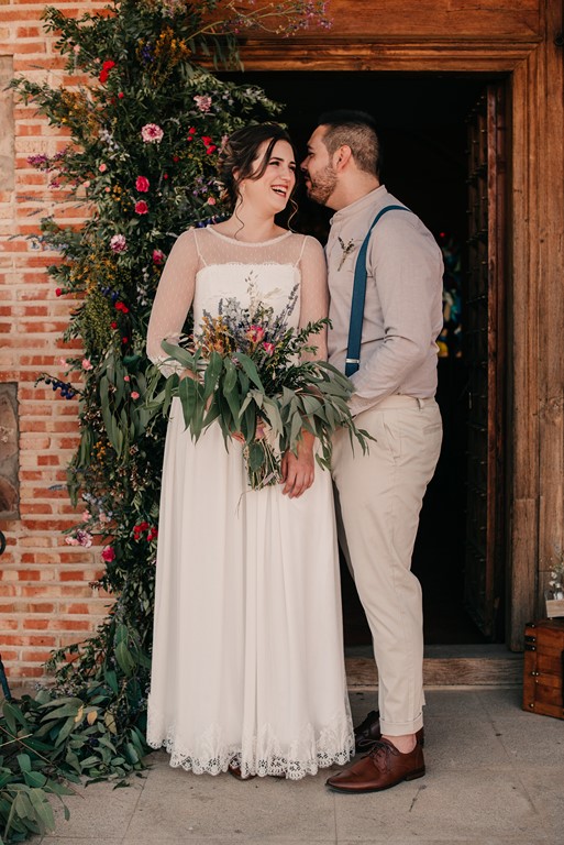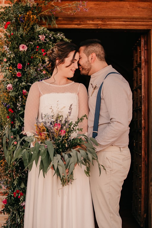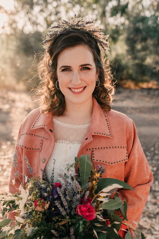 A nuestra novia particular la maquilló y la peinó Mercedes, de DobleEme, con un estilo muy natural, dejando ver sus inconfundibles pecas. Para la parte «más formal» de la sesión, le hizo un recogido bajo, adornado con un tocado de trigo y lavanda, a juego con el prendido del novio. Después, melena suelta y a bailar.