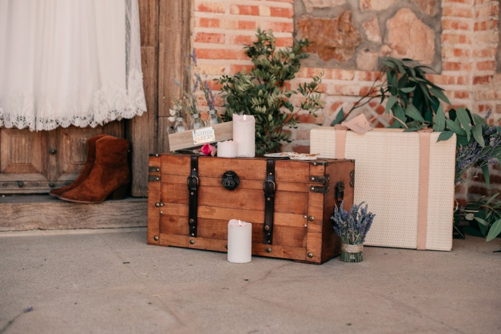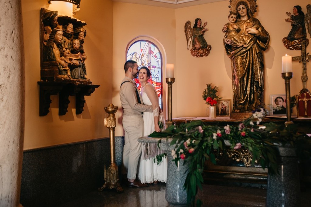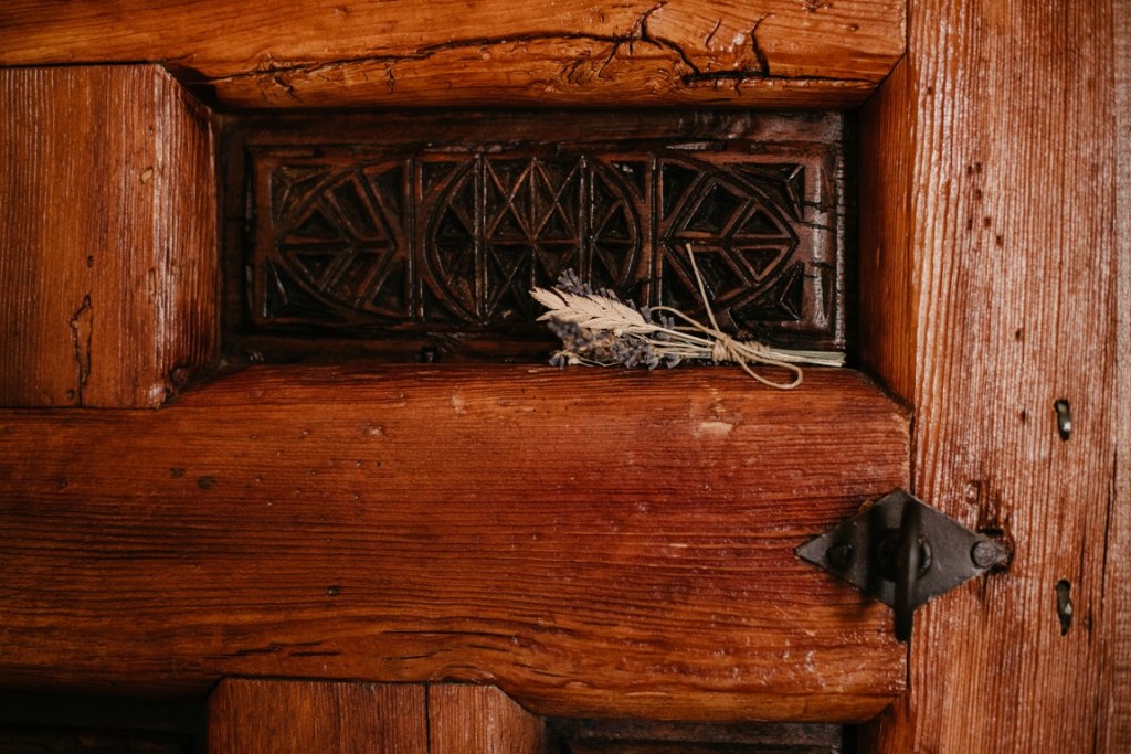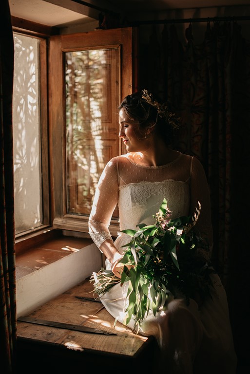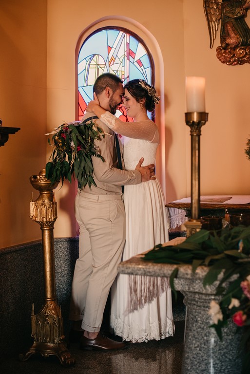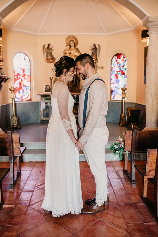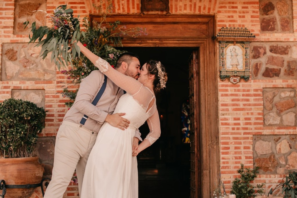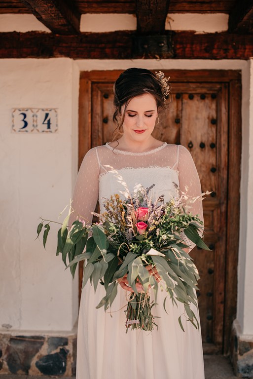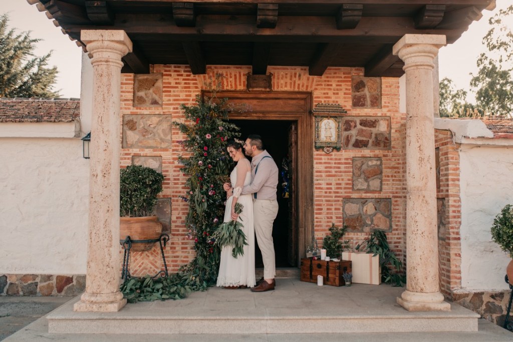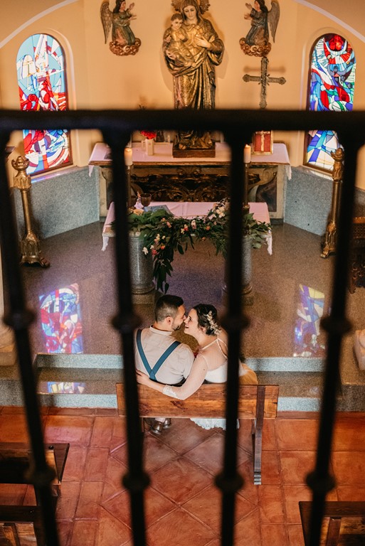Cristina decoró la coqueta y acogedora capilla de la finca de una manera preciosa, cargada de personalidad, así que decidimos aprovechar este rinconcito al máximo, pues no todas las fincas tienen esta posibilidad. La puerta estaba adornada con una columna de flores silvestres de todos los colores, y un bodegón de estilo vintage. En la mesa de altar, también se pusieron flores silvestres, entre ellas, eucalipto, bambú y lavanda. Además, nos dio mucho juego el coro, desde dónde realizamos unas fotografías preciosas.