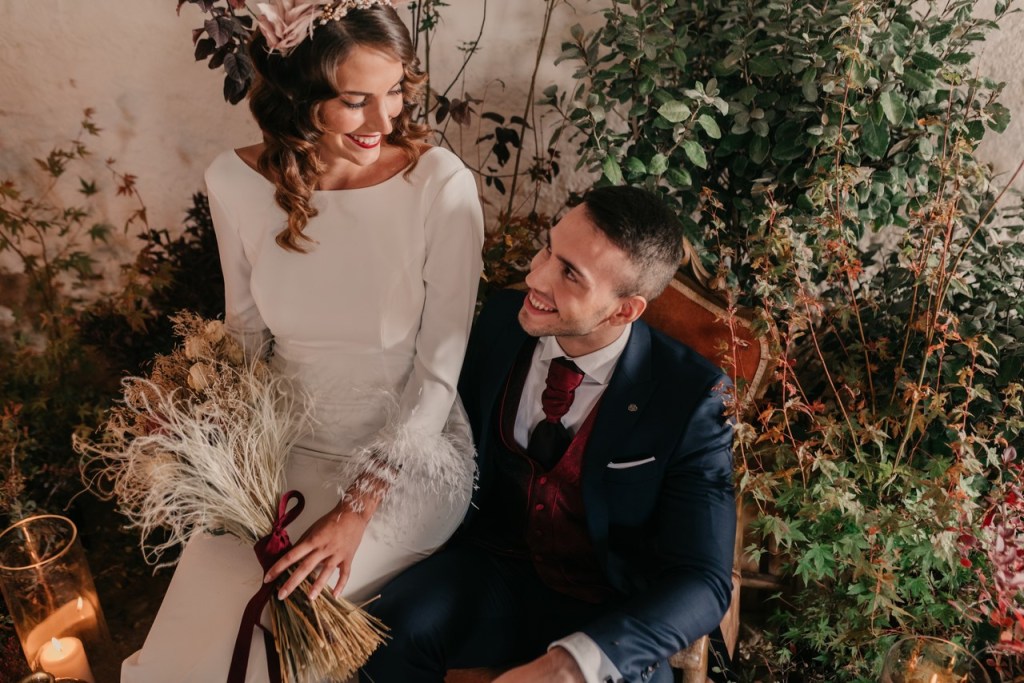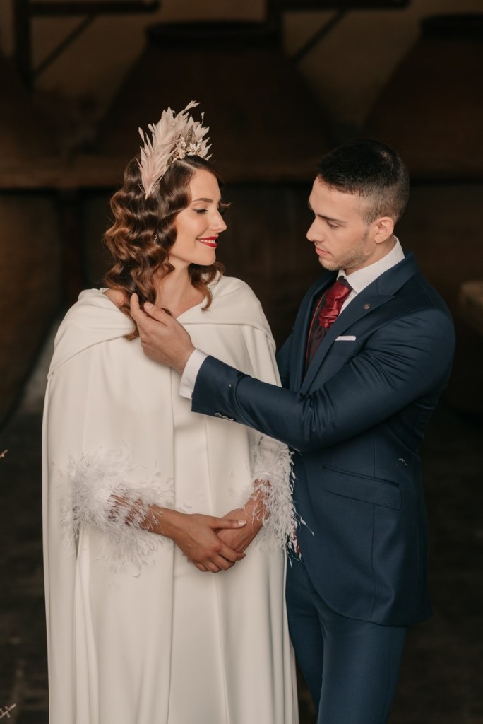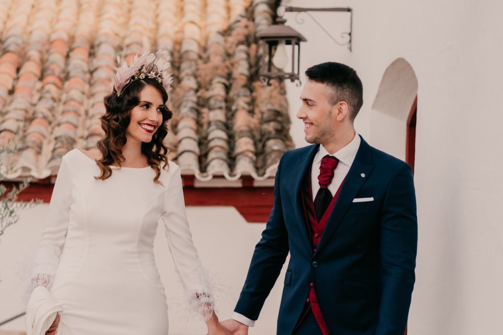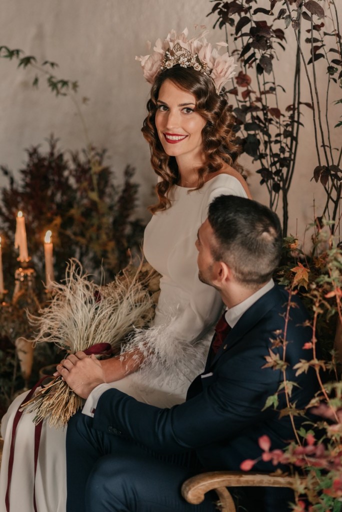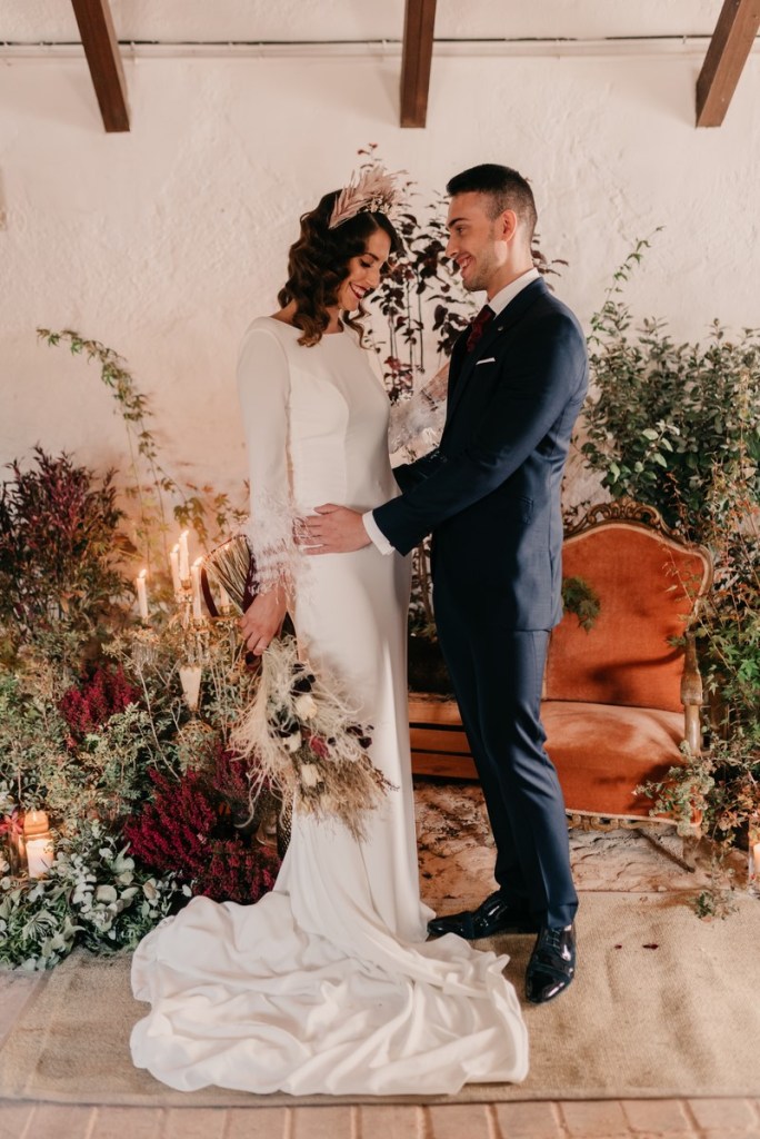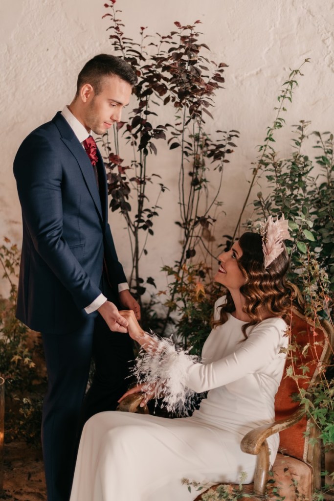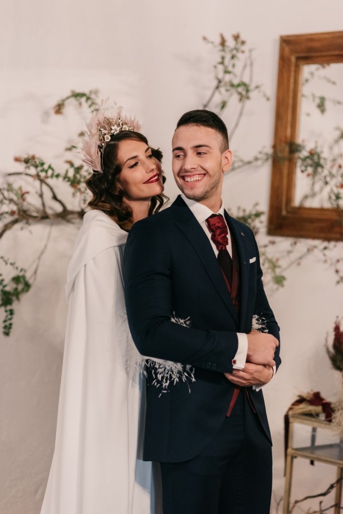 Al vestidazo de plumas y la capa de Rosa Clará, lo complementó un look espectacular, con un tocado también de plumas y pelo suelto, realizado por Ana de AyM Estilistas, y al que puso la guinda Laura con su buen hacer en el maquillaje, resaltando la belleza de una novia natural, a la que solo añadimos las sandalias de terciopelo granate de Fígara. A Gonzalo, lo vistieron los chicos de Félix Ramiro de Tomelloso, con un traje de corte clásico, y complementos en tonos también granates.