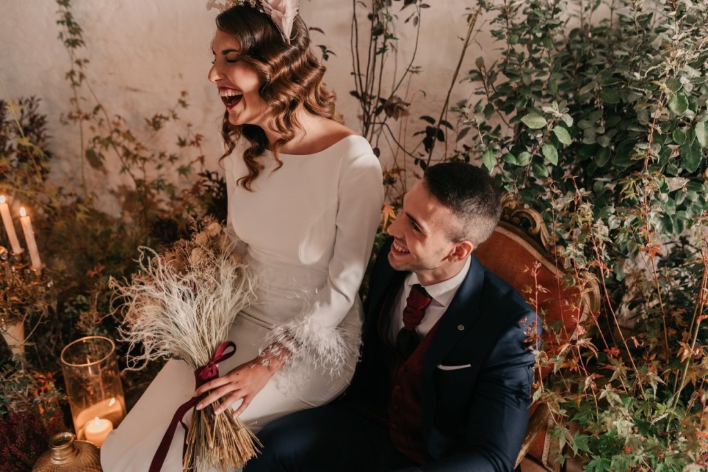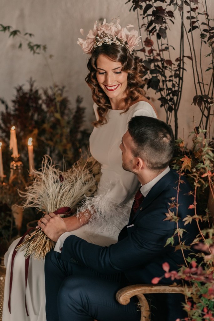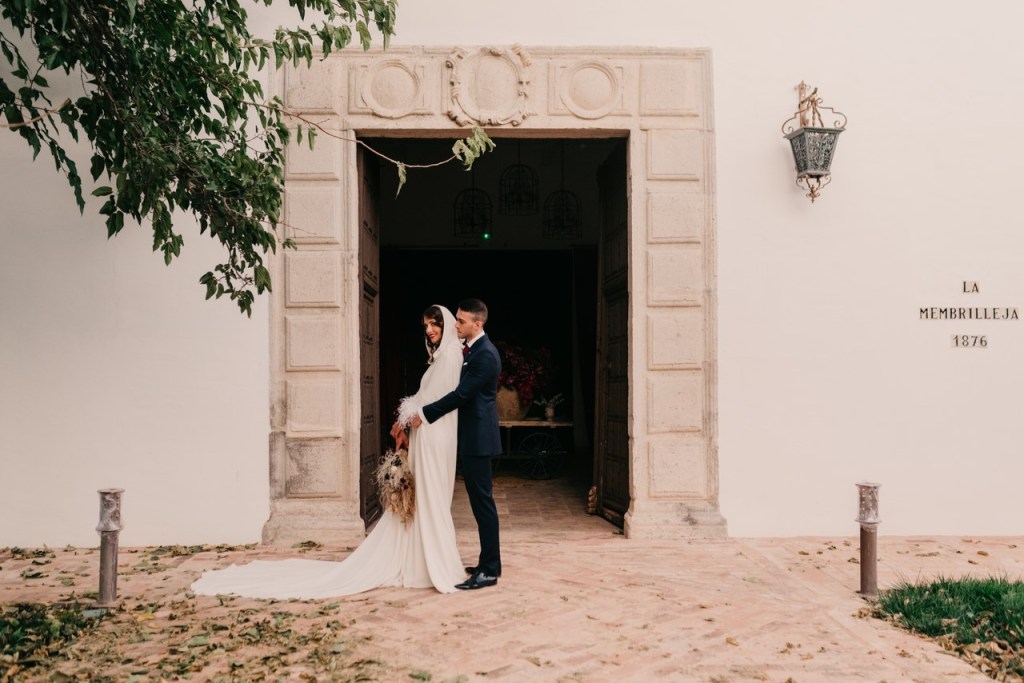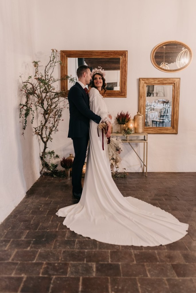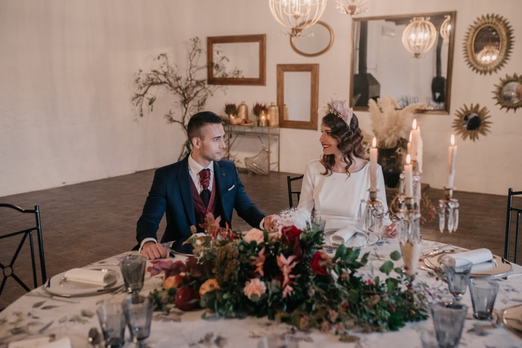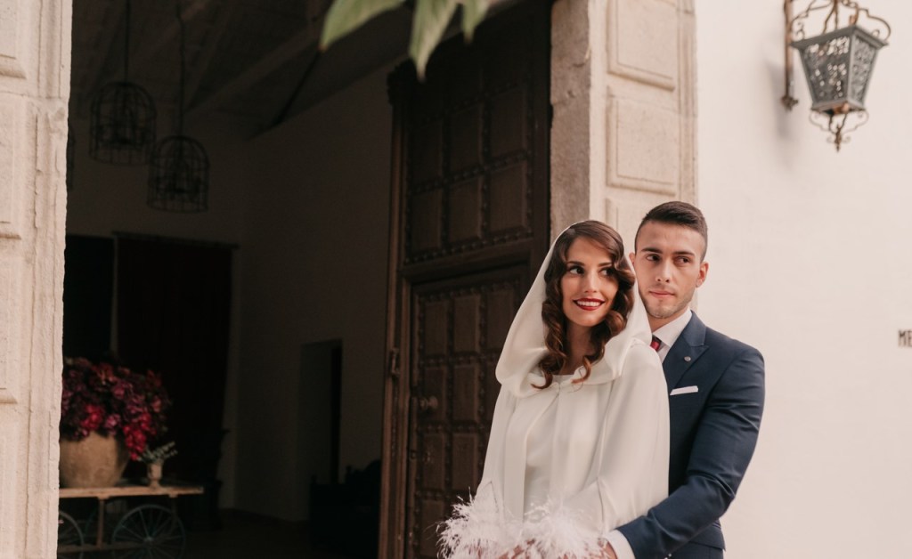 Al vestidazo de plumas y la capa de Rosa Clará, lo complementó un look espectacular, con un tocado también de plumas y pelo suelto, realizado por Ana de AyM Estilistas, y al que puso la guinda Laura con su buen hacer en el maquillaje, resaltando la belleza de una novia natural, a la que solo añadimos las sandalias de terciopelo granate de Fígara. A Gonzalo, lo vistieron los chicos de Félix Ramiro de Tomelloso, con un traje de corte clásico, y complementos en tonos también granates.