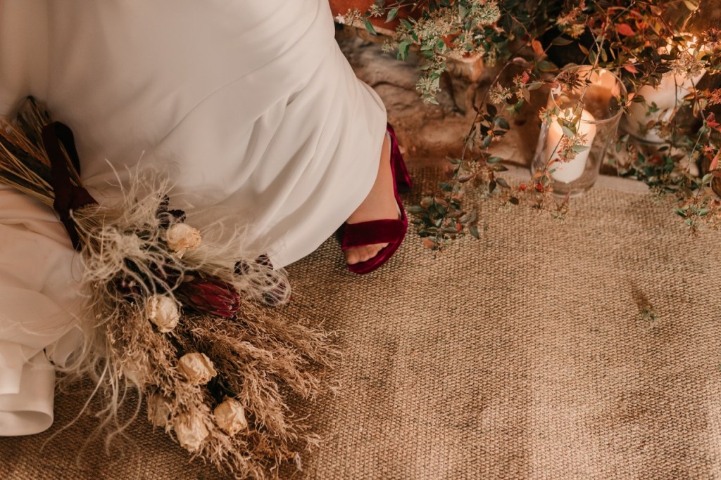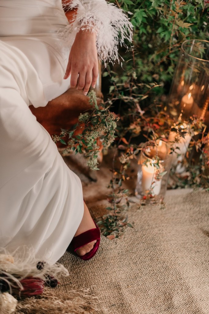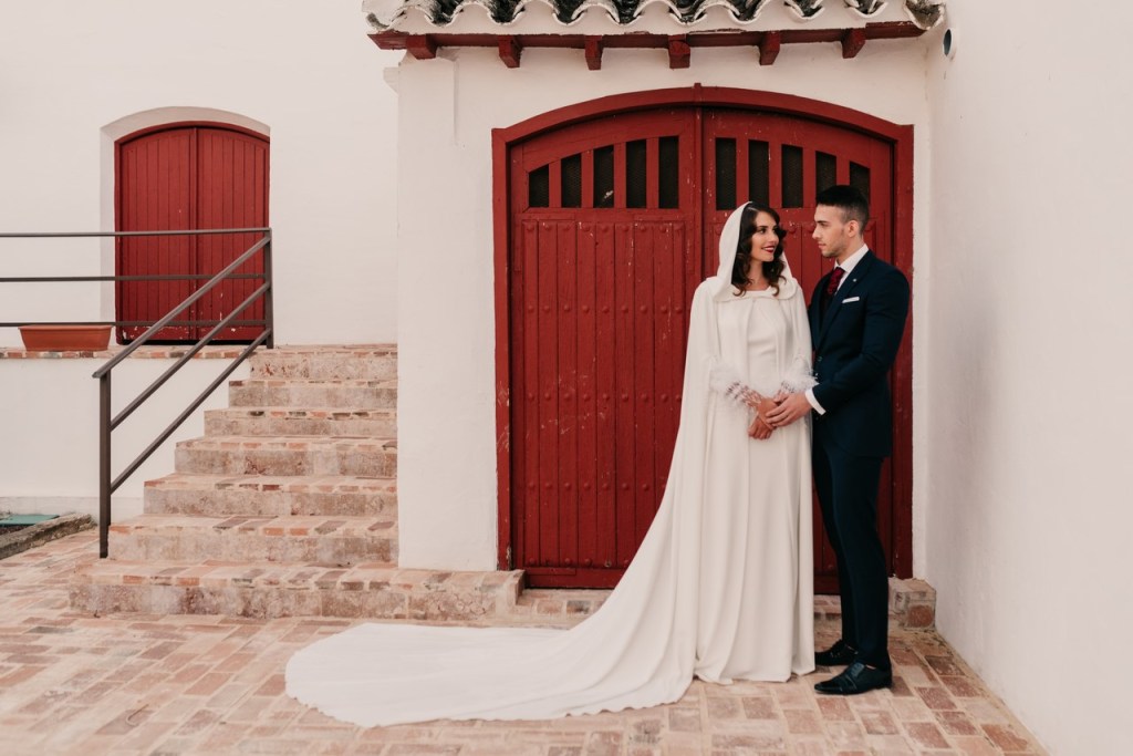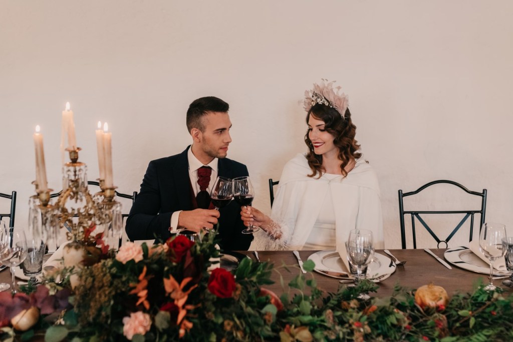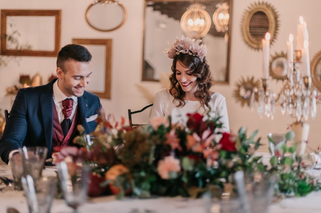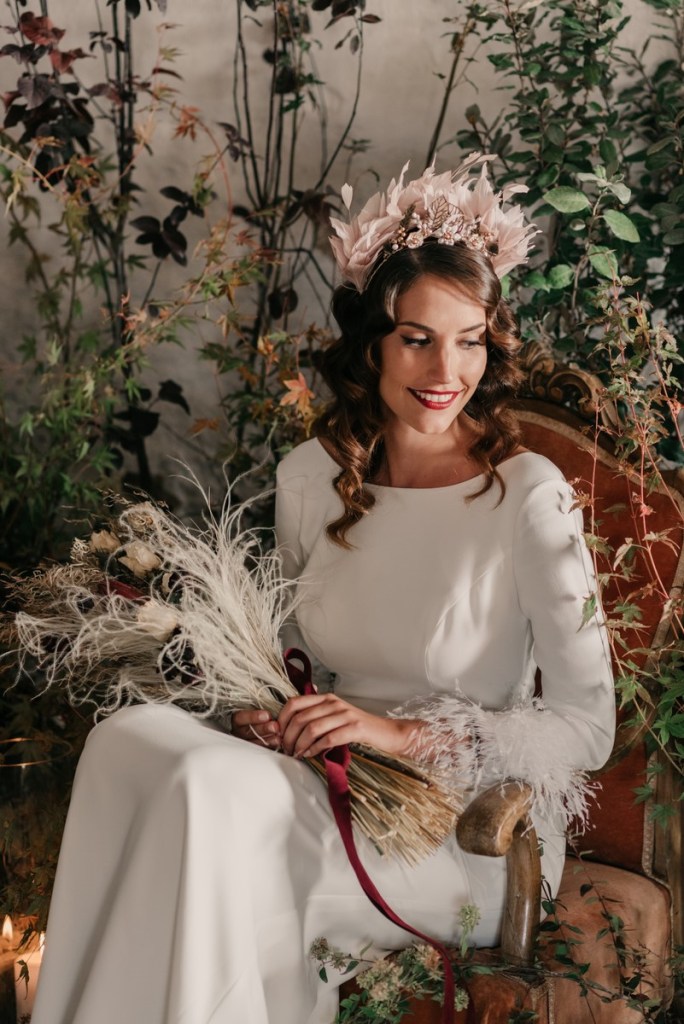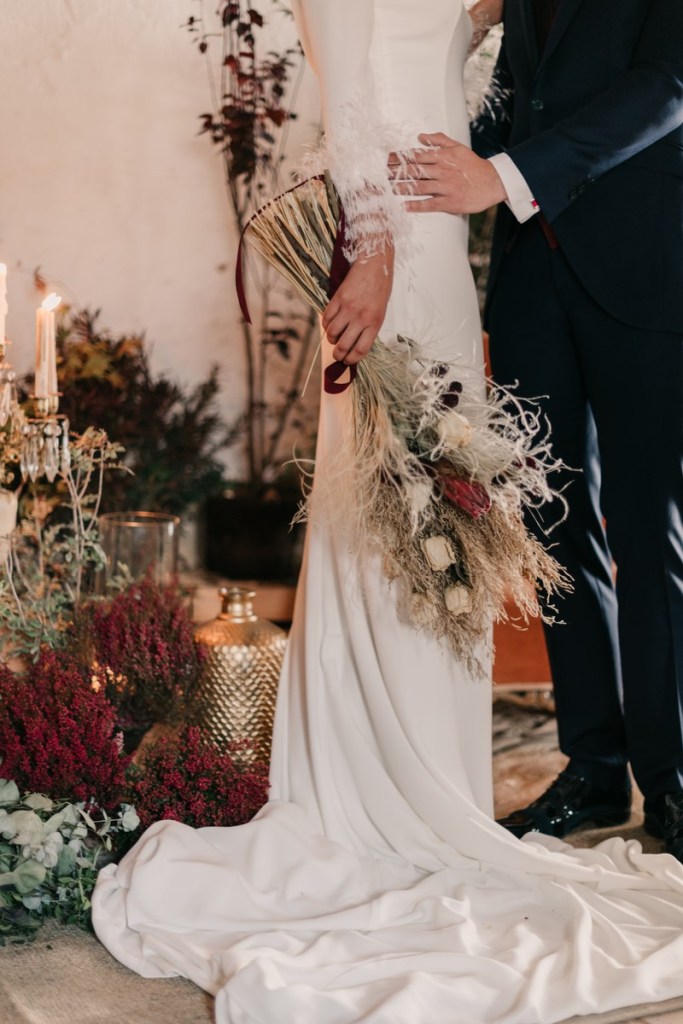 Al vestidazo de plumas y la capa de Rosa Clará, lo complementó un look espectacular, con un tocado también de plumas y pelo suelto, realizado por Ana de AyM Estilistas, y al que puso la guinda Laura con su buen hacer en el maquillaje, resaltando la belleza de una novia natural, a la que solo añadimos las sandalias de terciopelo granate de Fígara. A Gonzalo, lo vistieron los chicos de Félix Ramiro de Tomelloso, con un traje de corte clásico, y complementos en tonos también granates.