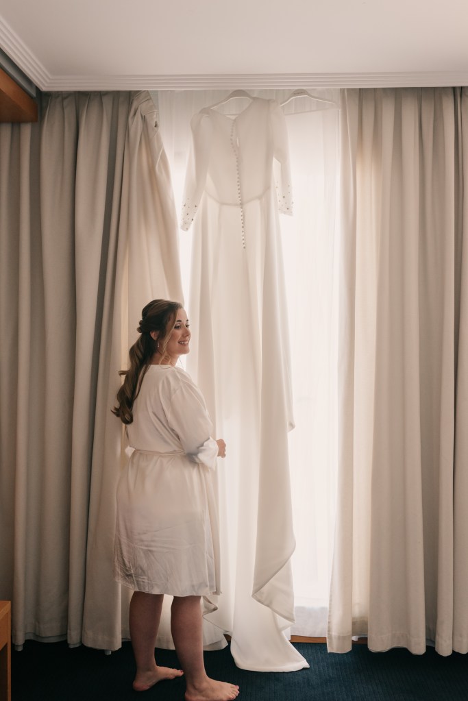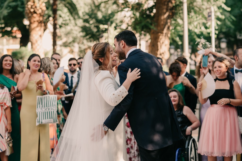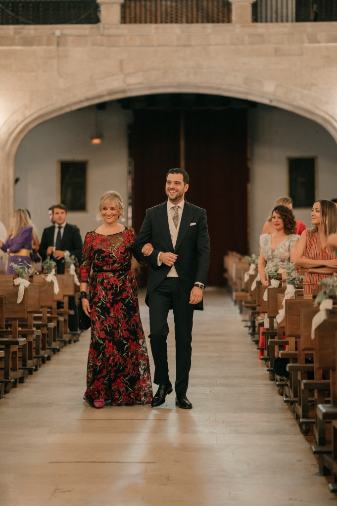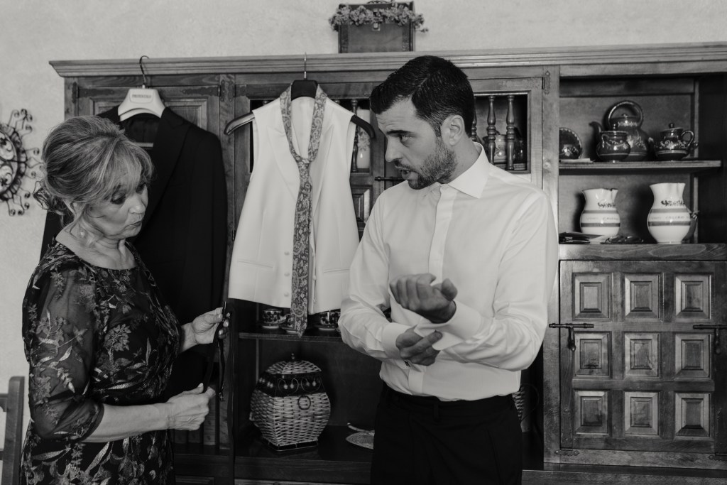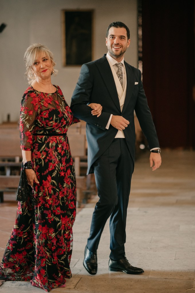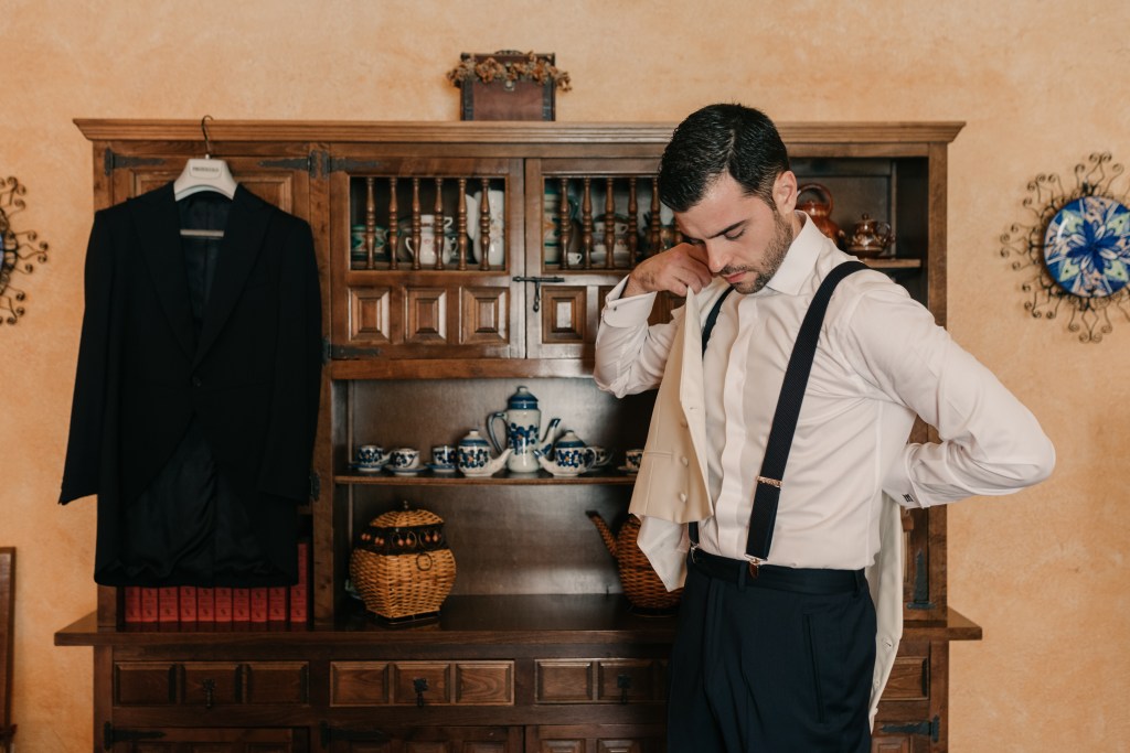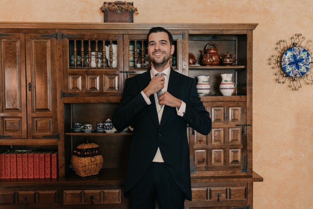 Jose se vistió en casa de sus padres, junto a ellos y a su hermano. Eligió un chaqué clásico de Protocolo Novios para la ocasión, en azul marino, con un bonito chaleco beige y una corbata llamativa en sus formas pero comedida en los tonos, con mucha personalidad.