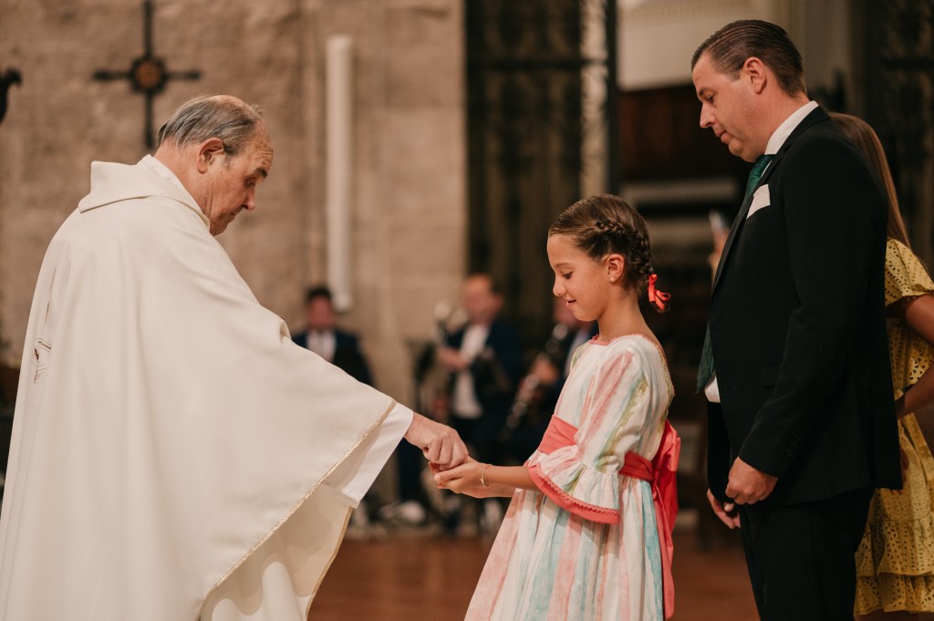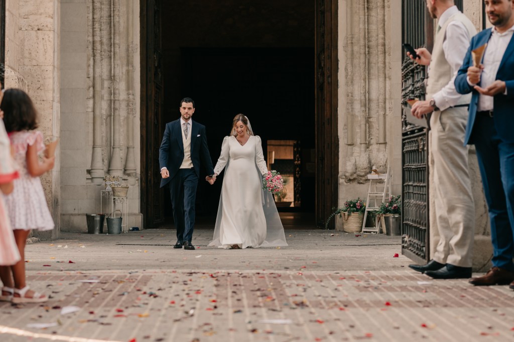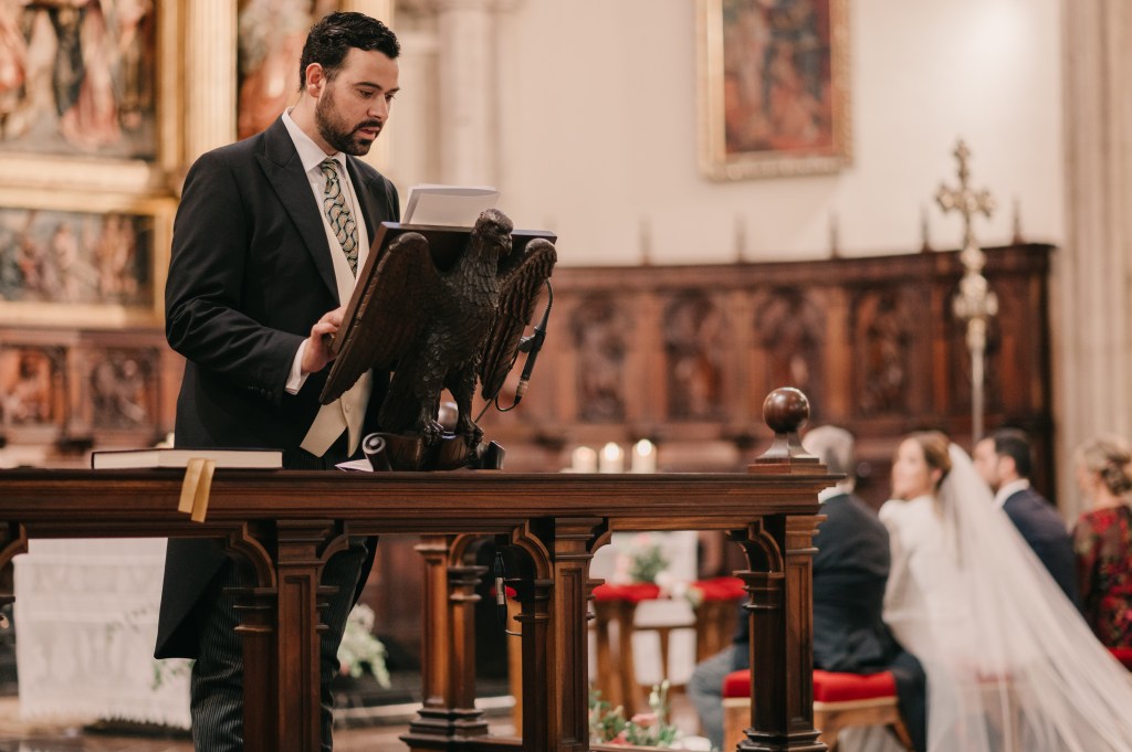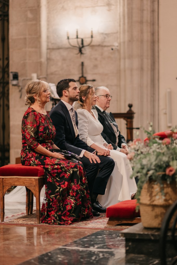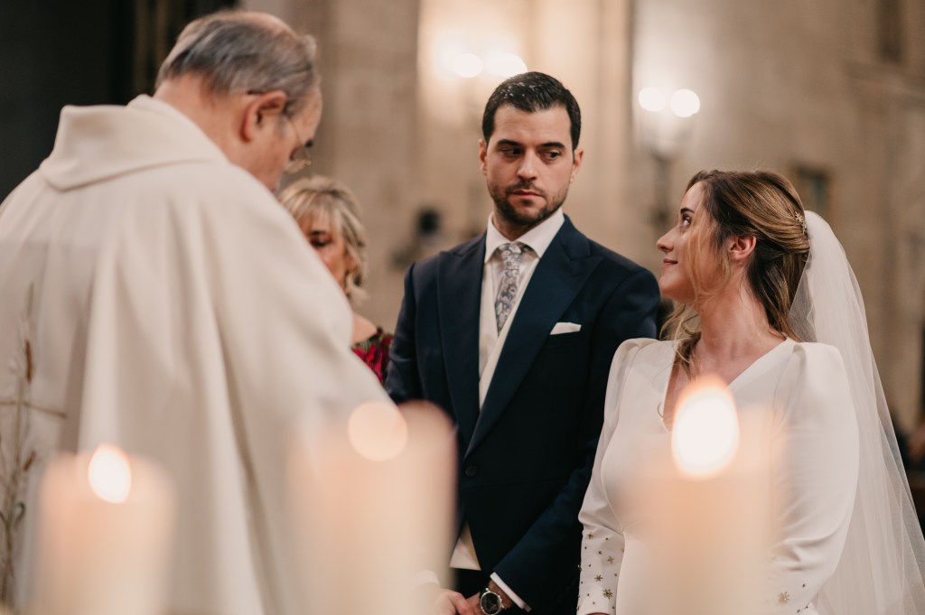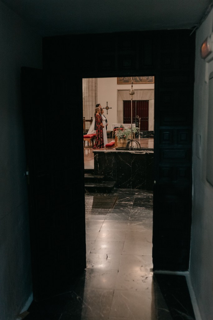 La clásica e imponente Catedral de Ciudad Real sería el lugar elegido para la ceremonia religiosa, a la que llegarían en primer lugar, los peques de la boda, con su especial protagonista. La banda sonora corrió a cargo del grupo Kairós Clarinet quién nos deleitó con piezas como la bso de El Señor de los Anillos o Let it be entre otros.