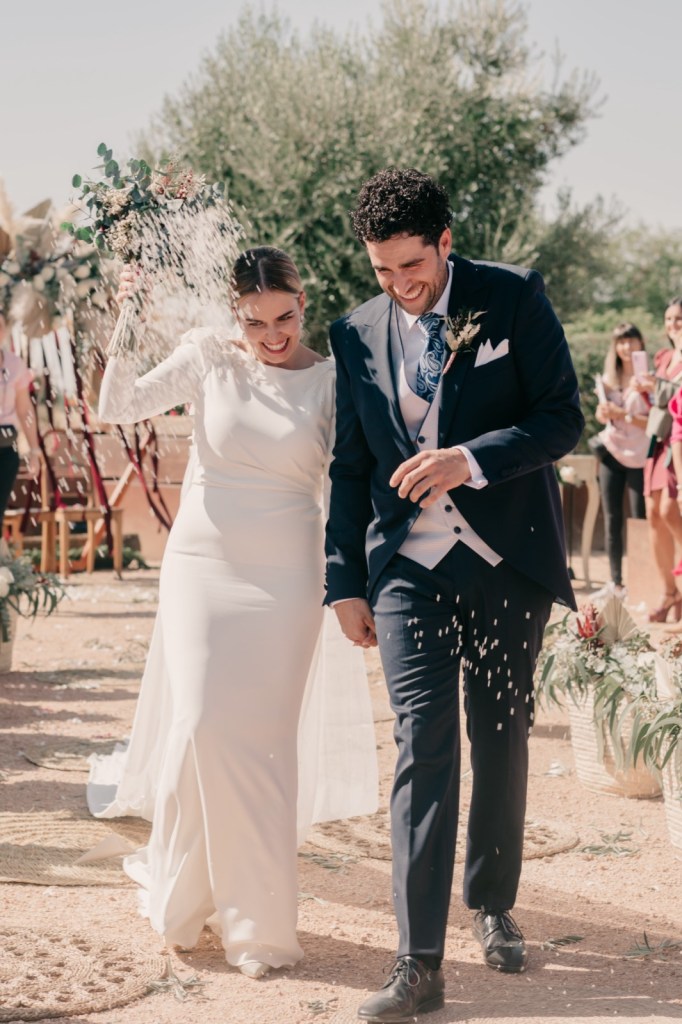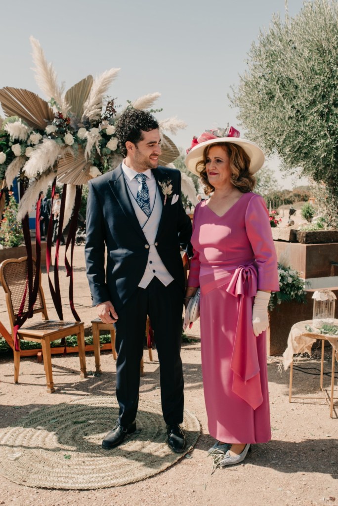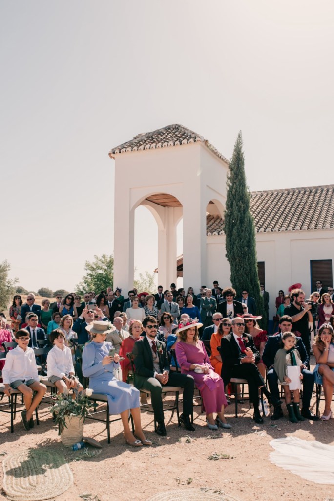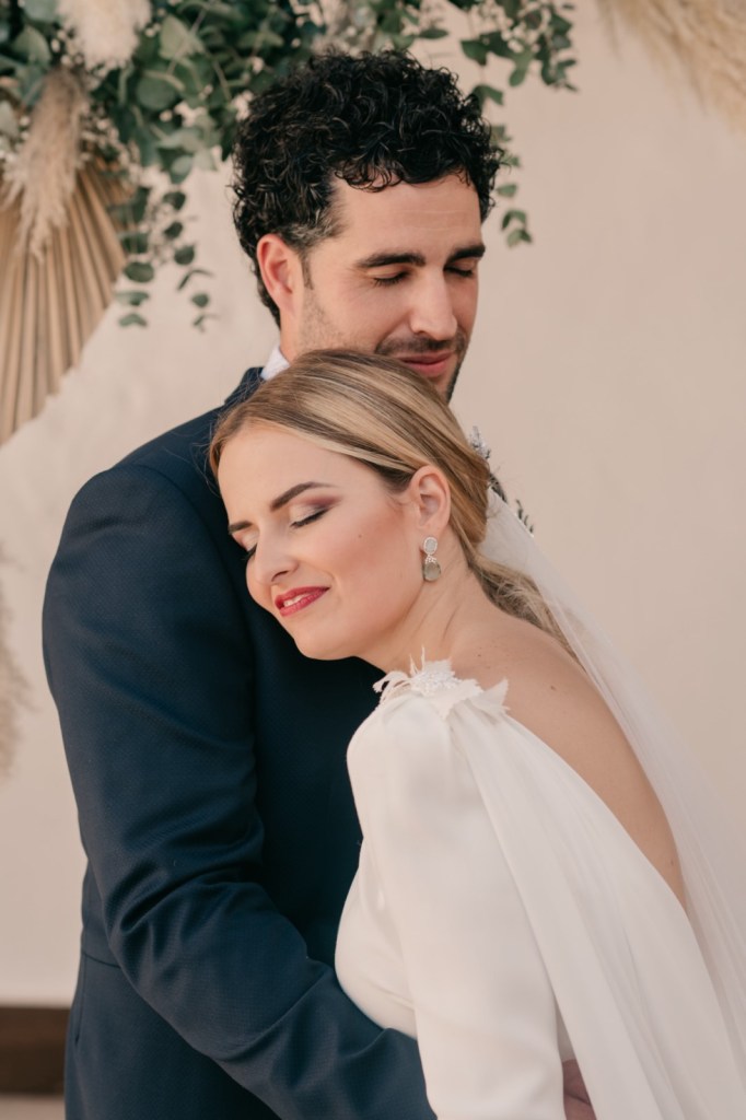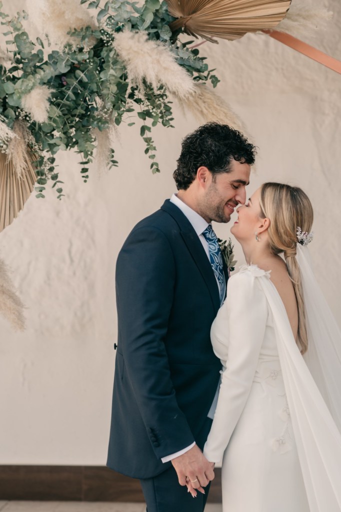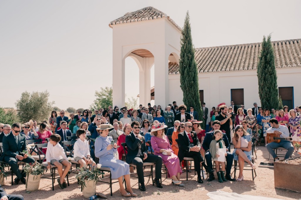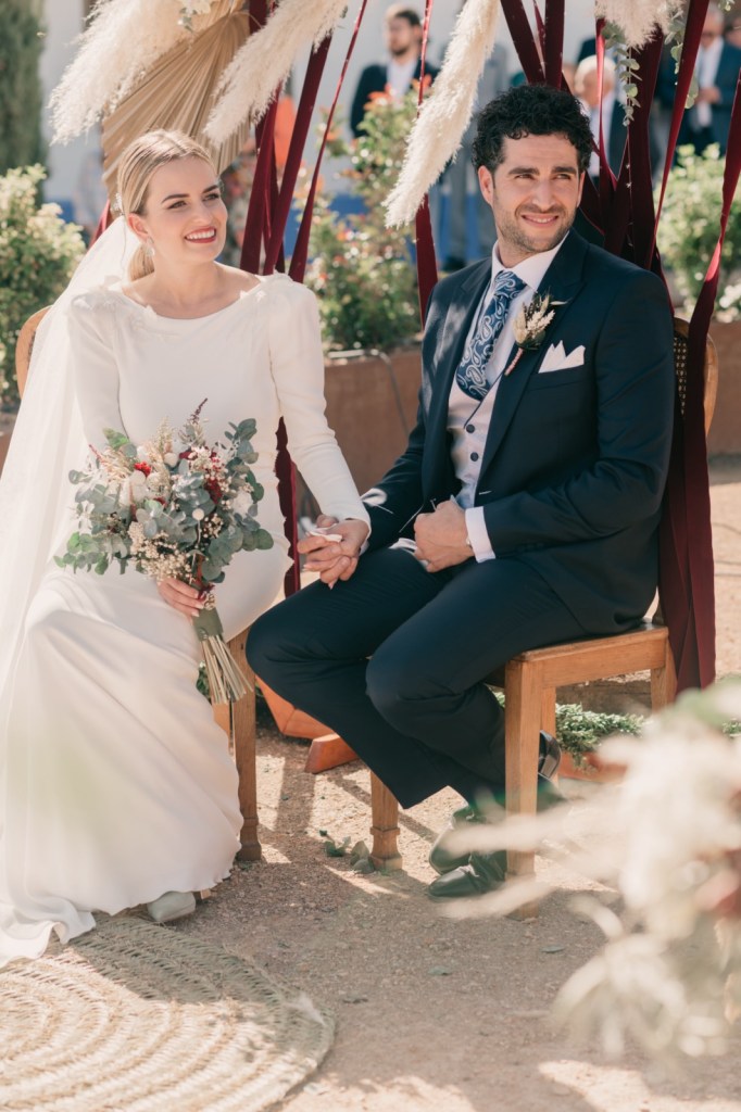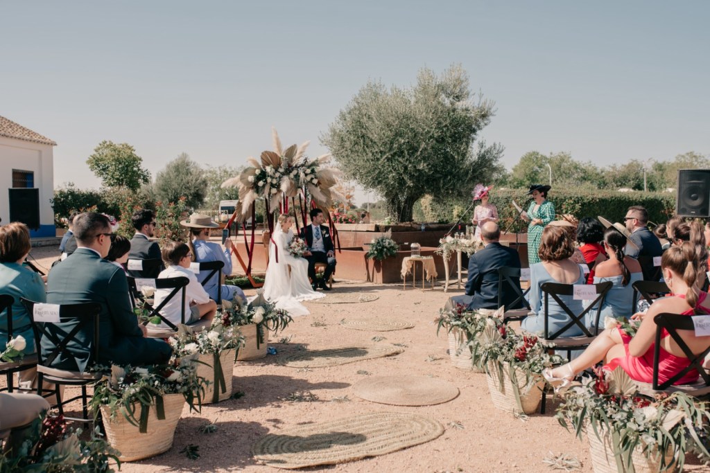 La ceremonia fue muy cuidada por el equipo de Margo Wedding Planner , así como el resto del evento. Tuvo lugar en un entorno precioso, con la antigua ermita de la finca de fondo, y no faltaron las flores. El pasillo, que adornaban unas alfombras de yute, estaba repleto de capazos con eucalipto y distintos tipos de ramas, mientras que a los novios les albergaba una bonita composición octogonal con pampas, palma y eucalipto, que luego se aprovecharía también para su sesión de pareja. Entre lágrimas de emoción y risas, los discursos se iban desarrollando.