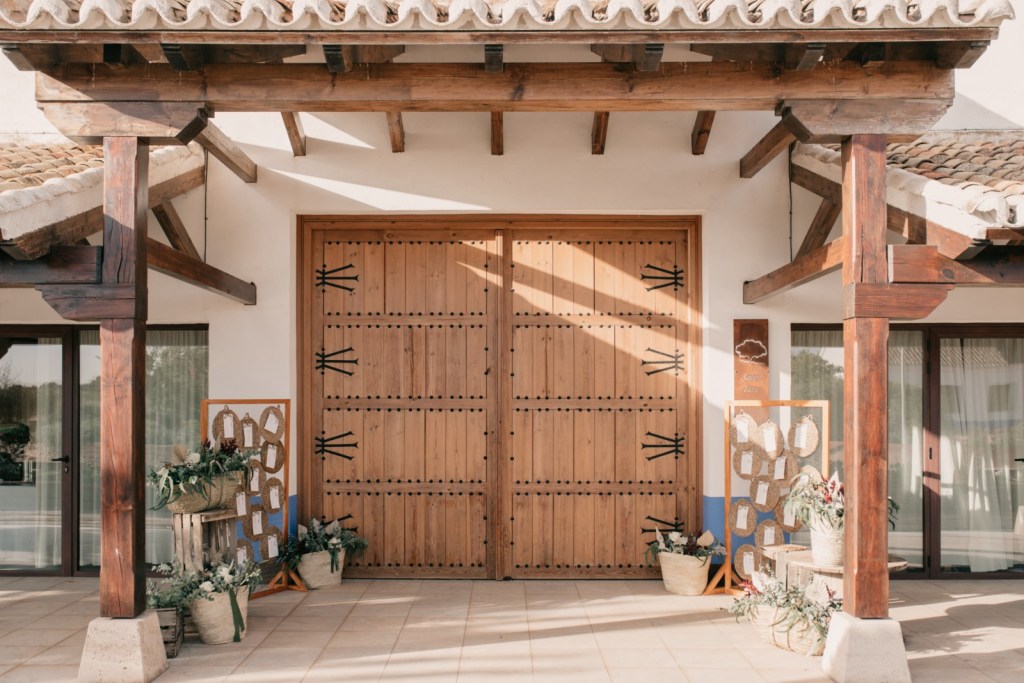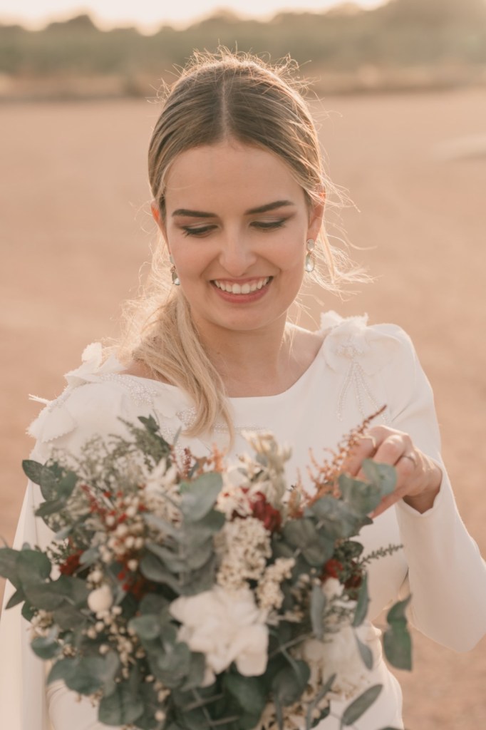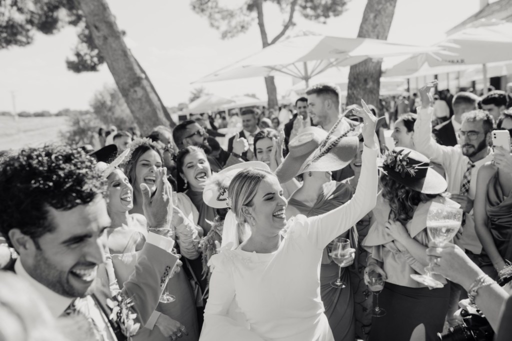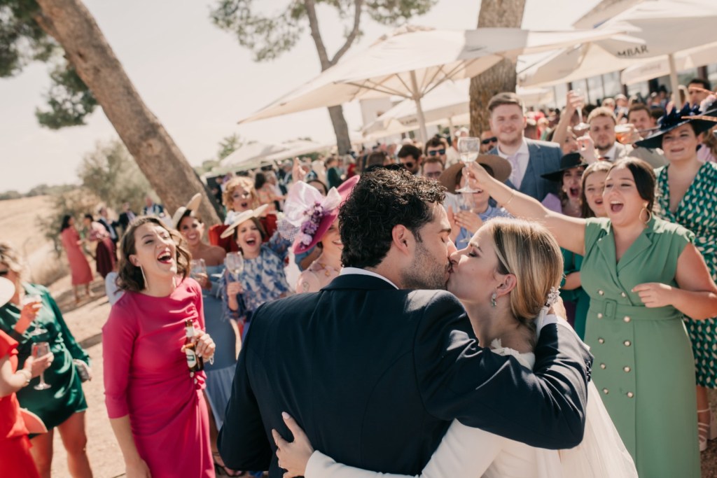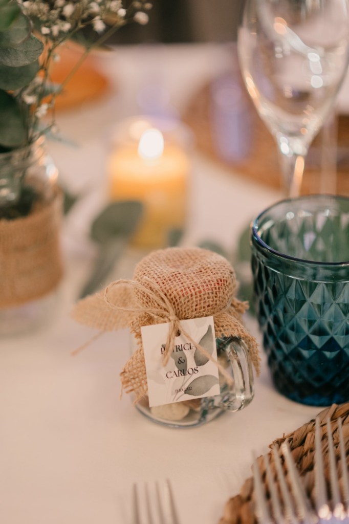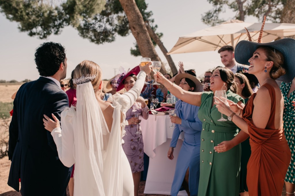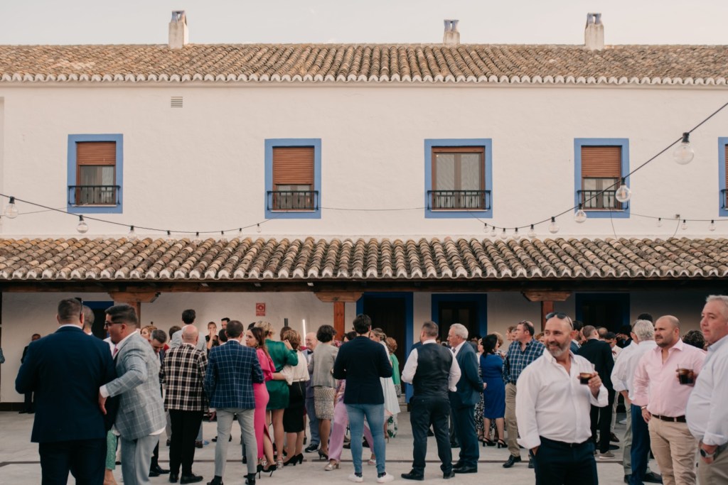 La ceremonia fue muy cuidada por el equipo de Margo Wedding Planner , así como el resto del evento. Tuvo lugar en un entorno precioso, con la antigua ermita de la finca de fondo, y no faltaron las flores. El pasillo, que adornaban unas alfombras de yute, estaba repleto de capazos con eucalipto y distintos tipos de ramas, mientras que a los novios les albergaba una bonita composición octogonal con pampas, palma y eucalipto, que luego se aprovecharía también para su sesión de pareja. Entre lágrimas de emoción y risas, los discursos se iban desarrollando.