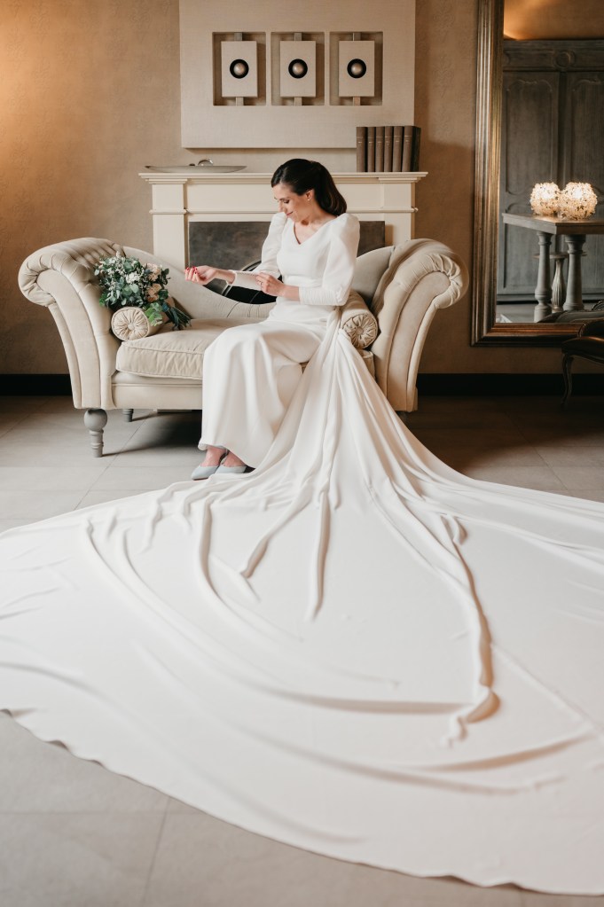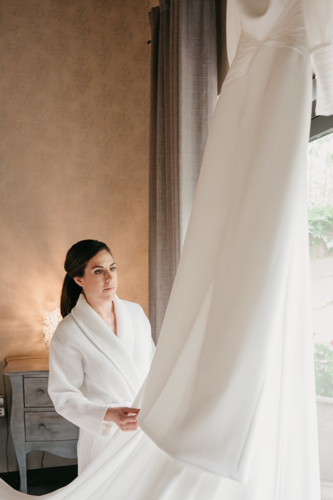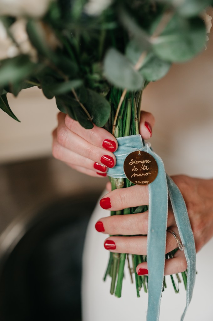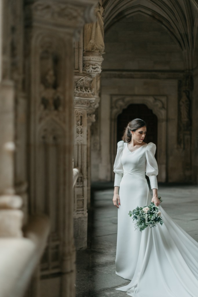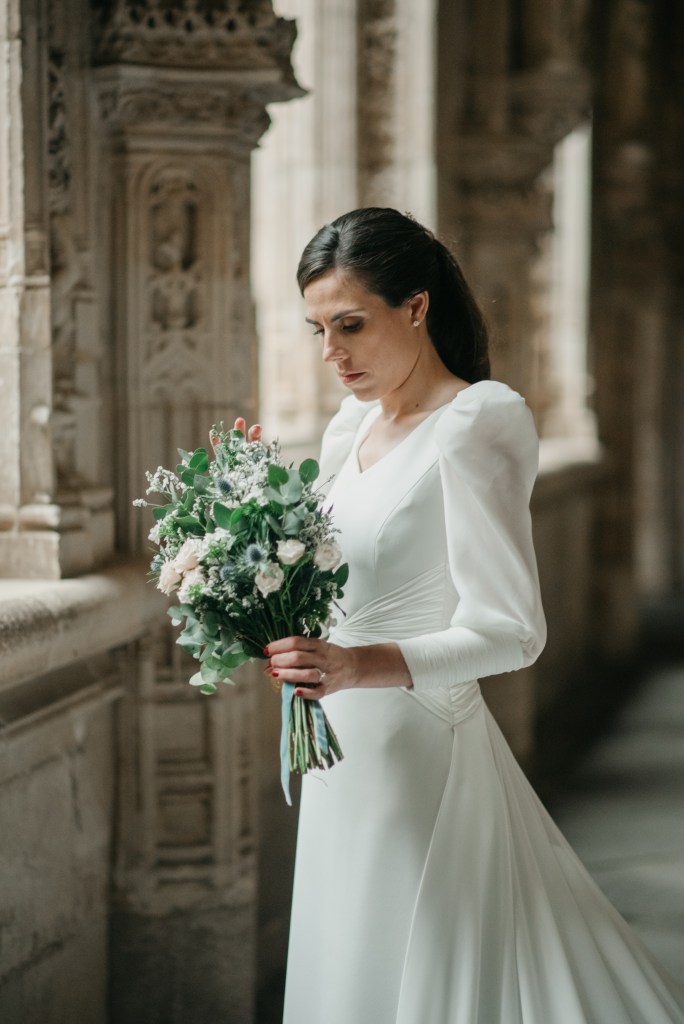 Por su parte, Ana, eligió una de las habitaciones del Cigarral para enfundarse su Valenzuela Atelier de elegante manga y una impresionante cola y sus zapatos de Uniq en tono azul clarito. Del recogido de su pelo se encargó Cristina Sánchez y su ramo de rosas rosas, cardos y eucalipto entre otros, fue obra de Deco Flor Toledo.