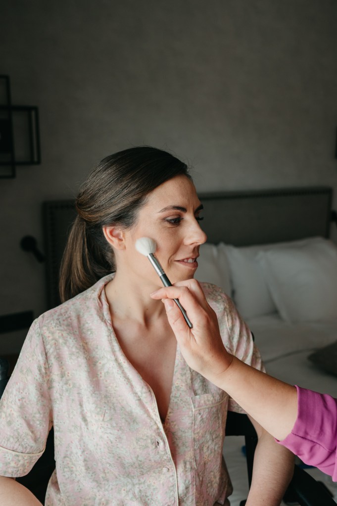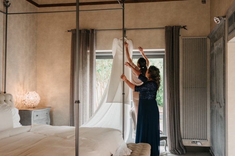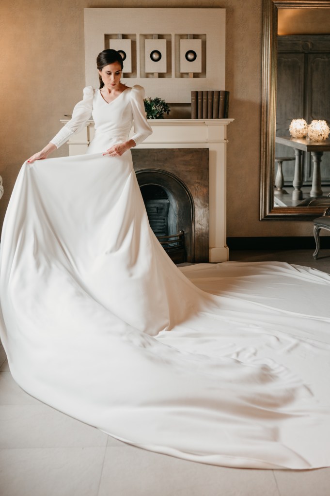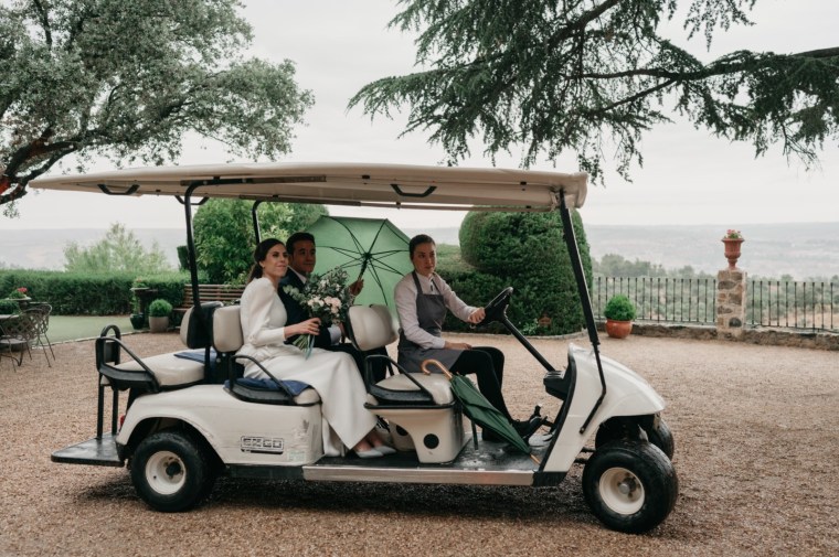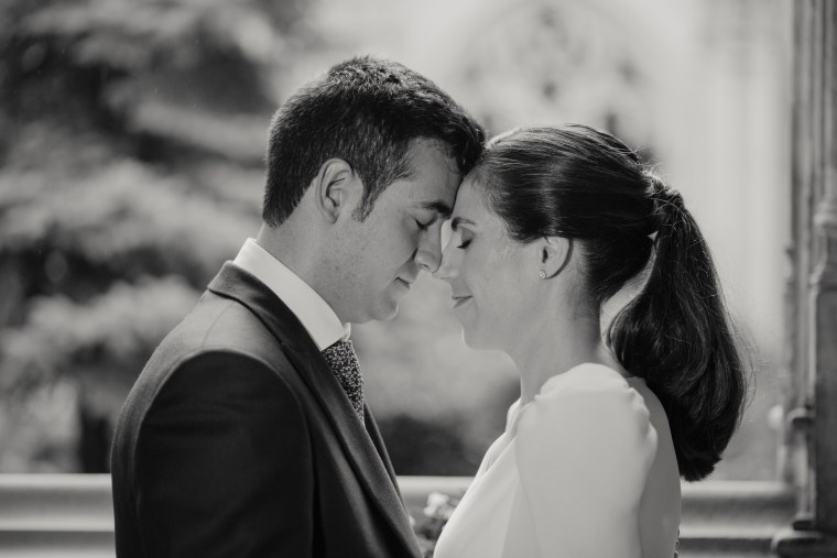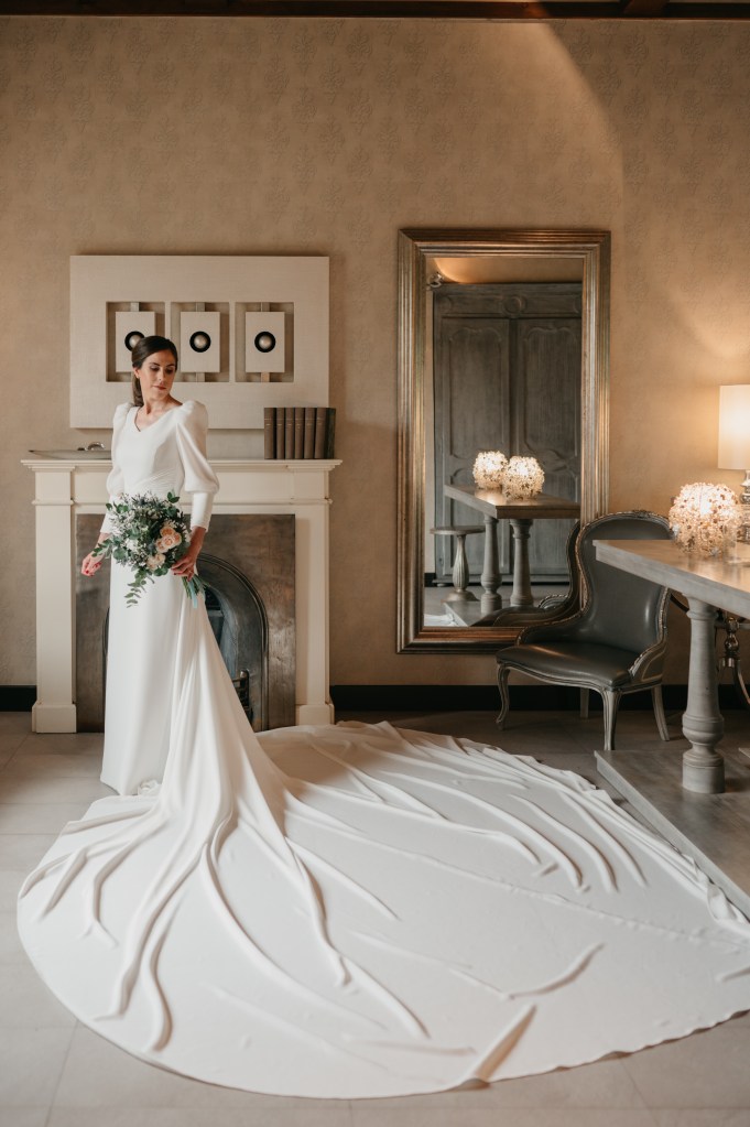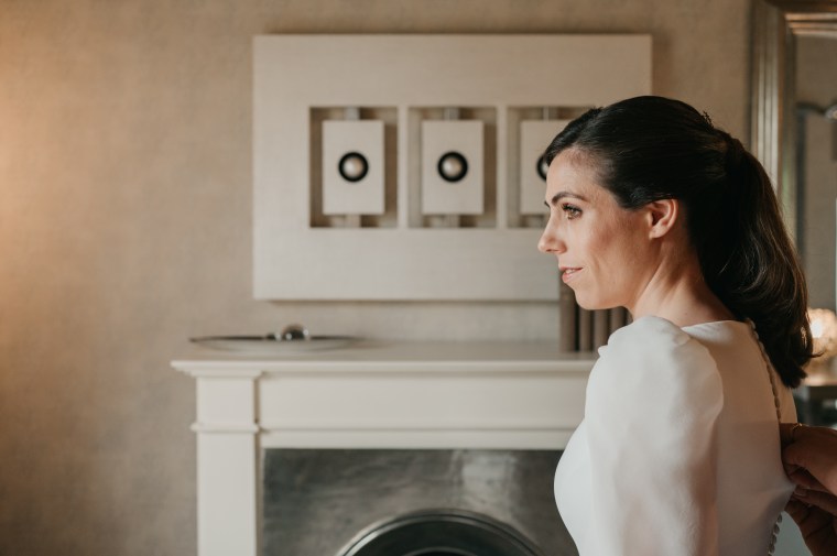 Por su parte, Ana, eligió una de las habitaciones del Cigarral para enfundarse su Valenzuela Atelier de elegante manga y una impresionante cola y sus zapatos de Uniq en tono azul clarito. Del recogido de su pelo se encargó Cristina Sánchez y su ramo de rosas rosas, cardos y eucalipto entre otros, fue obra de Deco Flor Toledo.