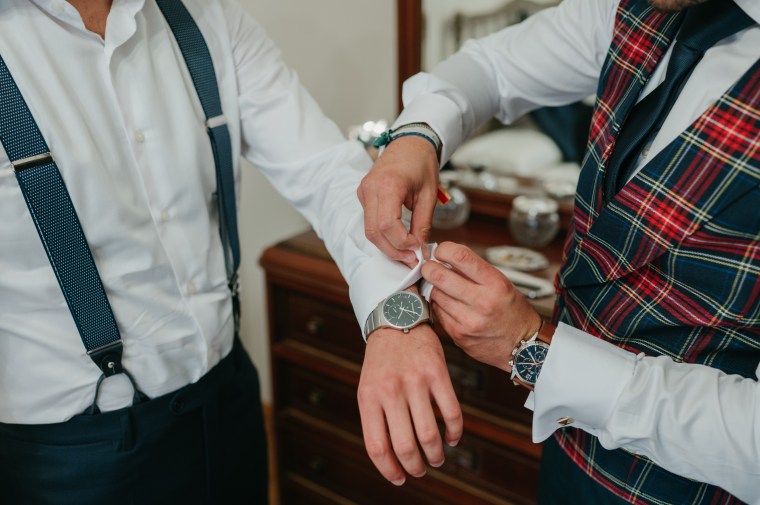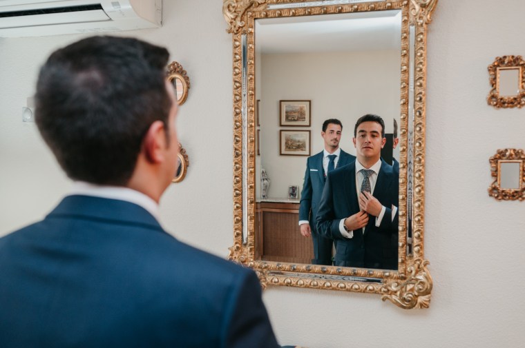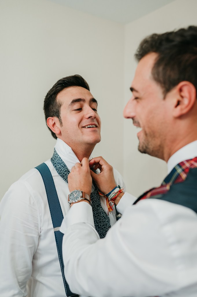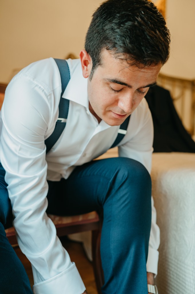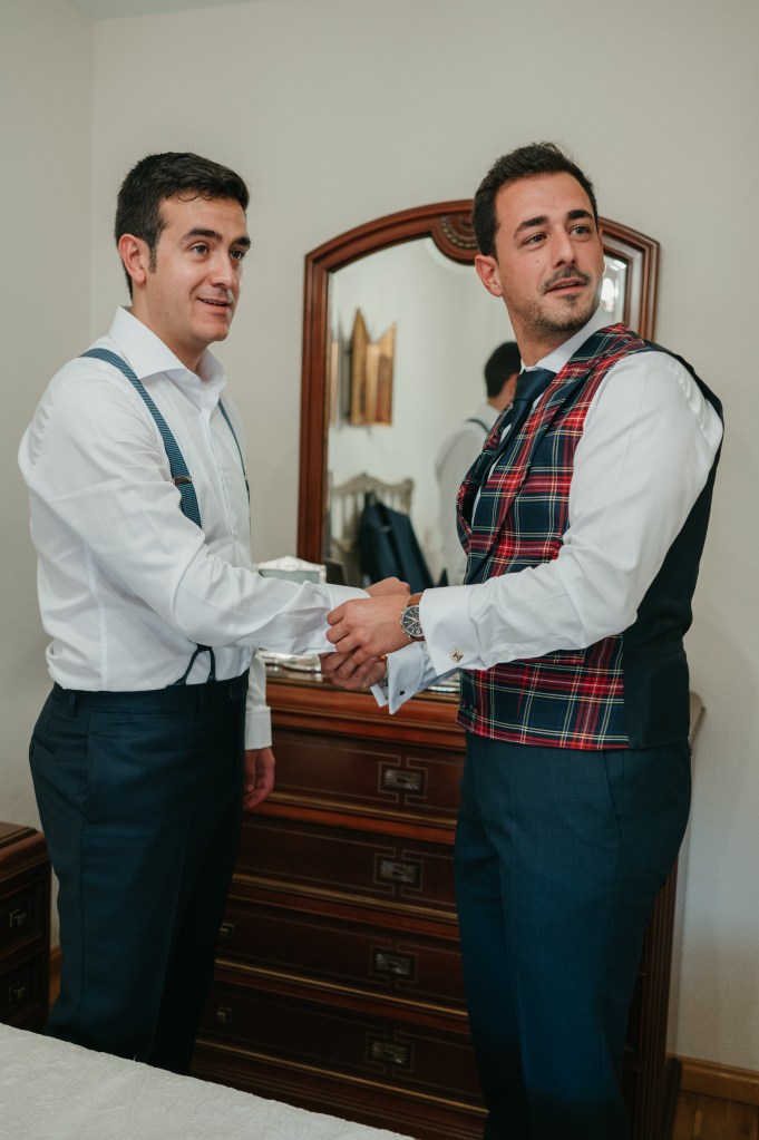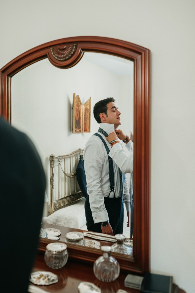 Comenzamos el día con los preparativos de ambos. Pedro lucía un traje oscuro a juego con su corbata, y chaleco en tono beige clarito, de la Sastrería Julián Muñoz. Se vistió en el domicilio familiar, ayudado de sus padres y hermano.