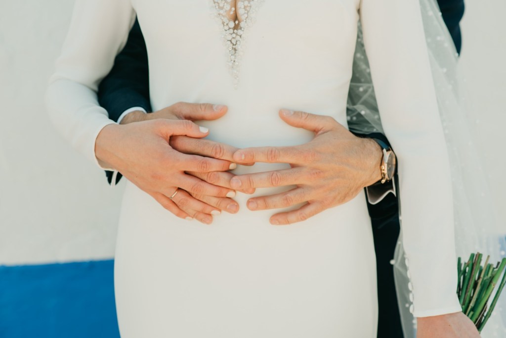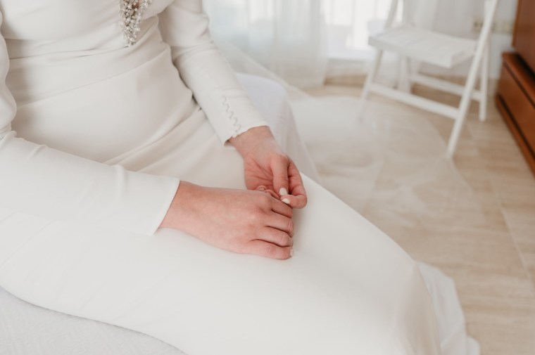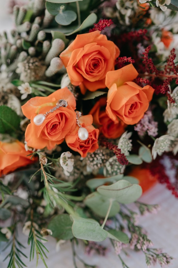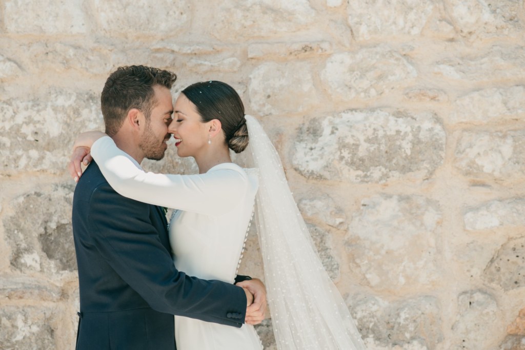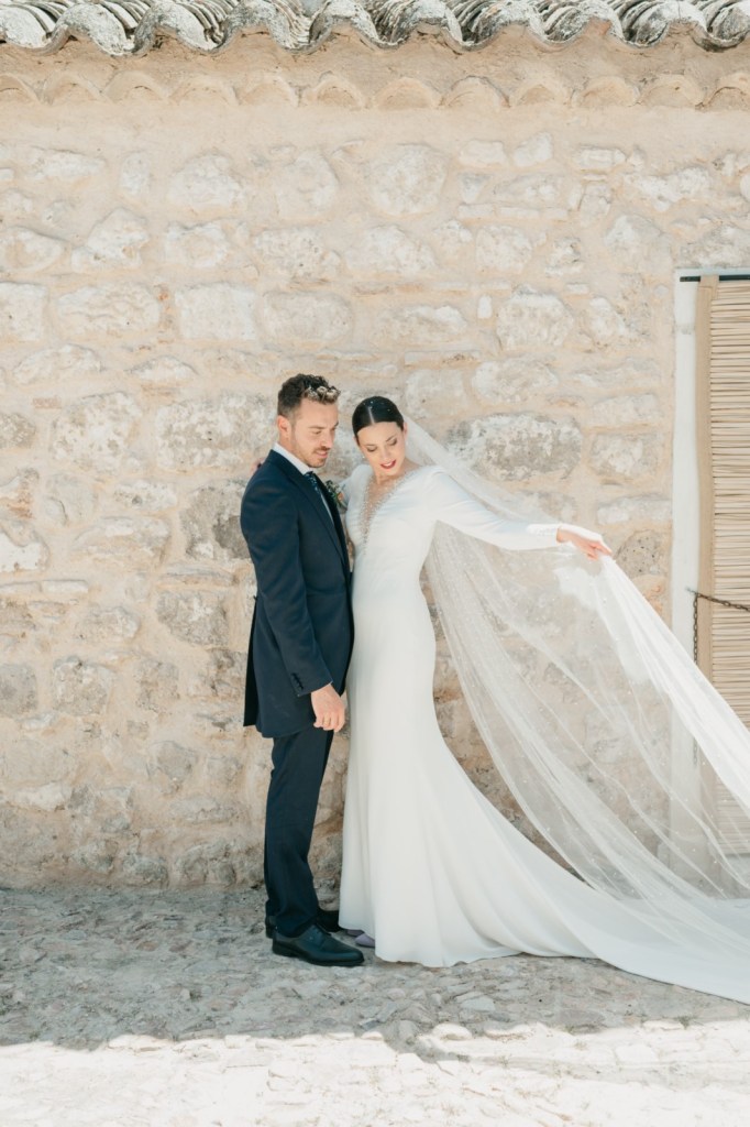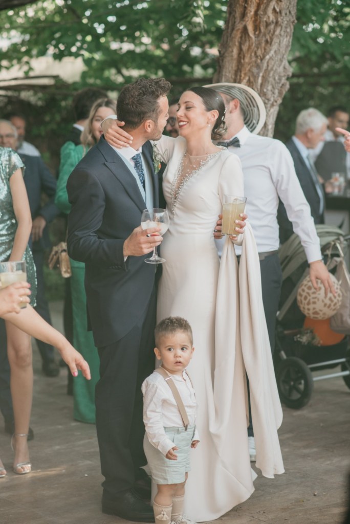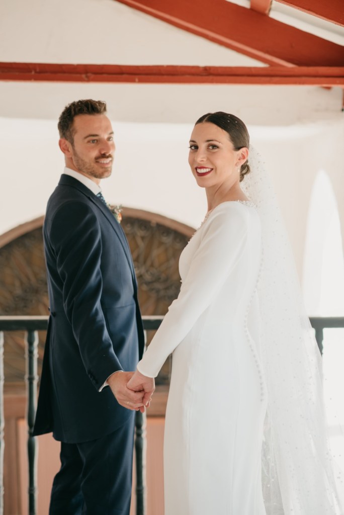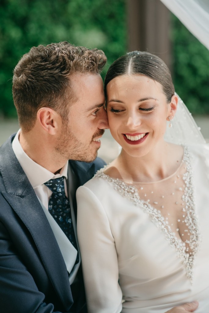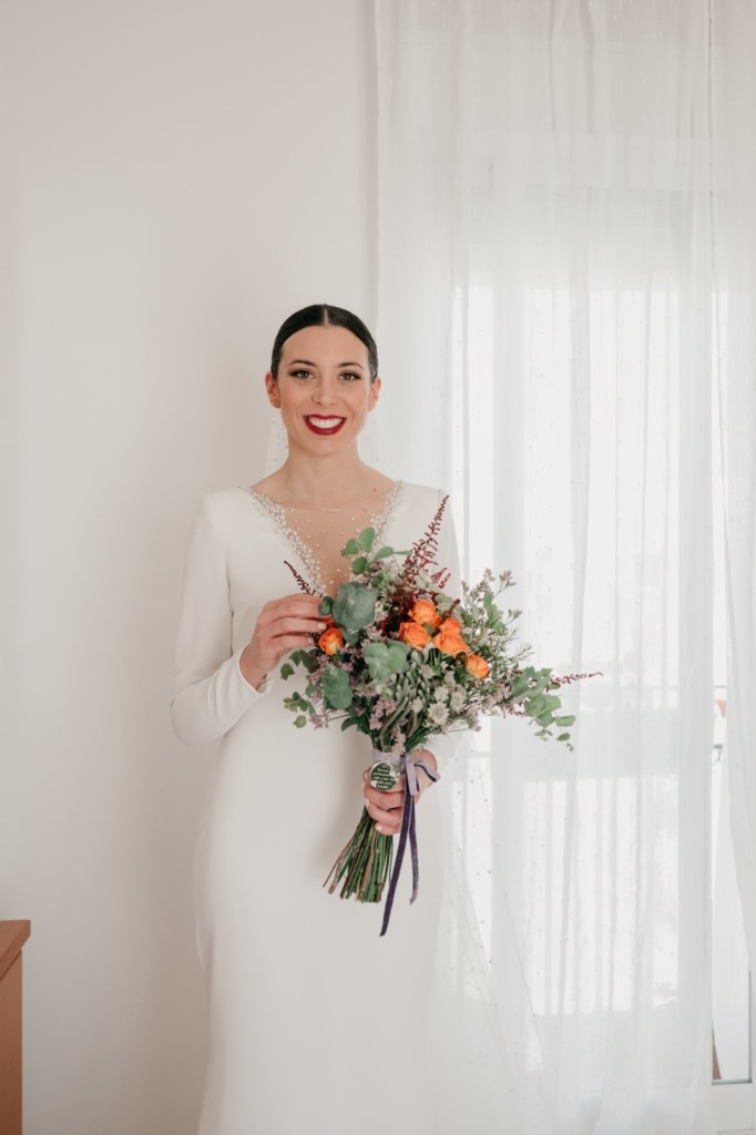 Inés eligió un pronovias precioso, de corte sirena y escote en V con perlas, las mismas que el bello velo que lucía. Completaban el look unos bonitos Salo Madrid en tono lila, y su llamativo ramo de rosas naranjas, eucalipto y flores silvestres, obra de Miguel Valle. Del estilismo se encargó Javier Magán y Tiffany puso el broche con 3 estrellas sobre el peinado de Inés.