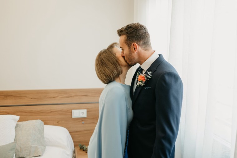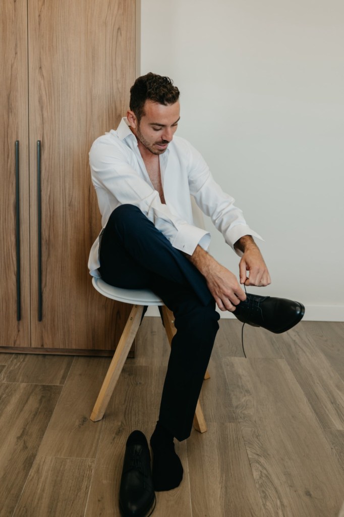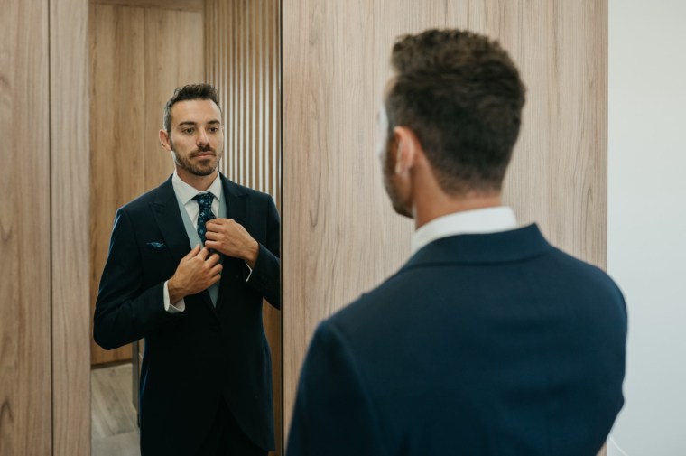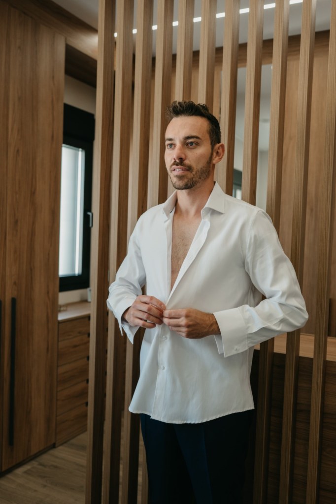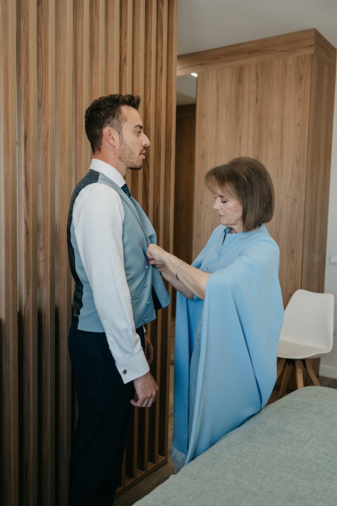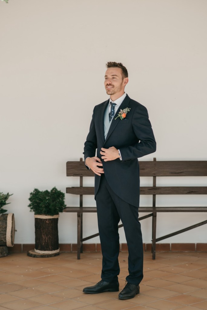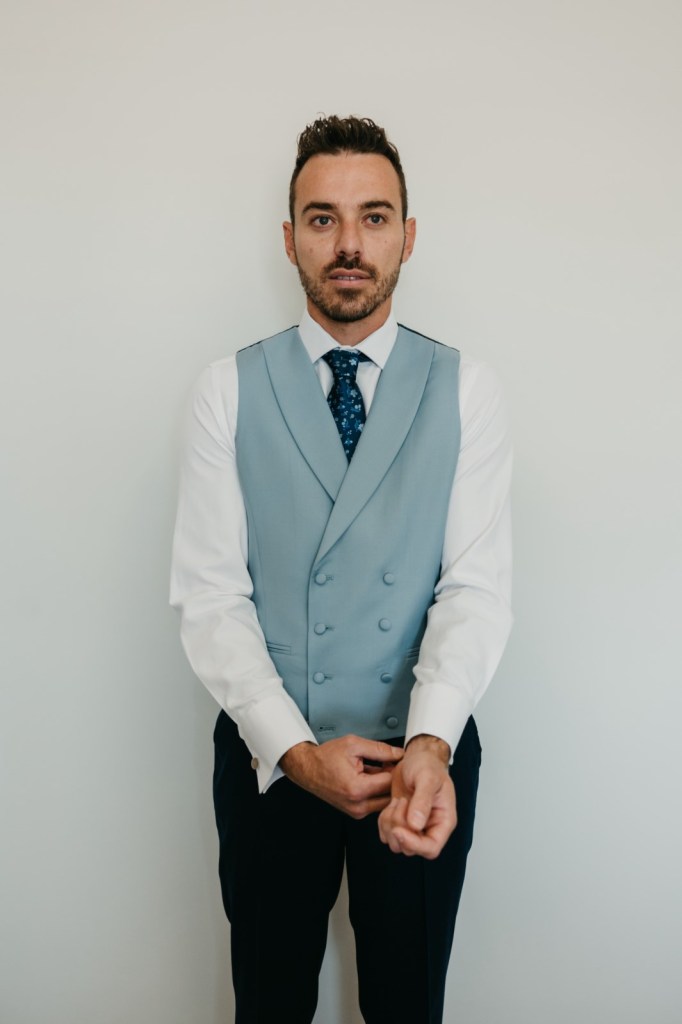 César comenzó su día en la casa que ya comparte con Inés, entre sus familiares más cercanos y algunos de sus amigos. Eligió un elegante chaqué azul marino con chaleco celeste y corbata floreada en la gama de azules también, de la conocida tienda de Augusto Negrillo.
