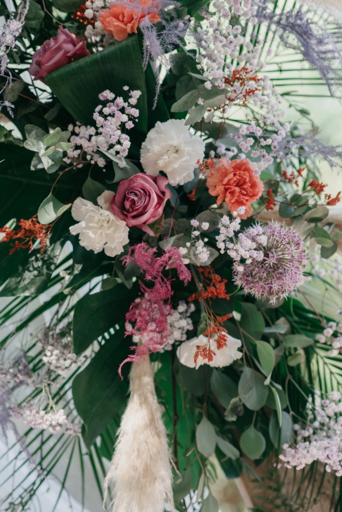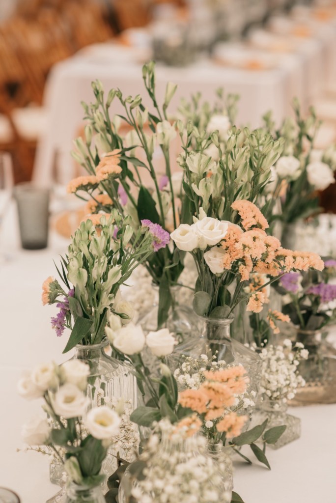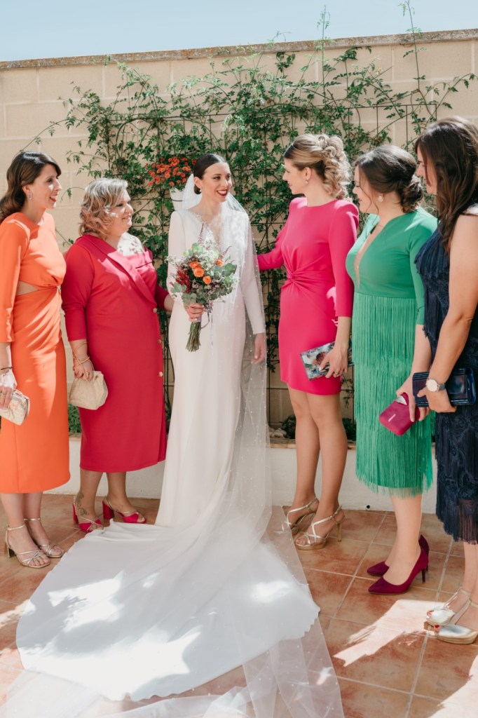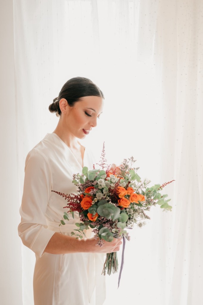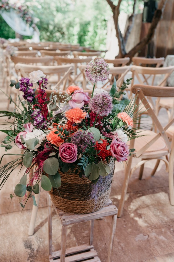 El lugar estaba perfectamente decorado por el florista Miguel Valle, en tonos naranjas y violetas, como el resto de la boda, dando así una alegría única.