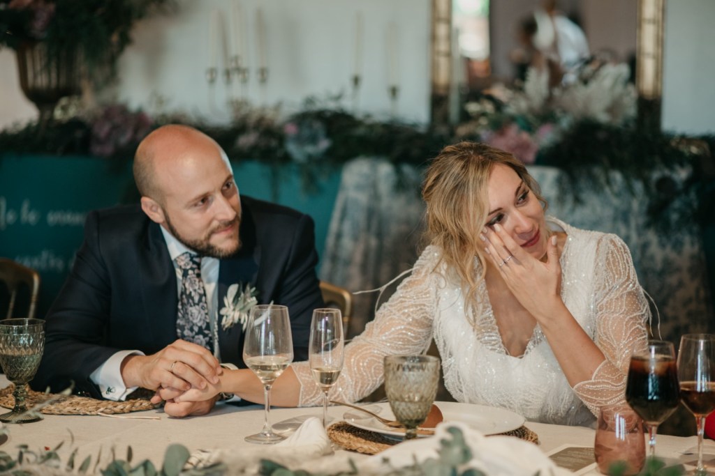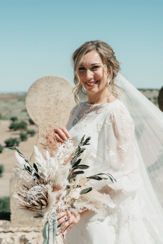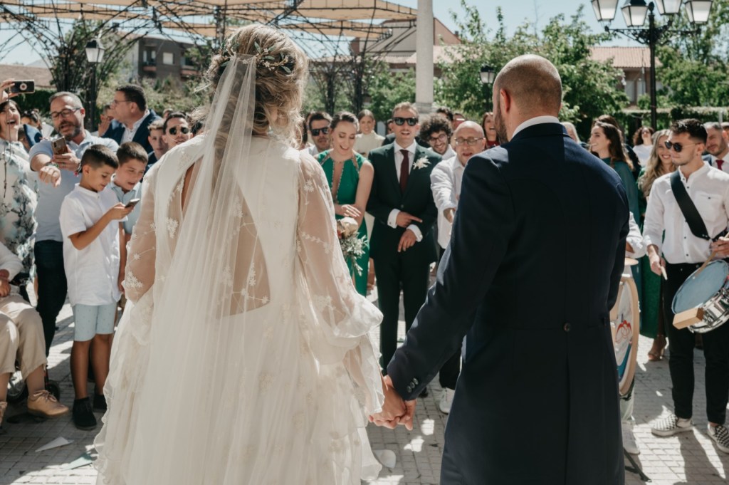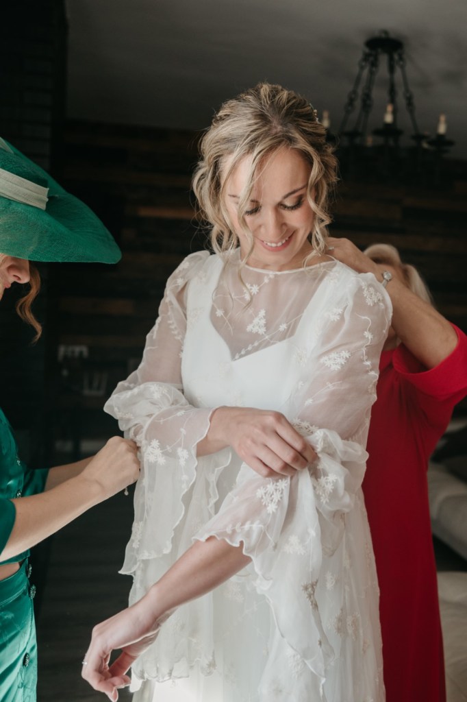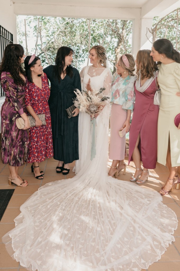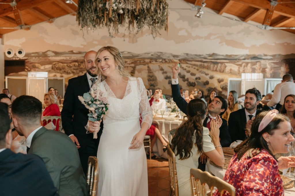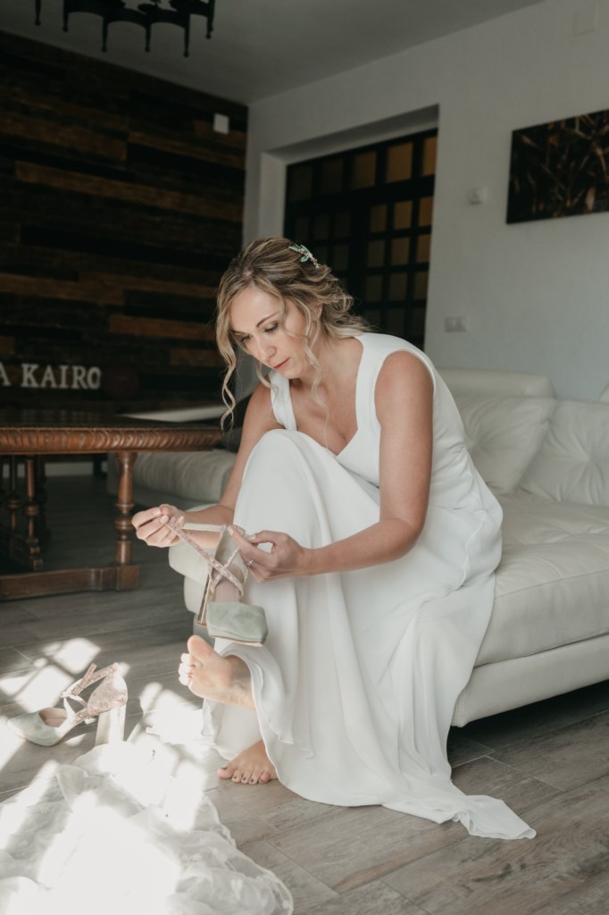 Por su parte, Paloma se vestiría en una casa rural, muy cerquita. Su look, bohemio y romántico nos encantó. Era un vestido precioso de María Baraza, que a su vez daría la opción de verla de diferentes maneras a lo largo de la boda. Lo acompañaba un tocado de Volvorete sobre su trenza, obra de Silvia de Miss Pretty Imagen, un ramo totalmente boho de Pecci Arte Floral y unos zapatos en tono verde agua de Mariela Shoes.