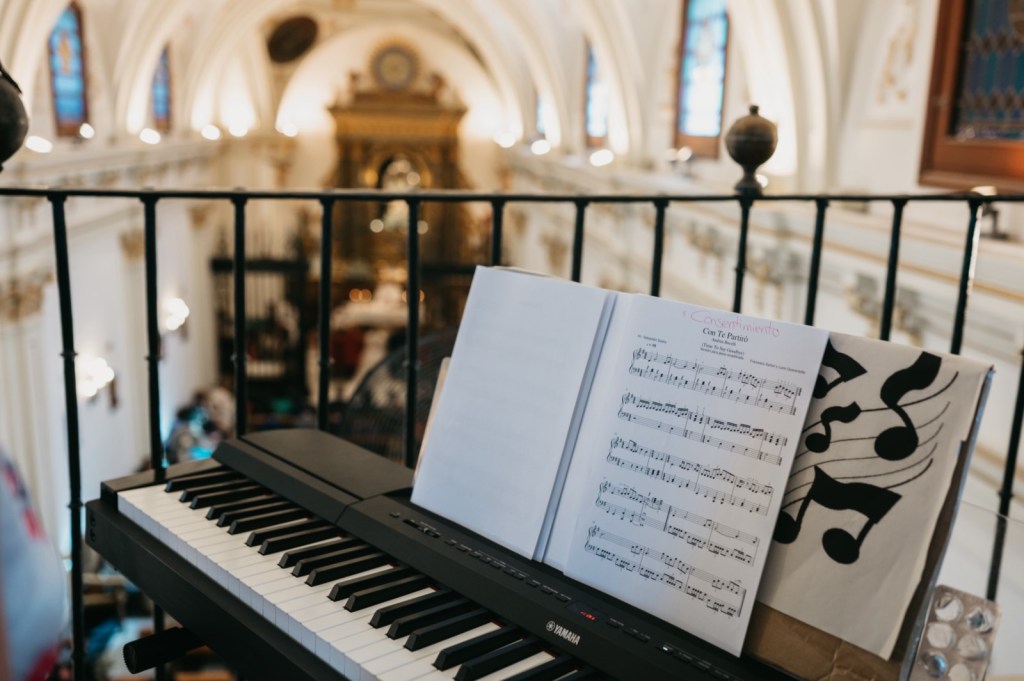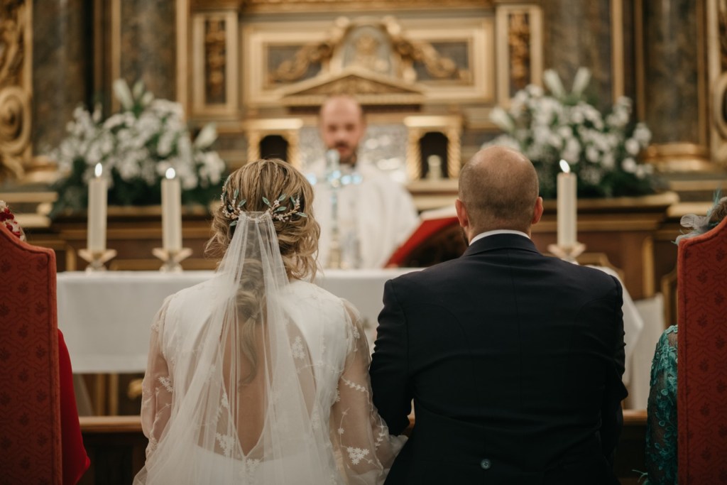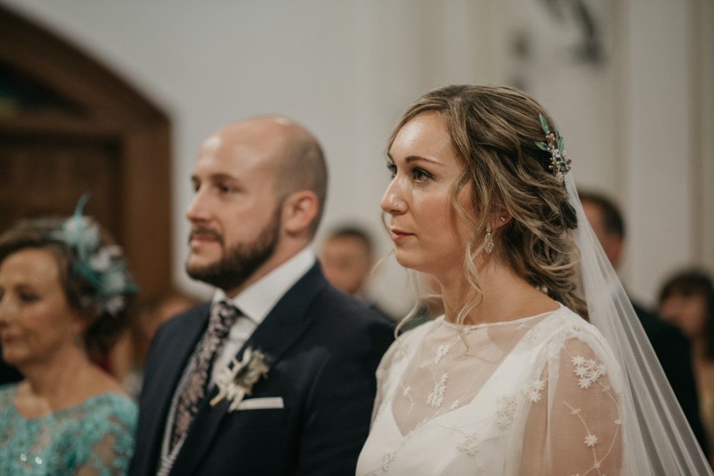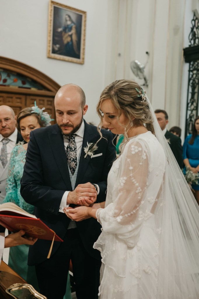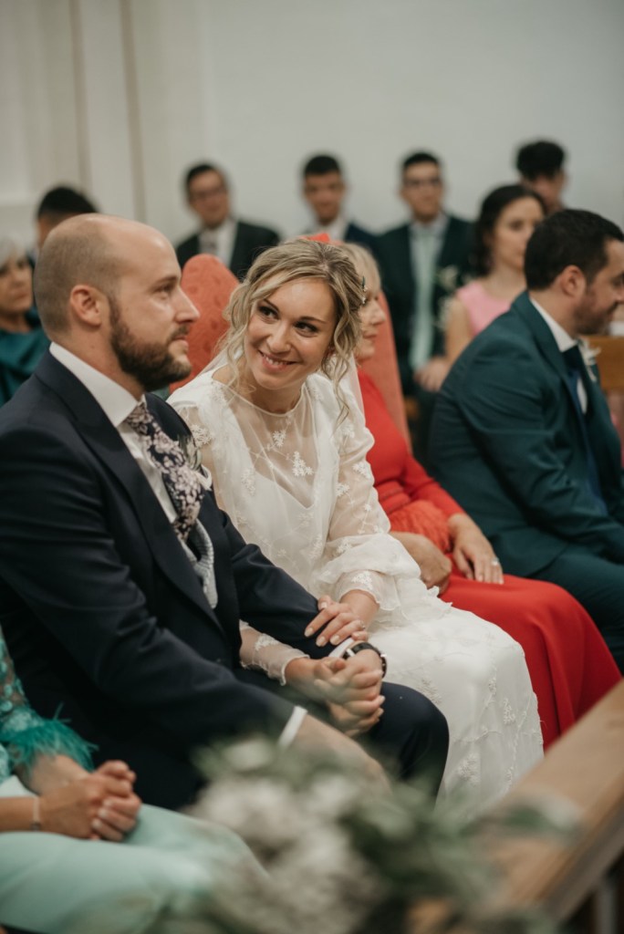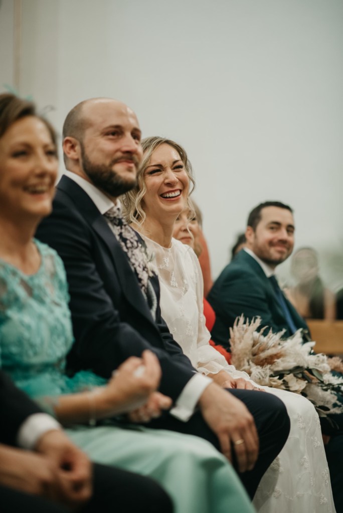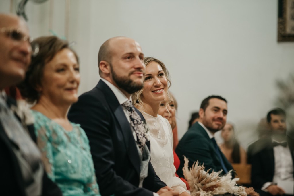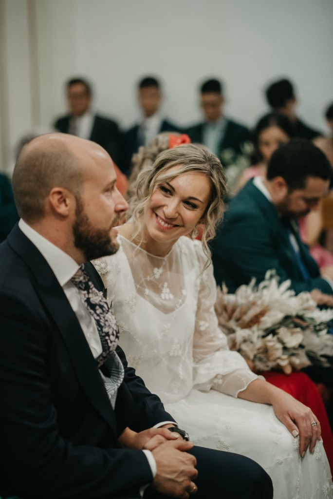 Nos encanta cuando los novios se brindan gestos de complicidad durante la ceremonia, y entre ellos, no faltaron las miradas ni las sonrisas. De fondo, el grupo Amarti ponía los sones a esta bonita parte del día. A la salida, un coro carnavalero les sorprendía con una canción dedicada especialmente a ellos.