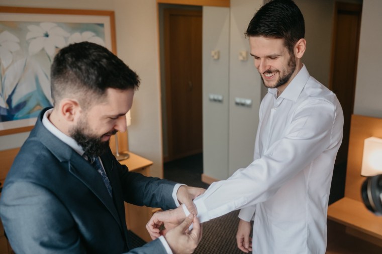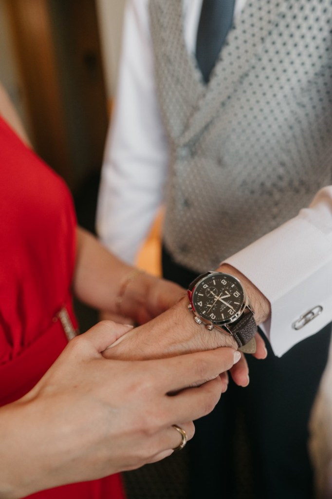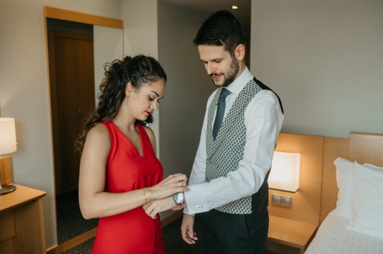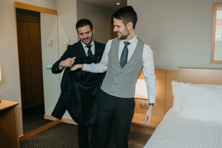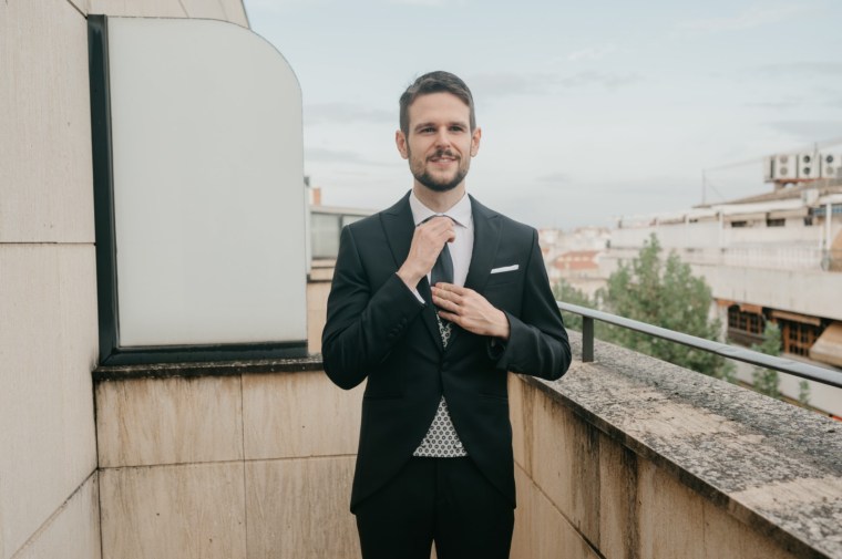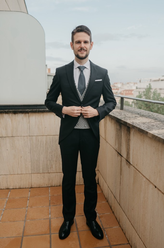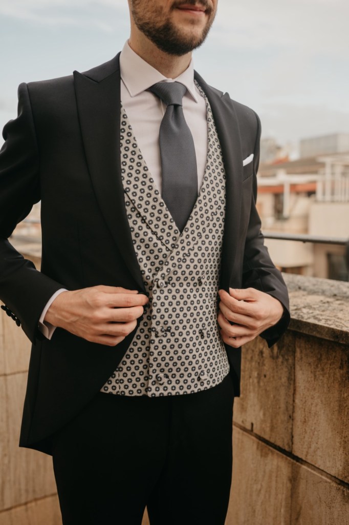 Javier se preparó con sus más íntimos en el hotel Alfonso X de la capital, y eligió un traje oscuro, con chaleco y corbata a juego, todo ello de Nico Hombre.