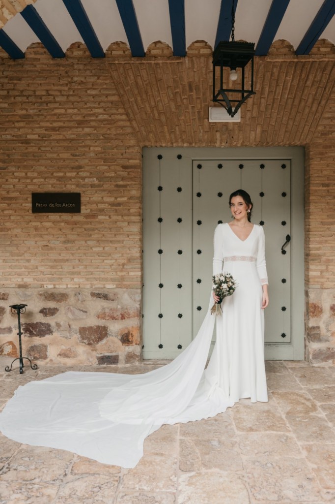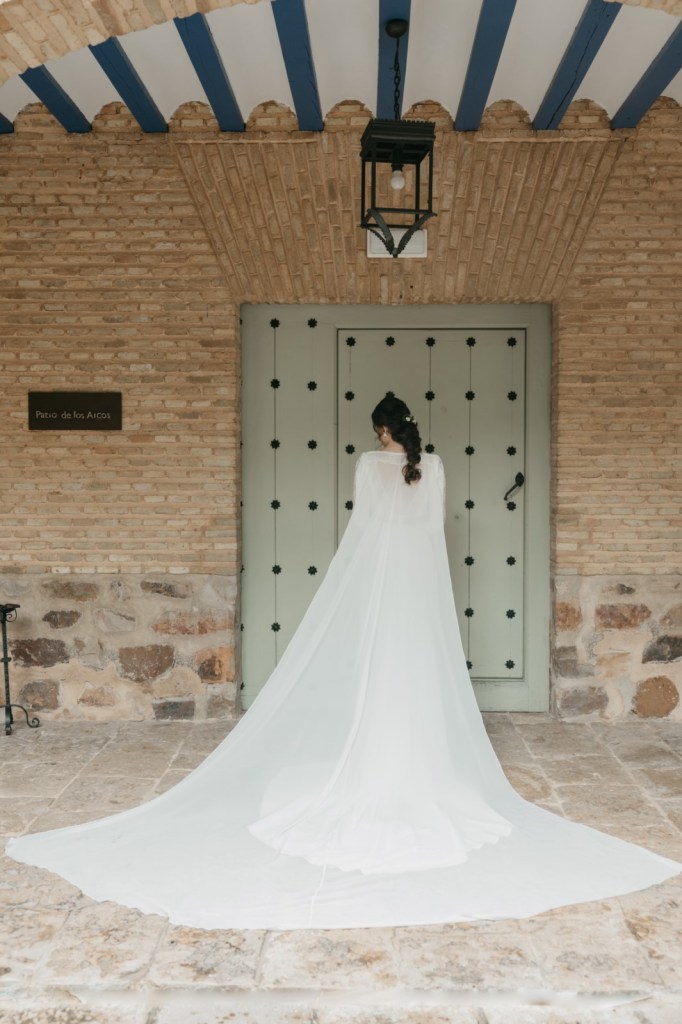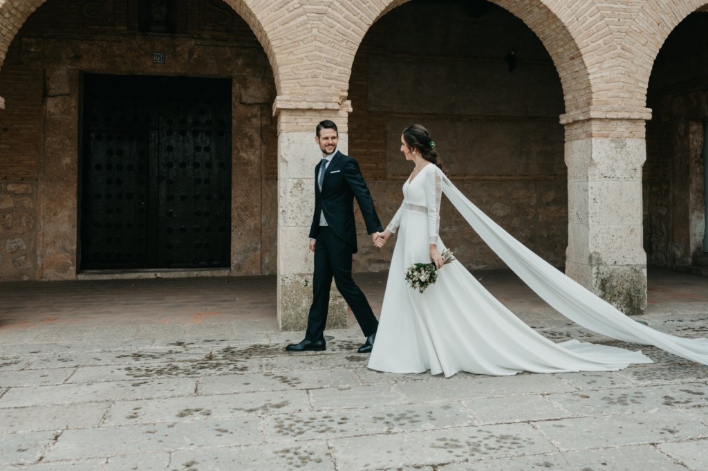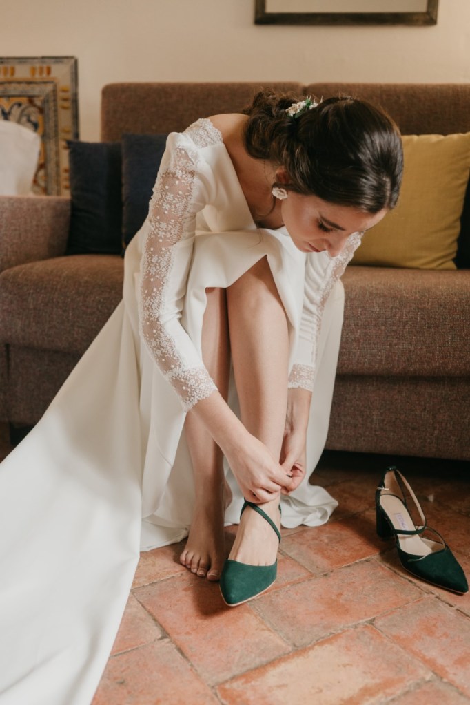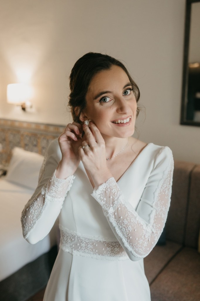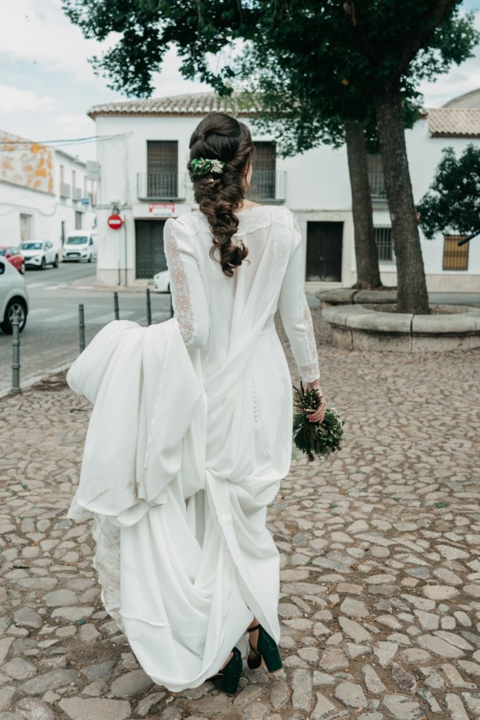 Por su parte, Belén elegiría una de las habitaciones del Parador de Almagro para vestirse, y así aprovechamos también los exteriores para hacerle las primeras fotos con su vestido de Silvia Fernández y sus zapatos verde esperanza de Franjul. Además, estaba preciosa maquillada y peinada por el equipo de Verde Agua Novias, con un tocado que prendía de su trenza a juego con su ramo, destacando las margaritas silvestres, obra de floristería Santa Gema.