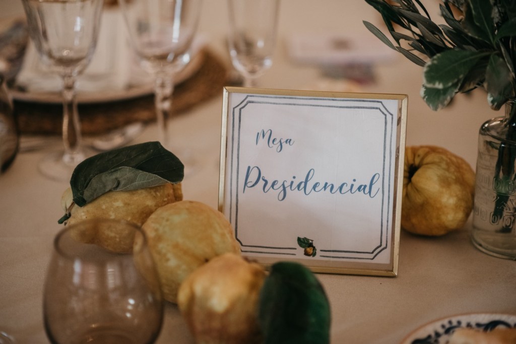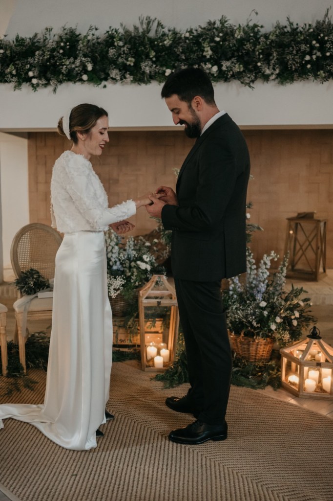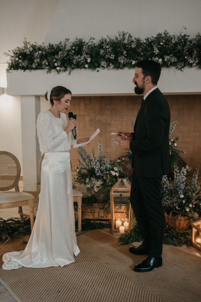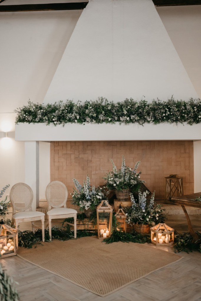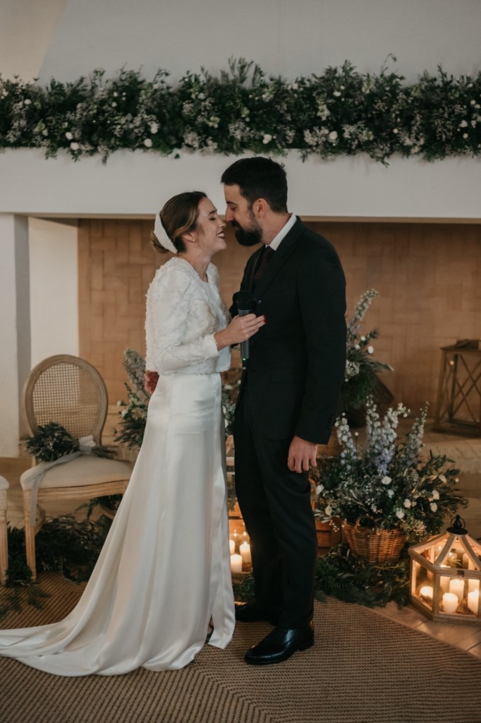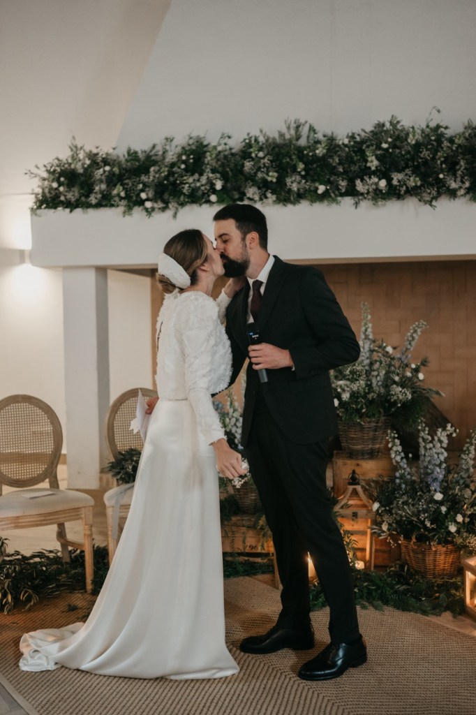 El espacio de la boda estuvo cuidadosamente decorado, con elementos naturales que evocaban la esencia de la finca. Los membrillos, las hortensias azules, las rosas blancas y el eucalipto fueron protagonistas en el seating plan y en el salón de la chimenea, donde se celebró la ceremonia. La calidez del lugar, sumada a la emoción de los discursos de amigos y familiares, así como sus votos, hicieron de este momento algo inolvidable.
