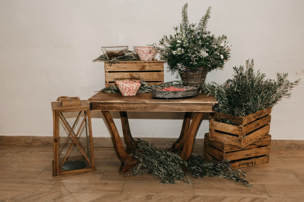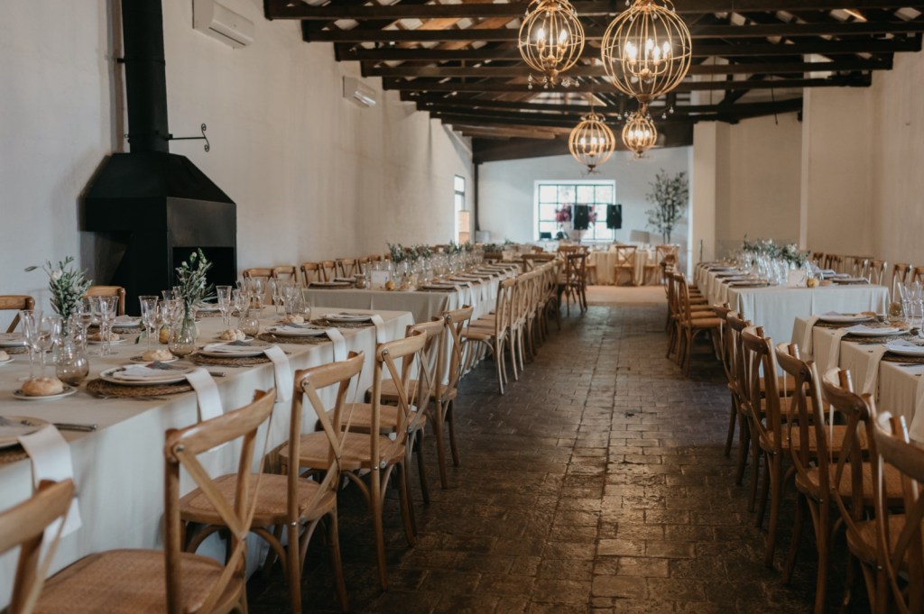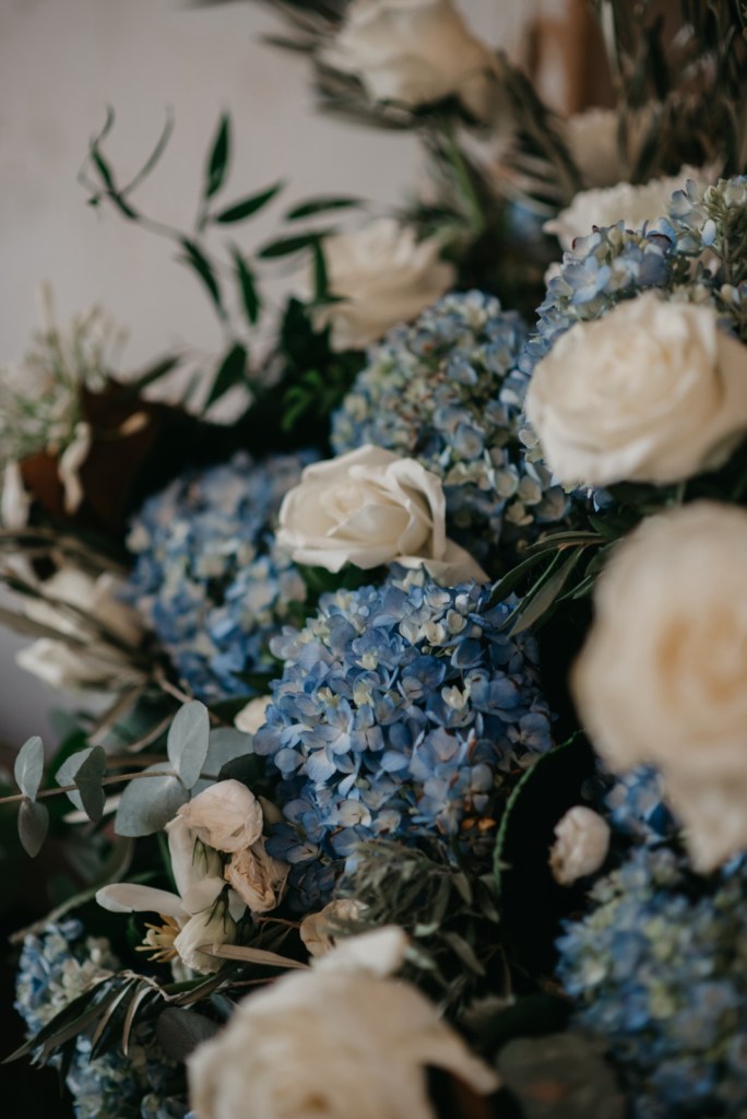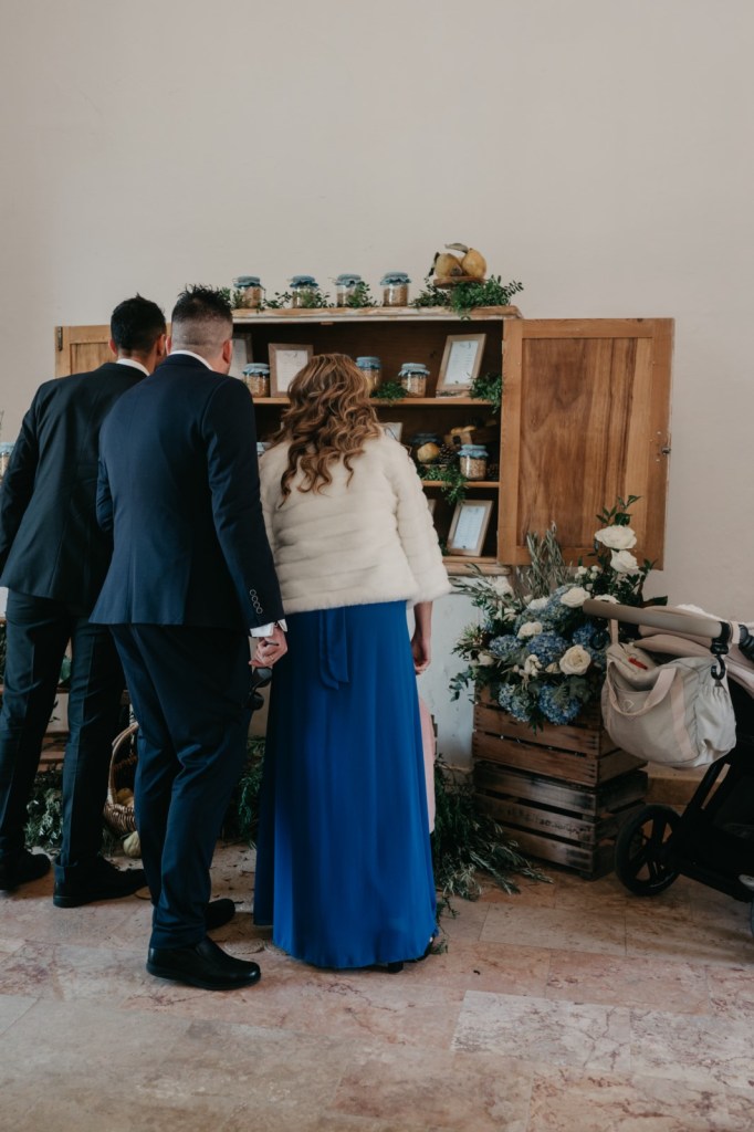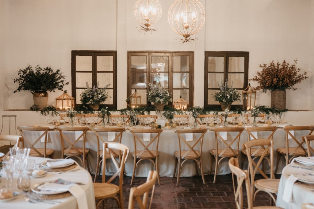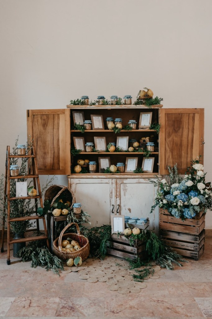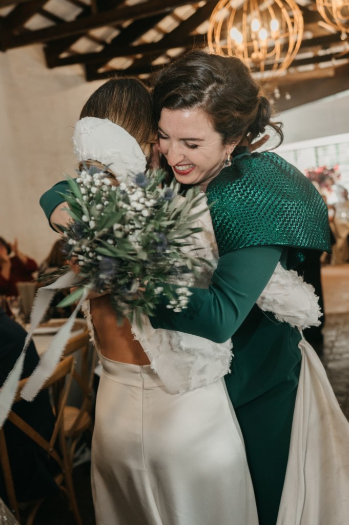 El espacio de la boda estuvo cuidadosamente decorado, con elementos naturales que evocaban la esencia de la finca. Los membrillos, las hortensias azules, las rosas blancas y el eucalipto fueron protagonistas en el seating plan y en el salón de la chimenea, donde se celebró la ceremonia. La calidez del lugar, sumada a la emoción de los discursos de amigos y familiares, así como sus votos, hicieron de este momento algo inolvidable.