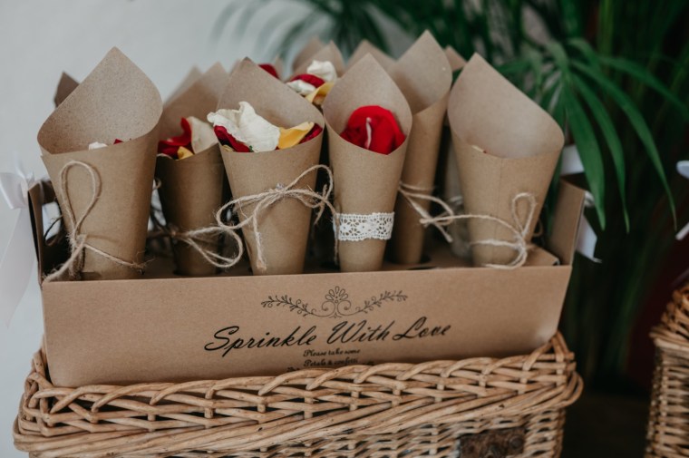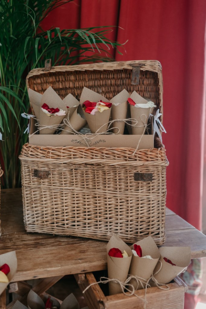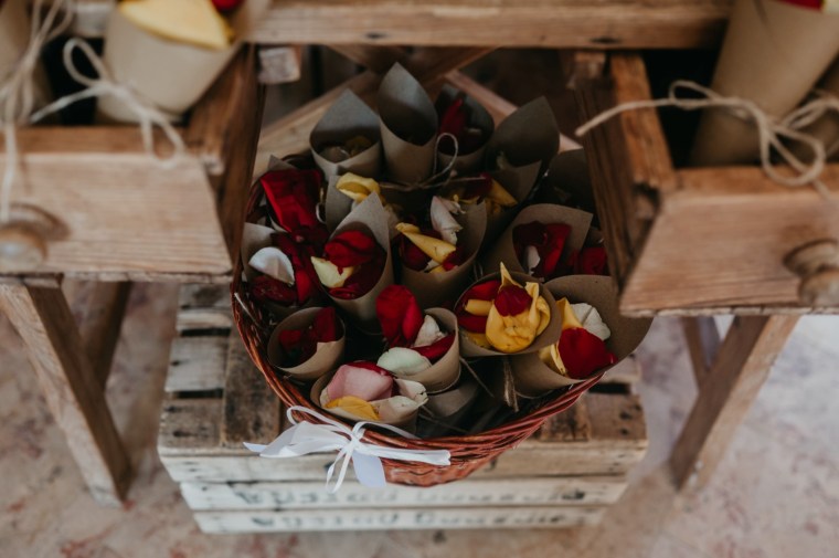 Después de la ceremonia, los recién casados salieron entre una lluvia de pétalos, un momento lleno de alegría y color.