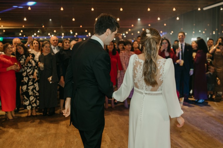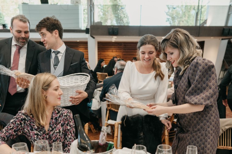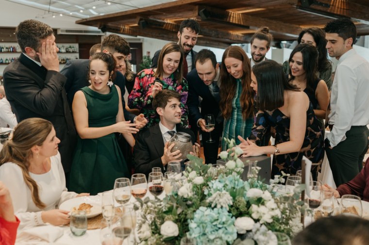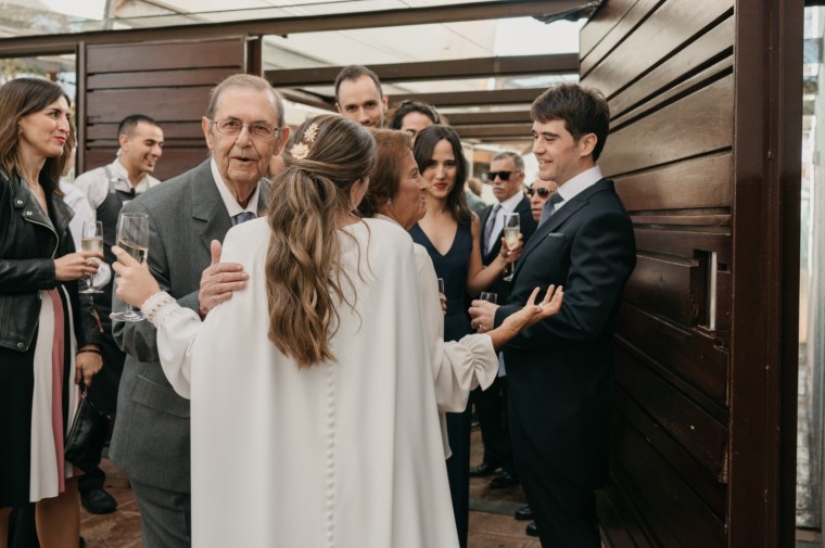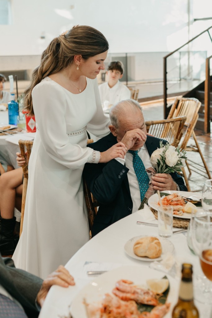 Tras un animado cóctel y las fotos de grupo, llegó el momento de la comida, donde no faltaron las sorpresas: los novios recibieron regalos de algunos invitados, pero también ellos prepararon momentos especiales, como el homenaje al abuelo de Carmen, uno de los instantes más emotivos del día.