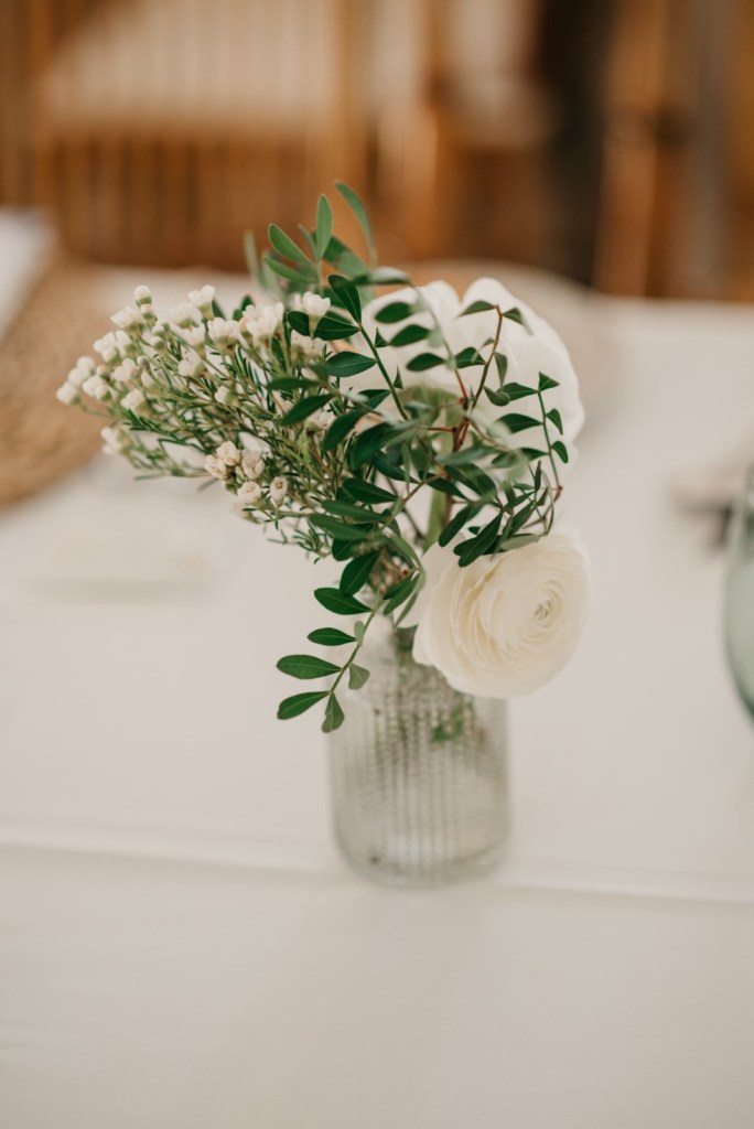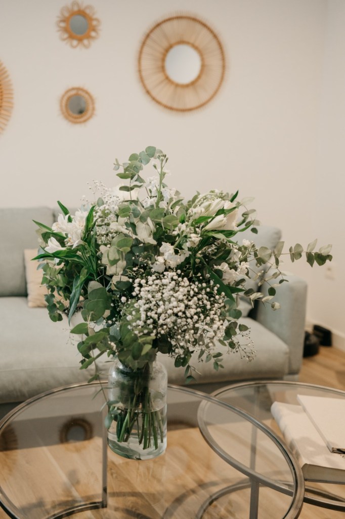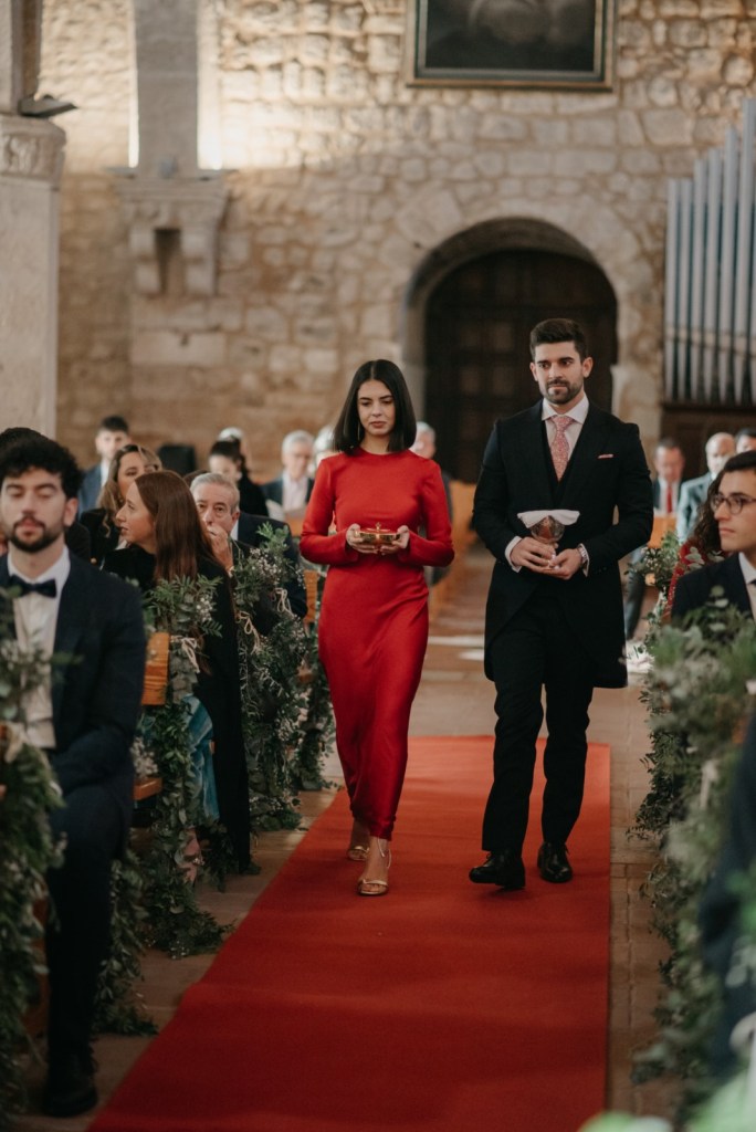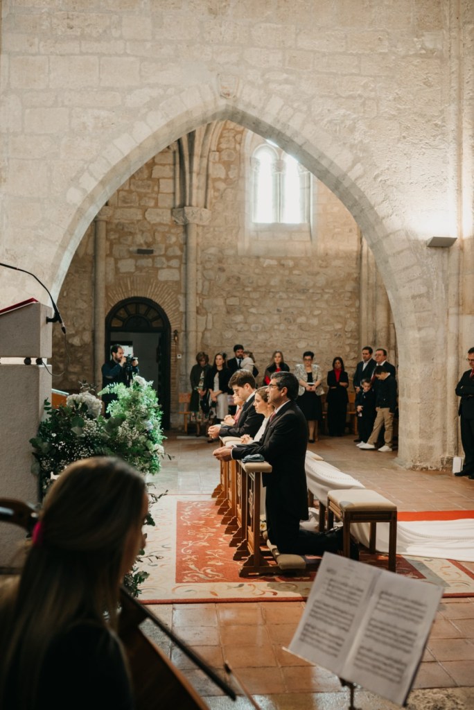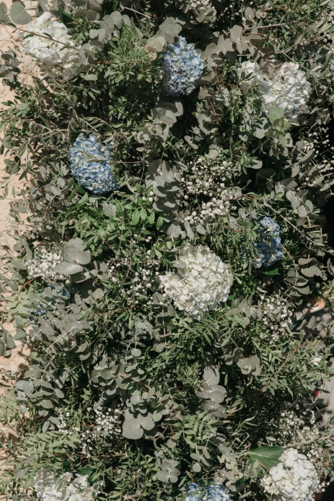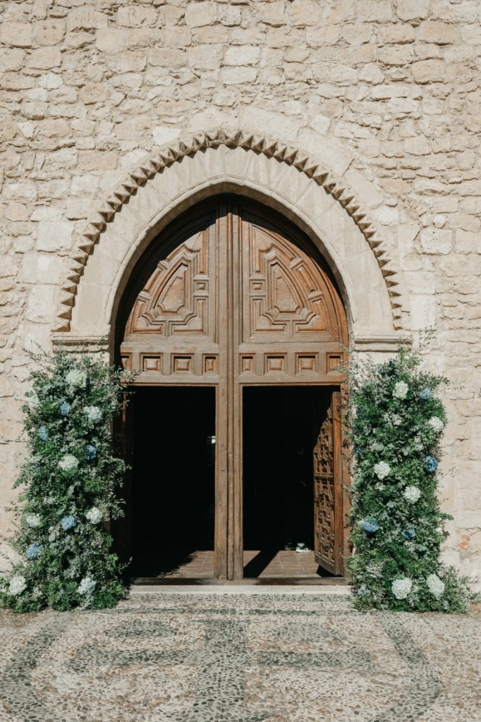 La ceremonia tuvo lugar en la acogedora iglesia de Santiago, donde el ambiente otoñal se mezclaba con una decoración floral cuidadosamente diseñada. A las puertas, dos impresionantes columnas de hortensias blancas y azules, eucalipto, paniculata y ramas de olivo daban la bienvenida a los invitados. En el interior, las mismas flores colgaban de los bancos y adornaban el altar mayor, creando una atmósfera íntima y armoniosa.