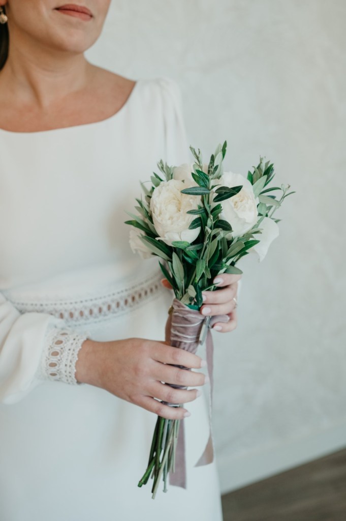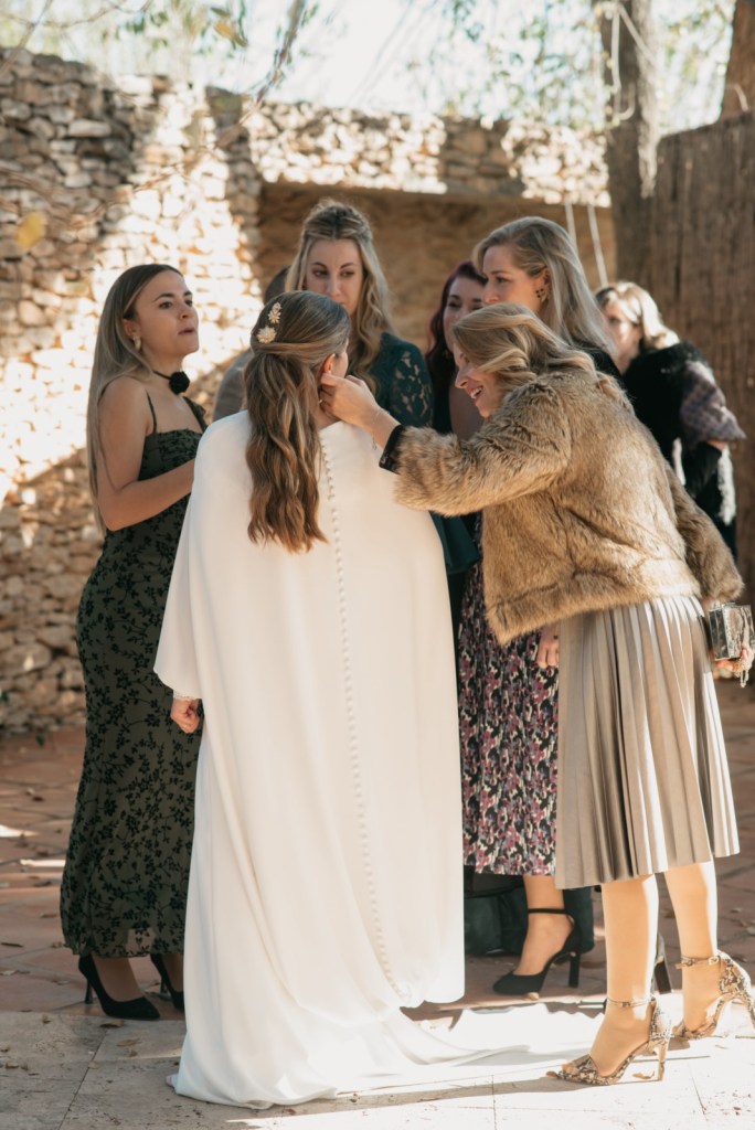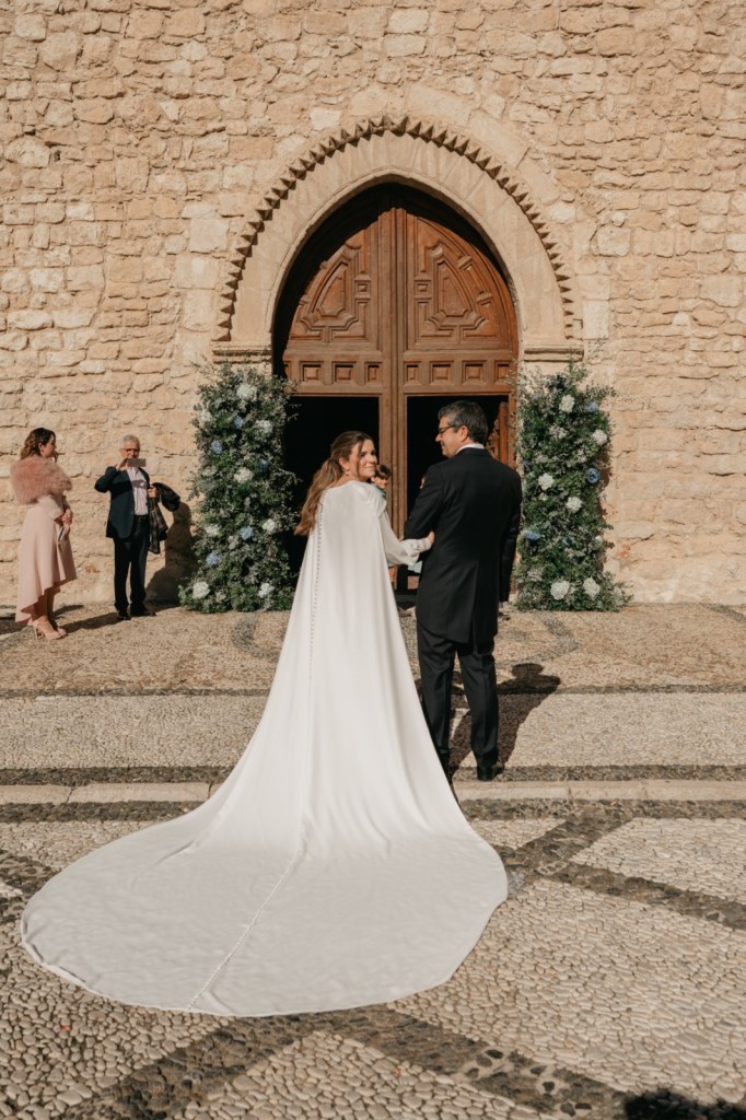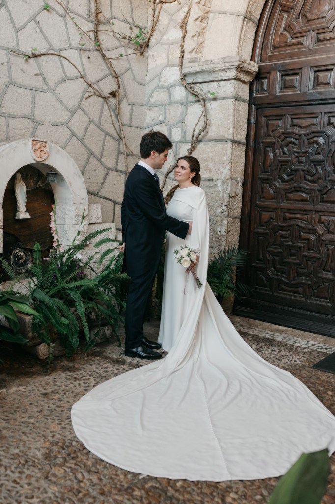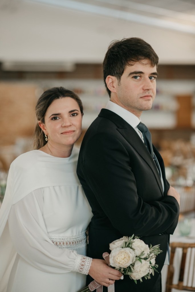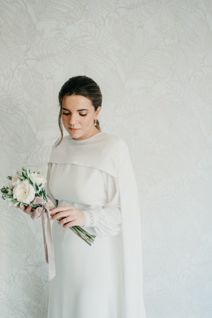 Carmen, por su parte, se preparó en la que ya era su casa común junto a Bosco, rodeada de su madre, su padre y su abuela. Lucía un vestido de Pronovias liso, de corte limpio, con un delicado encaje en la espalda y una larga capa que caía sobre sus hombros con una elegancia natural. Llevaba el pelo recogido en una bonita coleta adornada con tres delicados detalles dorados que resaltaban la sencillez del conjunto. Su ramo, creado por Floristería Pife, estaba compuesto por rosas blancas y ramas de olivo, un símbolo perfecto de pureza y paz.