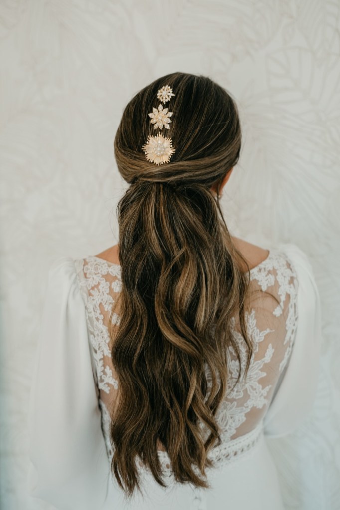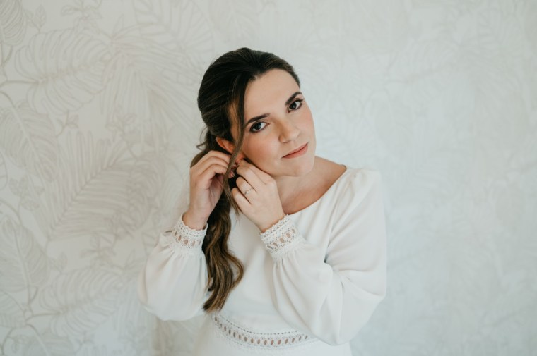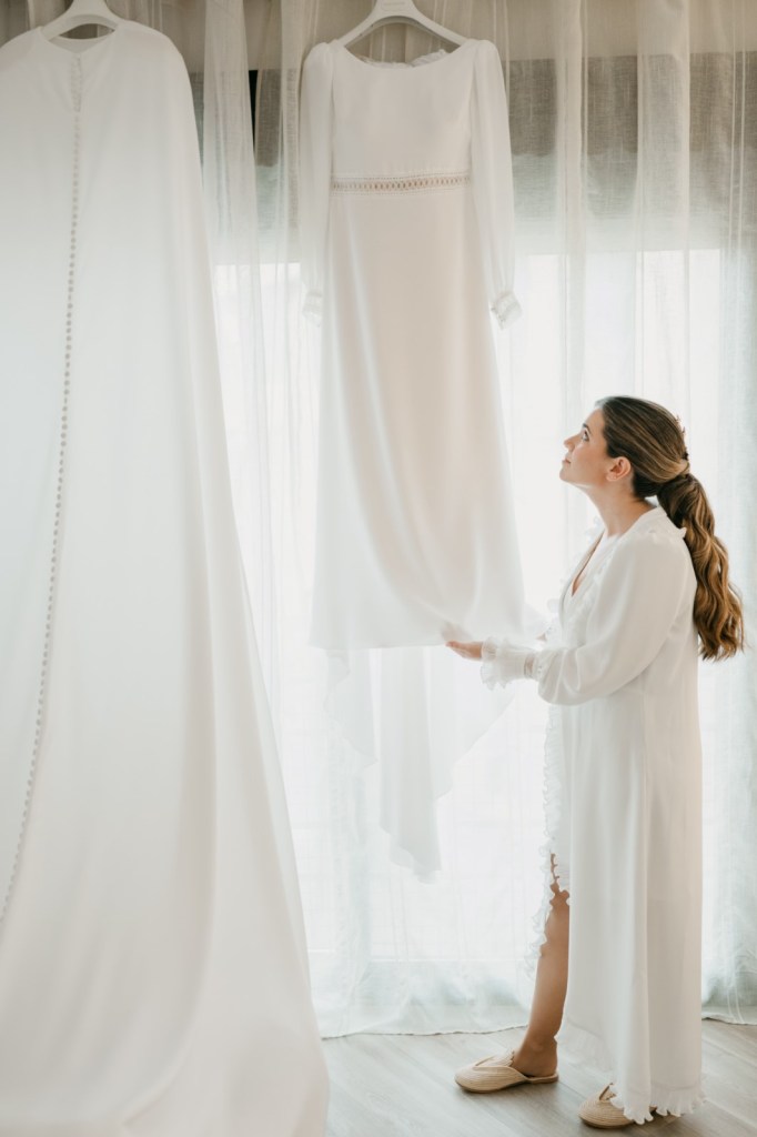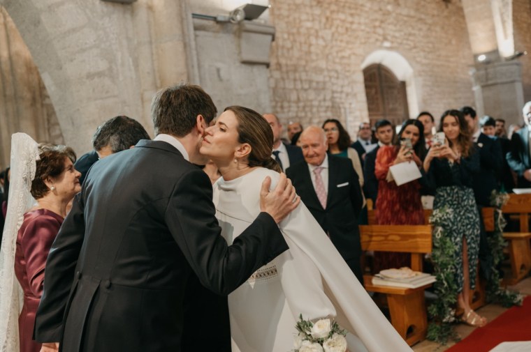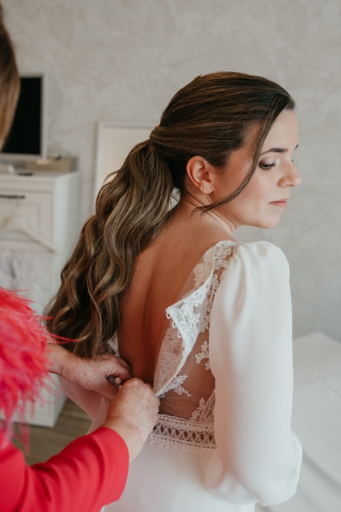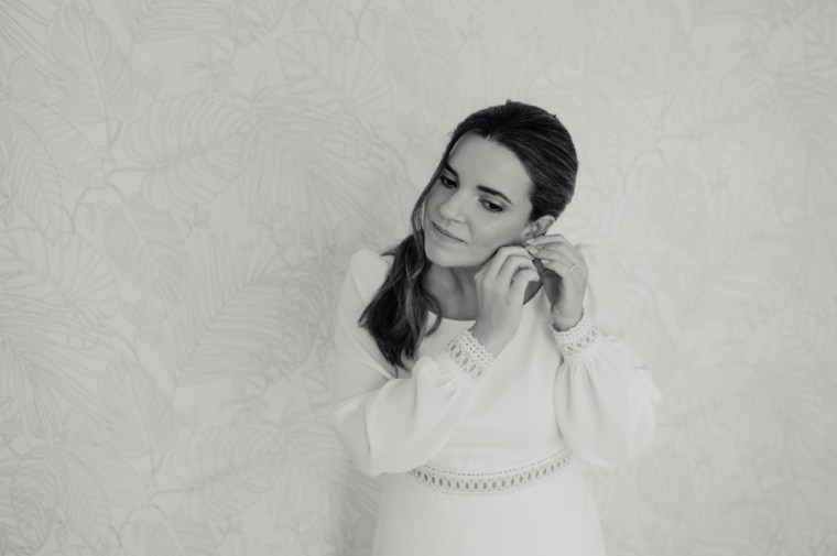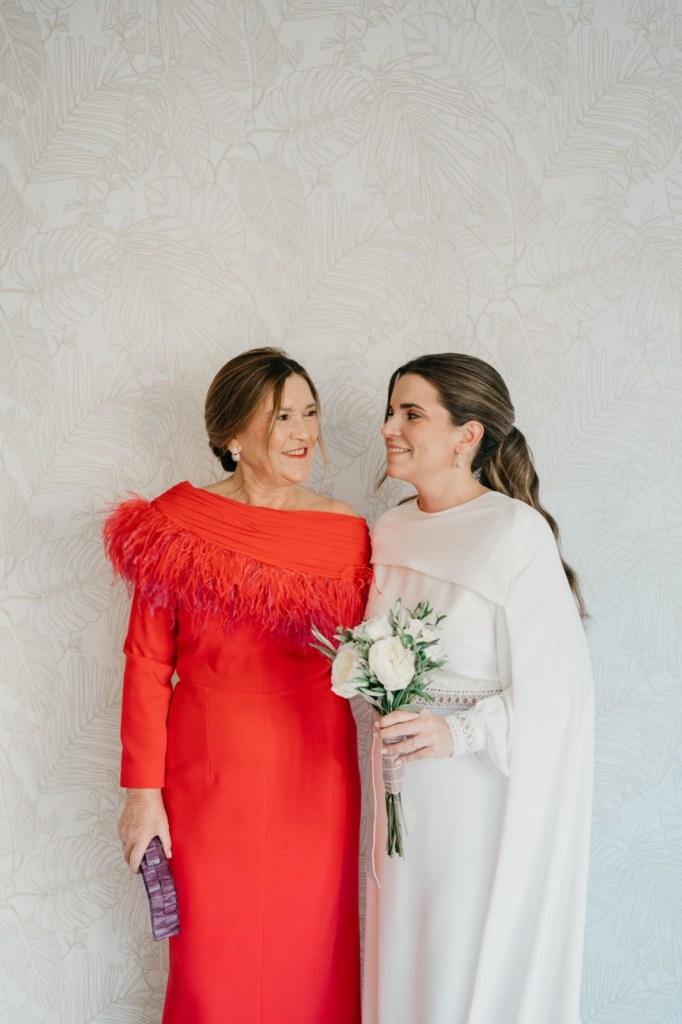 Carmen, por su parte, se preparó en la que ya era su casa común junto a Bosco, rodeada de su madre, su padre y su abuela. Lucía un vestido de Pronovias liso, de corte limpio, con un delicado encaje en la espalda y una larga capa que caía sobre sus hombros con una elegancia natural. Llevaba el pelo recogido en una bonita coleta adornada con tres delicados detalles dorados que resaltaban la sencillez del conjunto. Su ramo, creado por Floristería Pife, estaba compuesto por rosas blancas y ramas de olivo, un símbolo perfecto de pureza y paz.