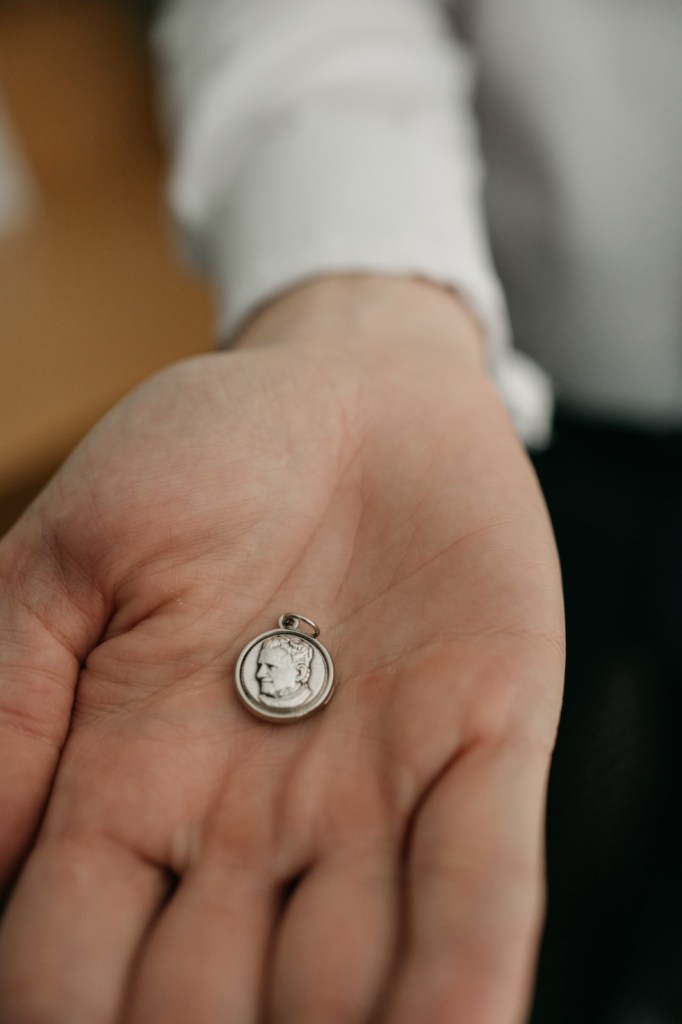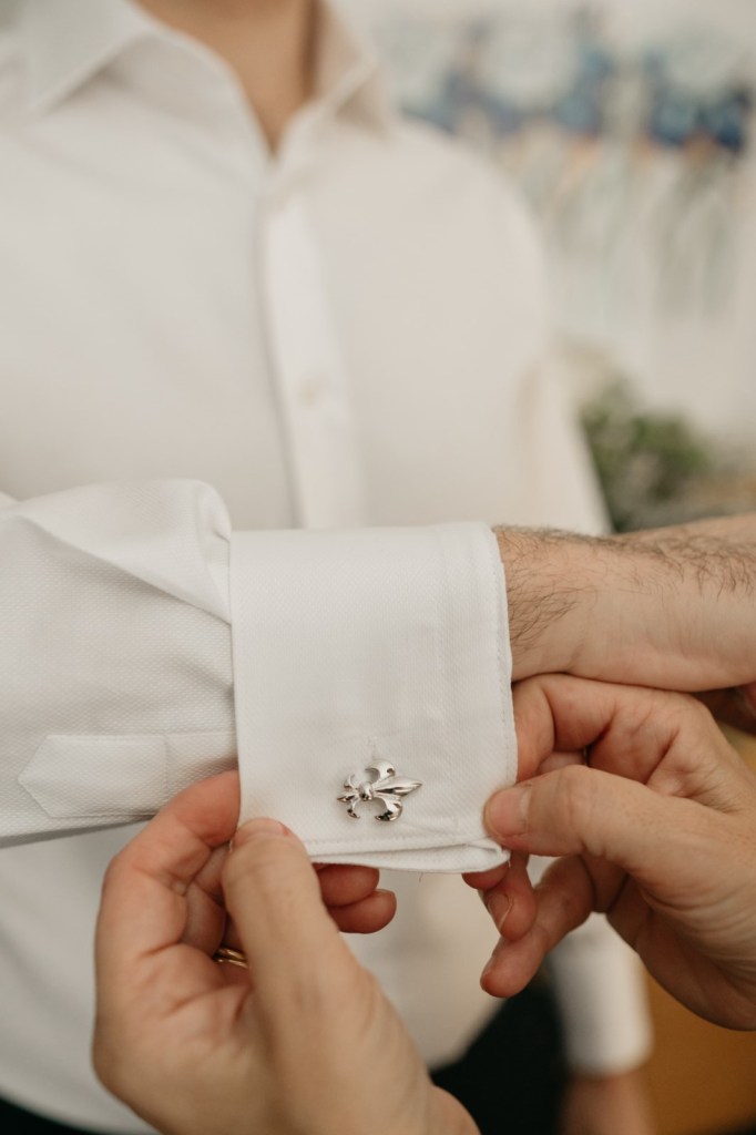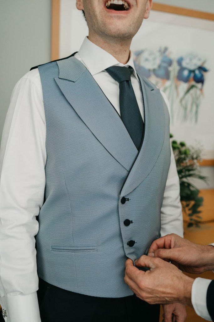 Vestía un impecable traje azul marino muy oscuro de Nico Hombre, que combinó con un chaleco azul celeste y una corbata también en azul oscuro, creando un conjunto clásico y atemporal con un toque personal. Como detalle especial, lucía unos gemelos de plata con la flor de lis grabada, un símbolo cargado de significado y elegancia.