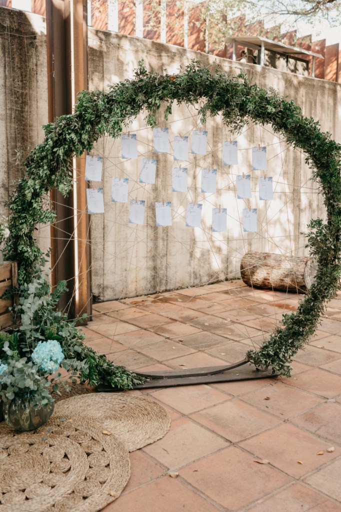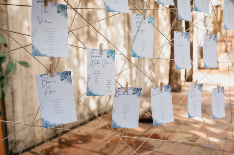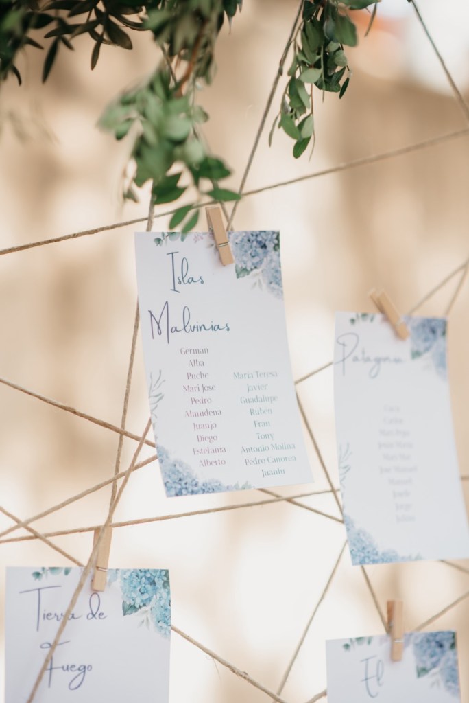 El salón estaba decorado con el mismo mimo que el resto del día. Hortensias azules seguían presentes, junto a un precioso seating plan temático de ciudades, y una ambientación que mantenía la línea natural y elegante de toda la boda.