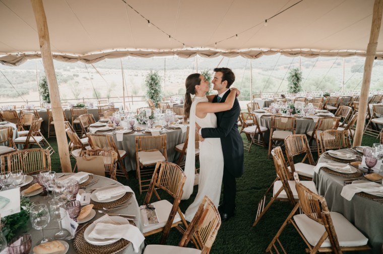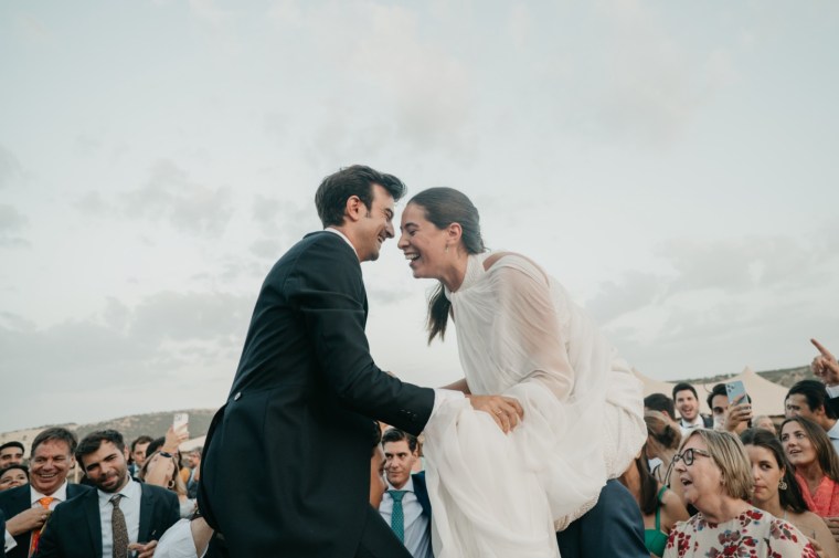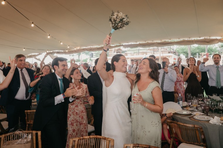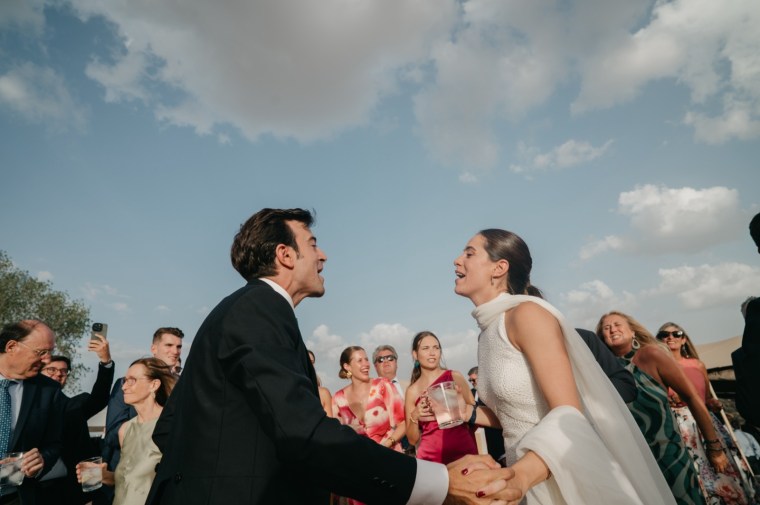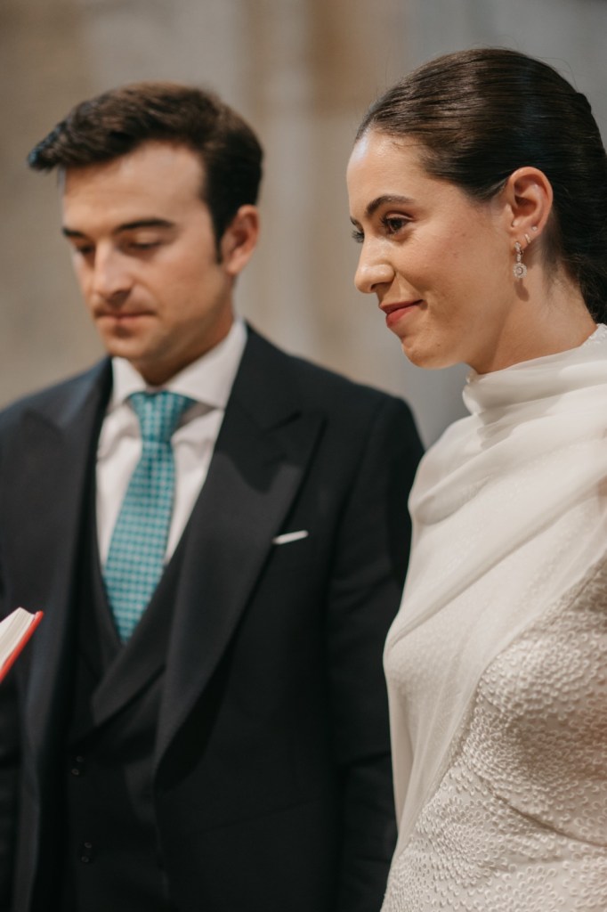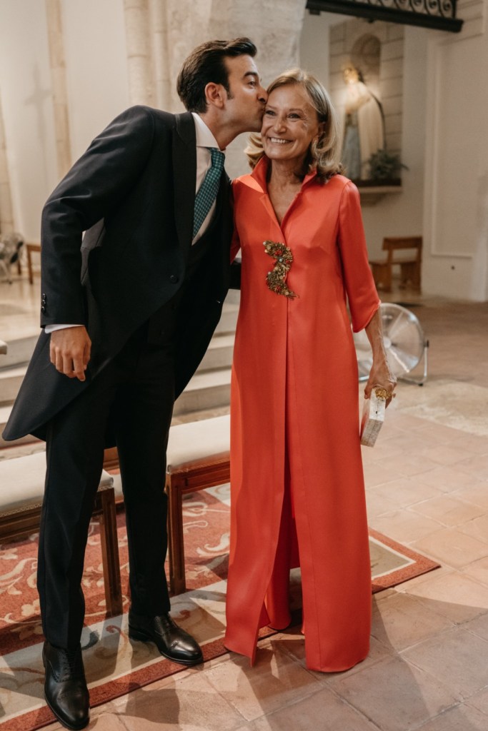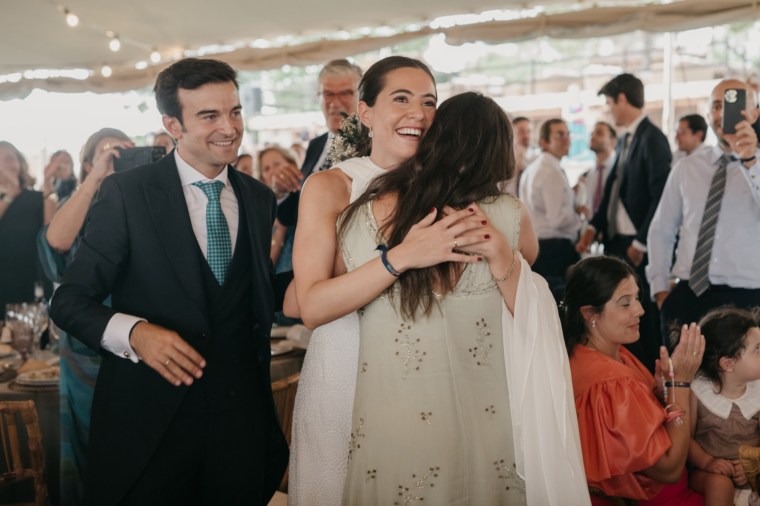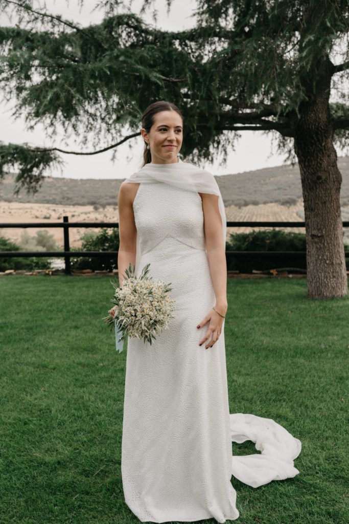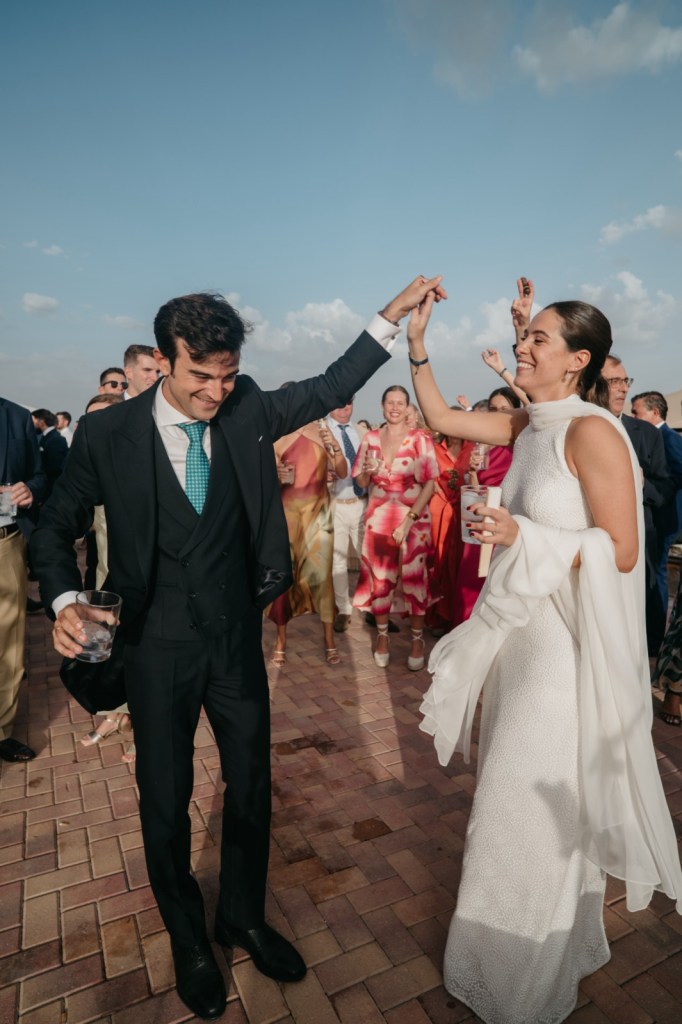 Quique lucía un elegante chaqué azul marino oscuro de Pepa Chaqué, con chaleco a juego y una corbata en tono verde agua que aportaba un toque fresco y original. Sole, por su parte, estaba radiante con un diseño de Sofía Delgado, de líneas sencillas y elegantes: un vestido de corte recto, sin mangas y con una delicada capa de tul sobre los hombros. Su ramo de margaritas y olivo completaba un look natural y lleno de encanto.