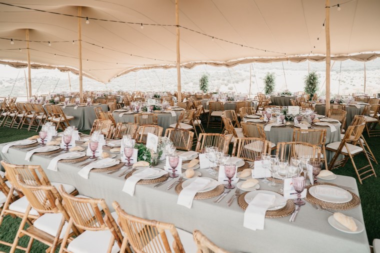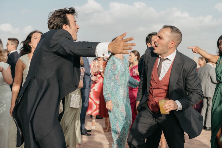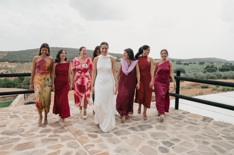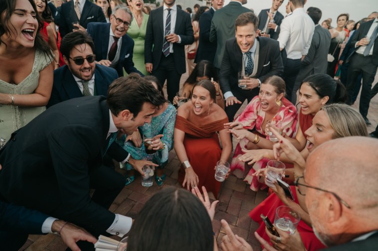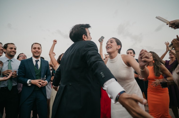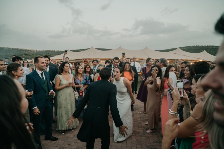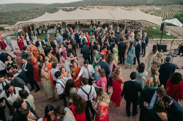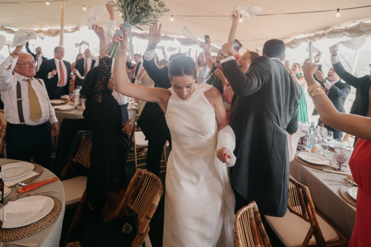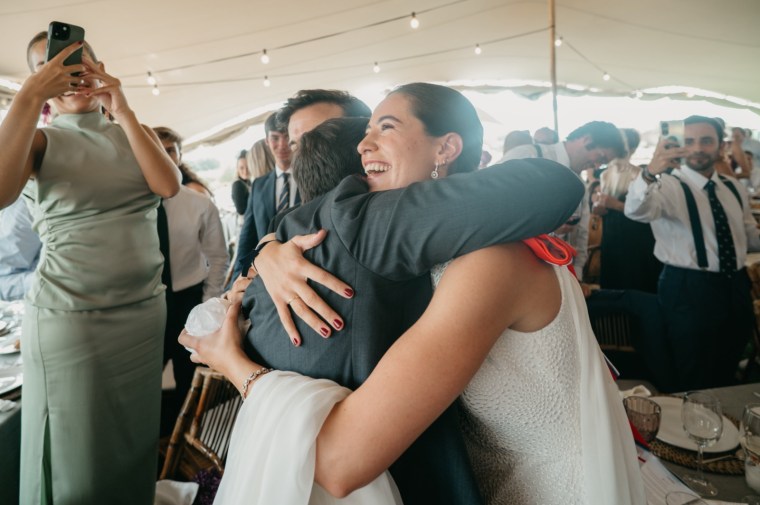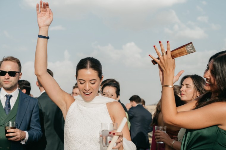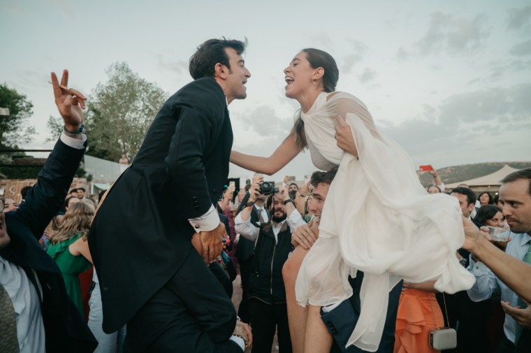 Quique lucía un elegante chaqué azul marino oscuro de Pepa Chaqué, con chaleco a juego y una corbata en tono verde agua que aportaba un toque fresco y original. Sole, por su parte, estaba radiante con un diseño de Sofía Delgado, de líneas sencillas y elegantes: un vestido de corte recto, sin mangas y con una delicada capa de tul sobre los hombros. Su ramo de margaritas y olivo completaba un look natural y lleno de encanto.