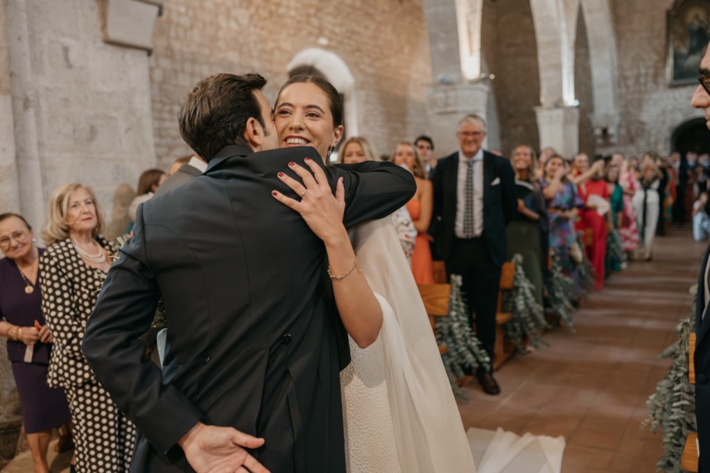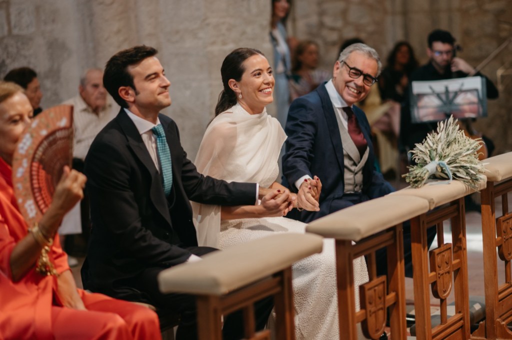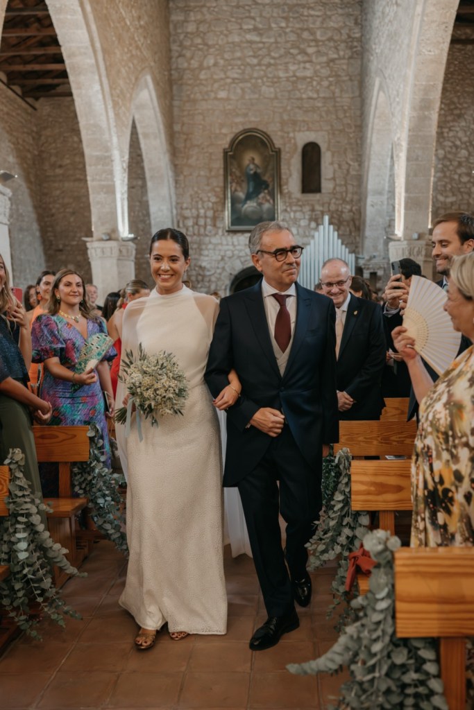 La decoración floral, a cargo de El Jardín Romántico, hizo que la iglesia luciera espectacular. En la entrada, dos grandes columnas de paniculata, eucalipto y olivo daban la bienvenida a los invitados, junto al rincón del confetti, con preciosas cestas de esparto. Dentro, cada banco estaba adornado con ramilletes de eucalipto, y el altar destacaba con un gran centro floral que enmarcaba perfectamente la ceremonia.