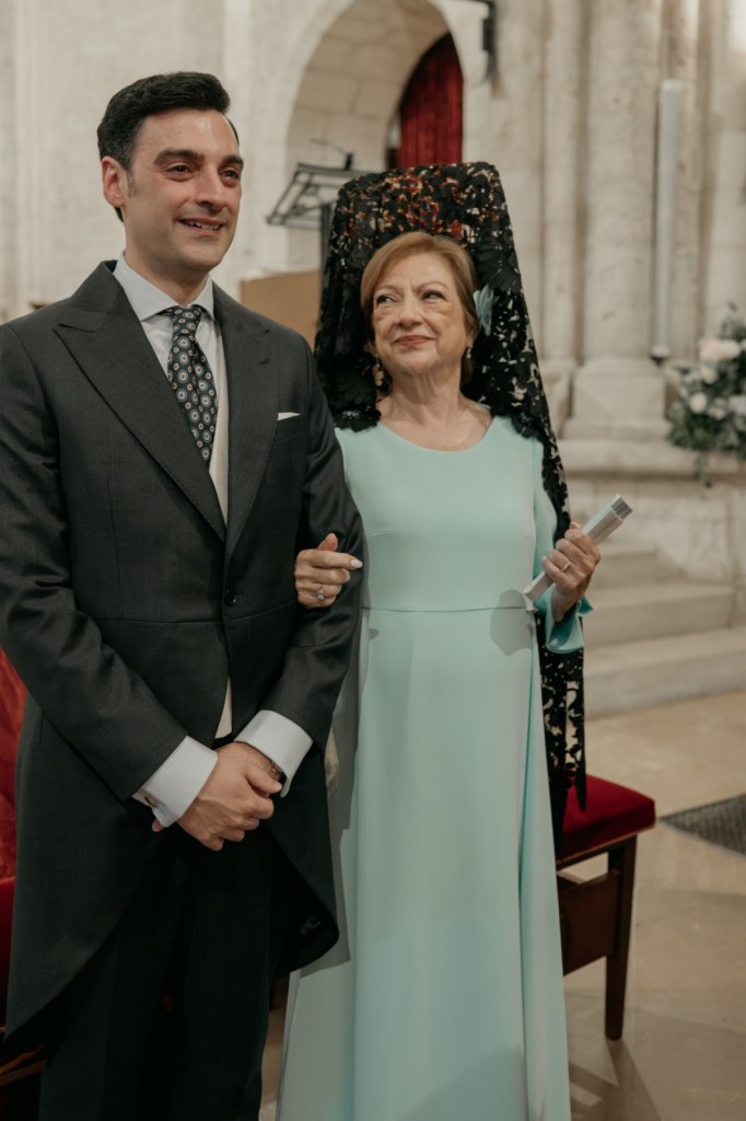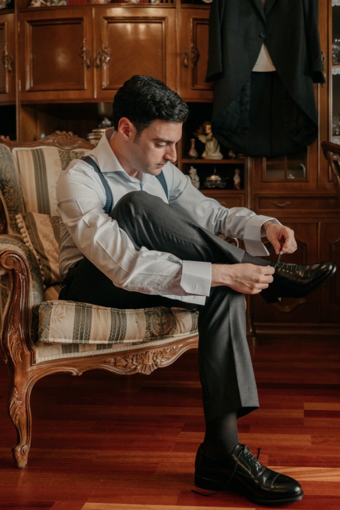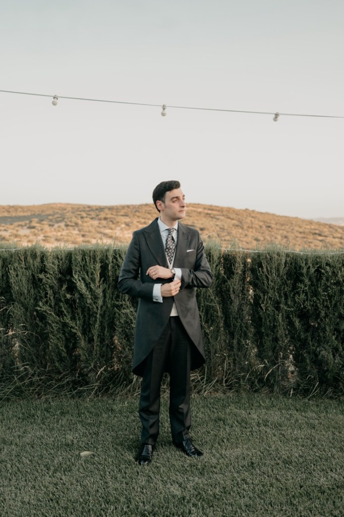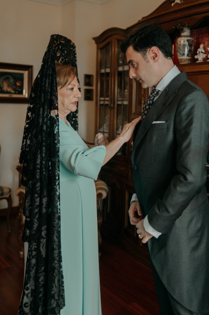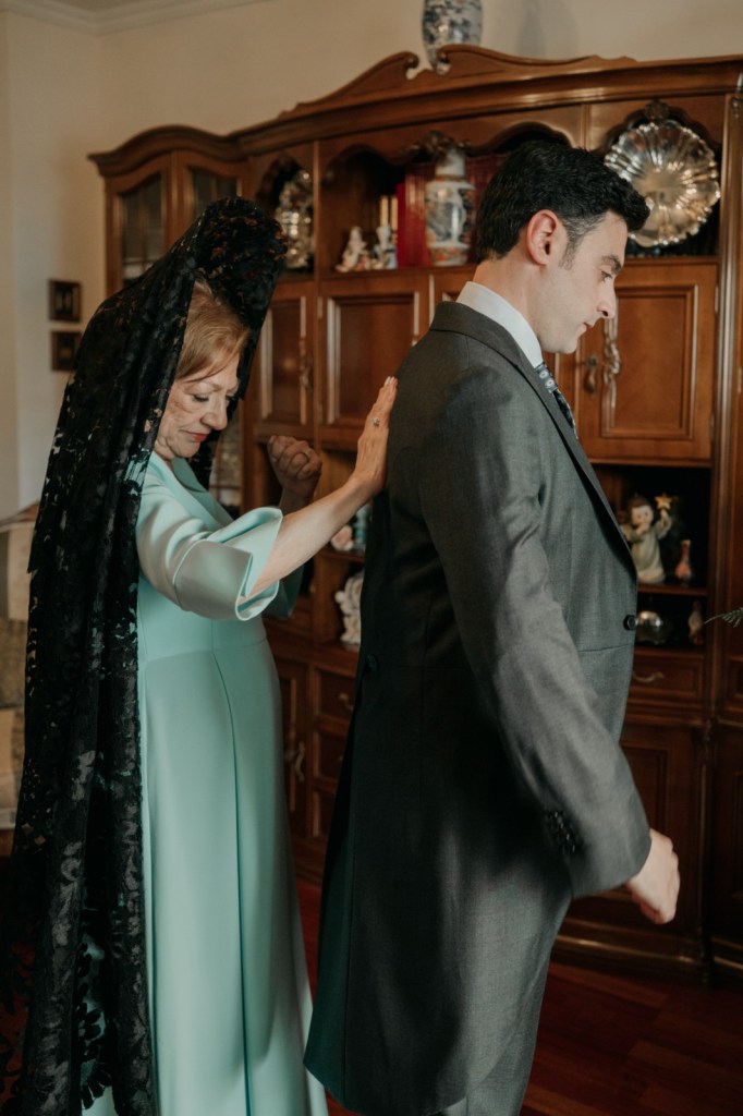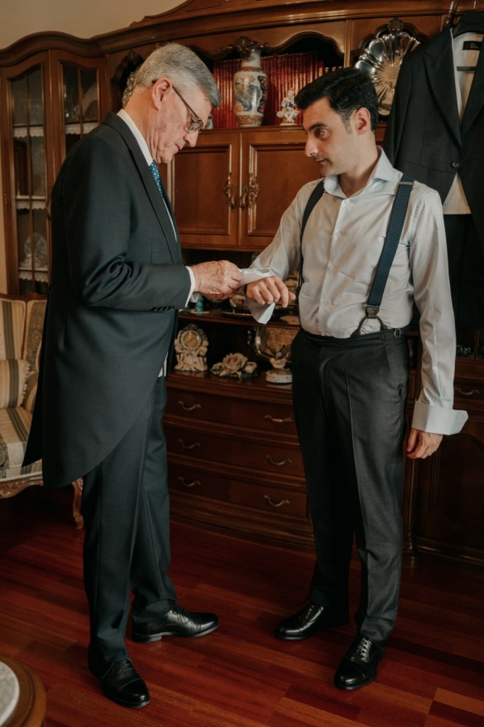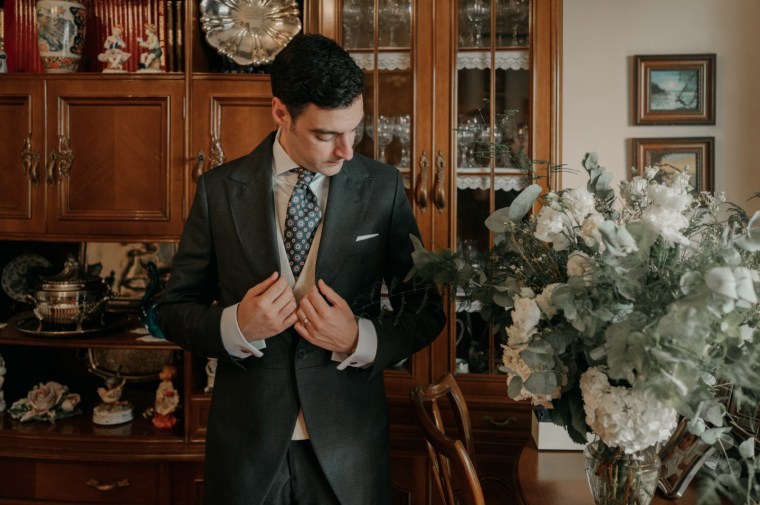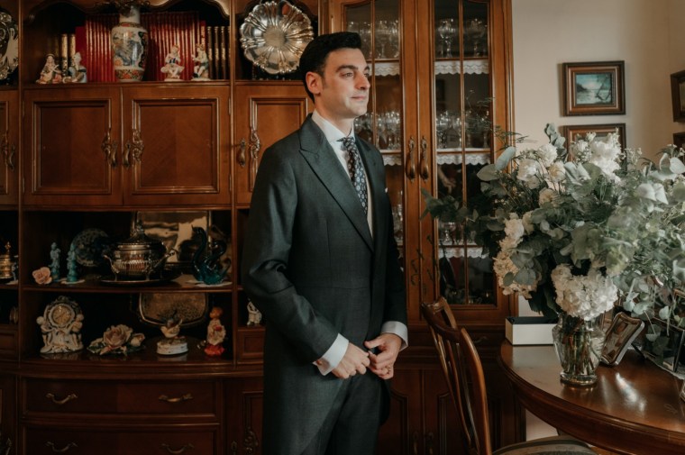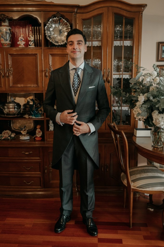 Ángel eligió el hogar de sus padres para prepararse, rodeado de su familia más cercana: padres, hermano, cuñada y su sobrina. Allí se vivieron momentos muy especiales, de esos que hablan de raíces, de cariño y de una complicidad que no necesita palabras. Para la ocasión, lució un impecable chaqué gris marengo de Old Jeffrey, acompañado de gemelos y alfiler dorados de herencia familiar, y una corbata azul marino con un original estampado geométrico que aportaba un toque muy personal.