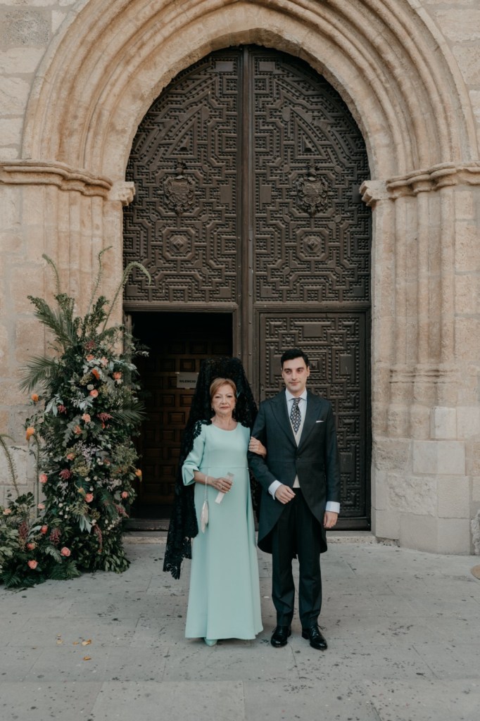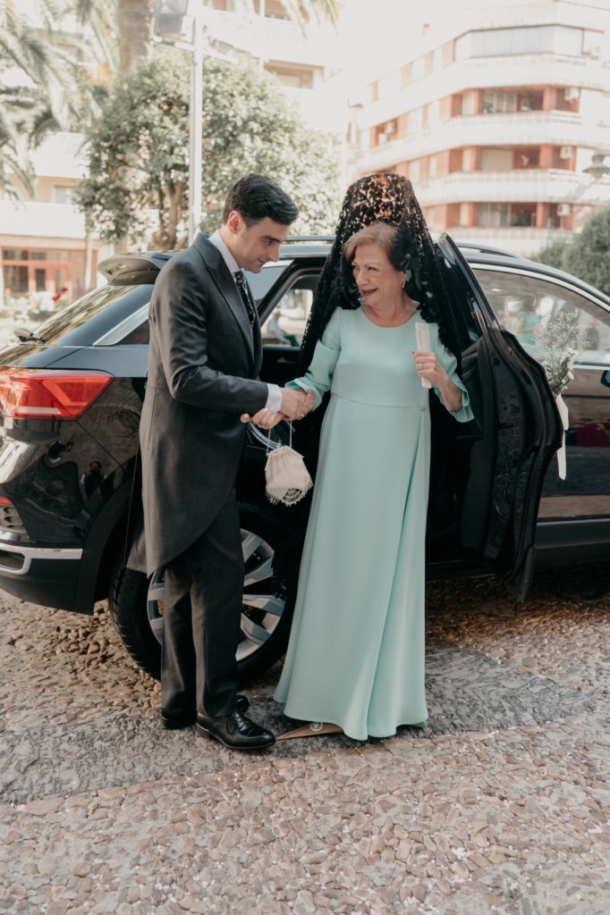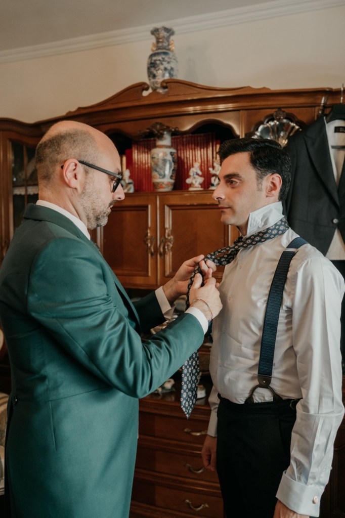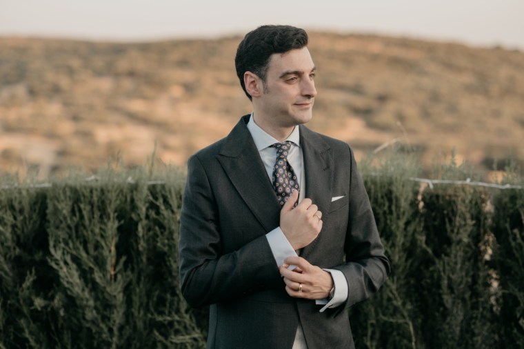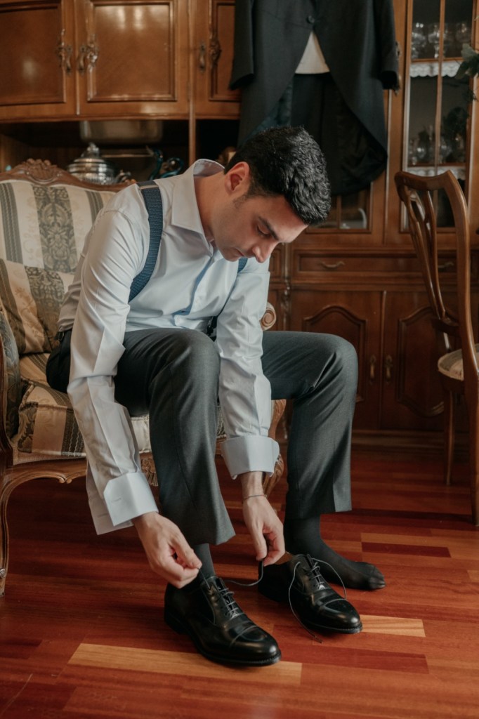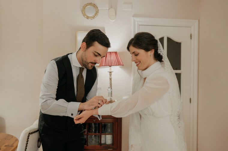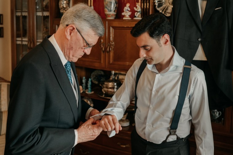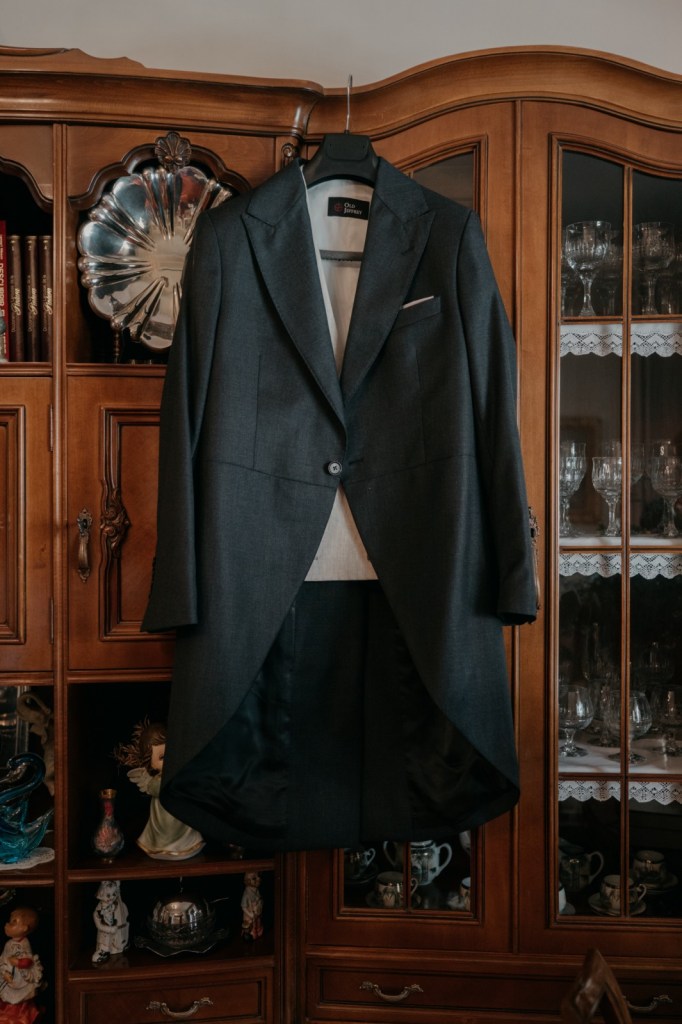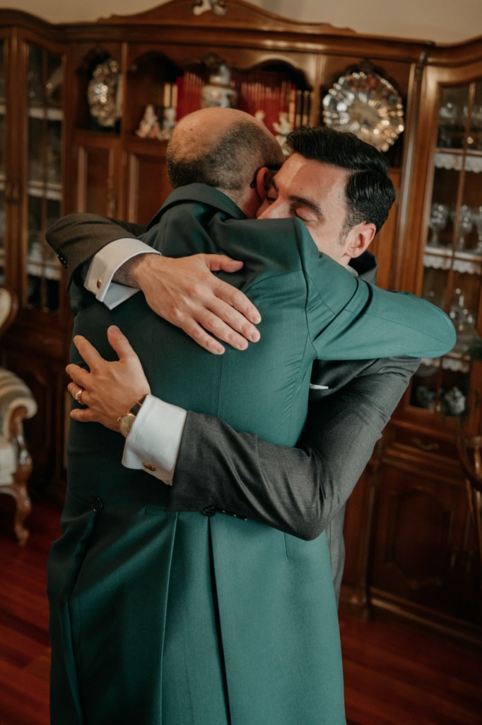 Ángel eligió el hogar de sus padres para prepararse, rodeado de su familia más cercana: padres, hermano, cuñada y su sobrina. Allí se vivieron momentos muy especiales, de esos que hablan de raíces, de cariño y de una complicidad que no necesita palabras. Para la ocasión, lució un impecable chaqué gris marengo de Old Jeffrey, acompañado de gemelos y alfiler dorados de herencia familiar, y una corbata azul marino con un original estampado geométrico que aportaba un toque muy personal.