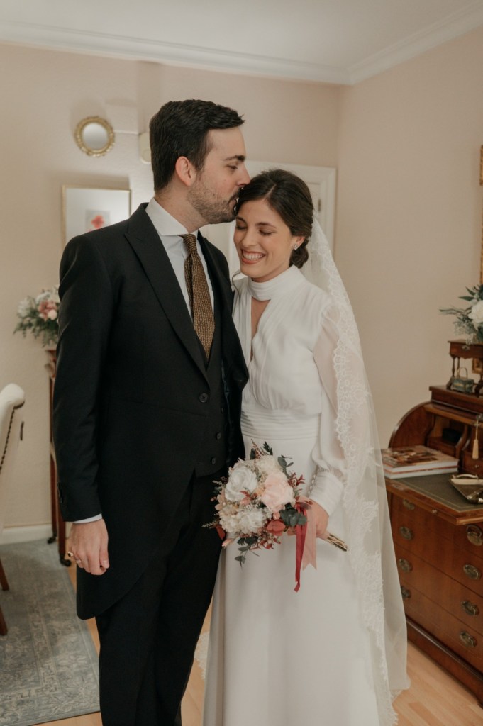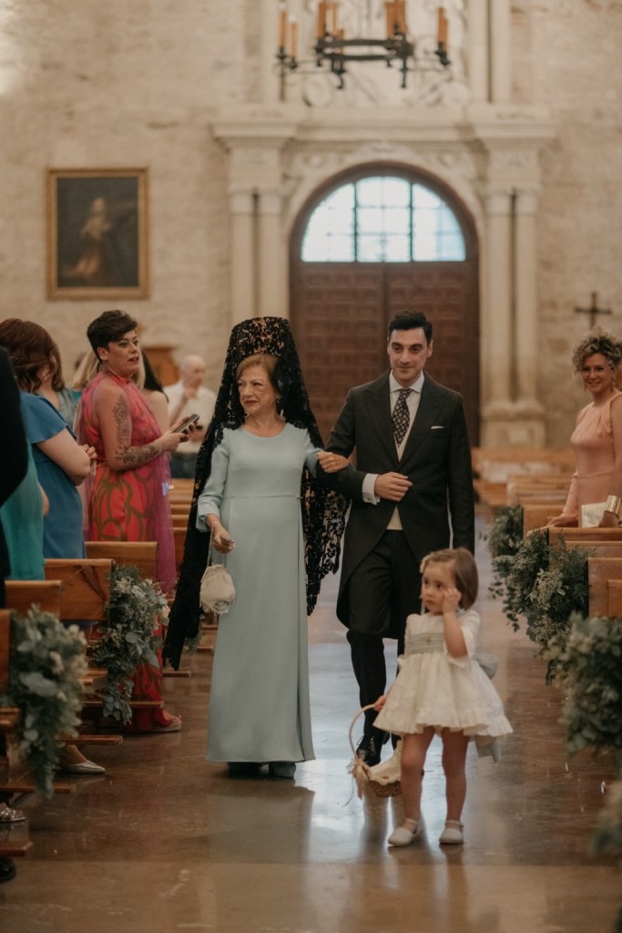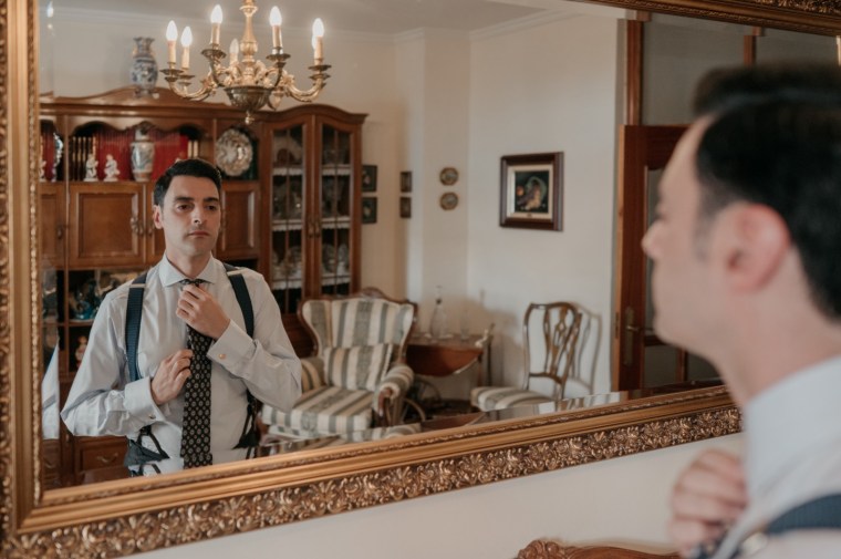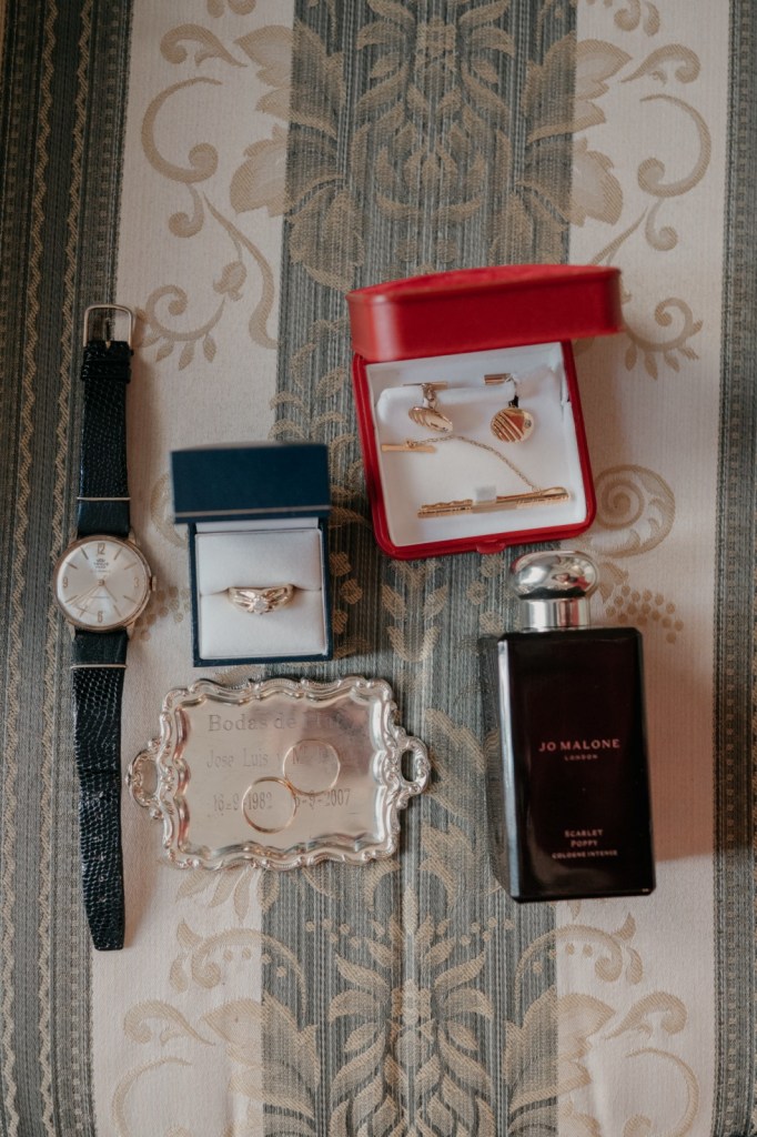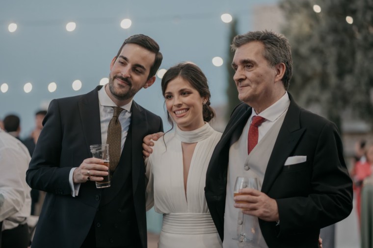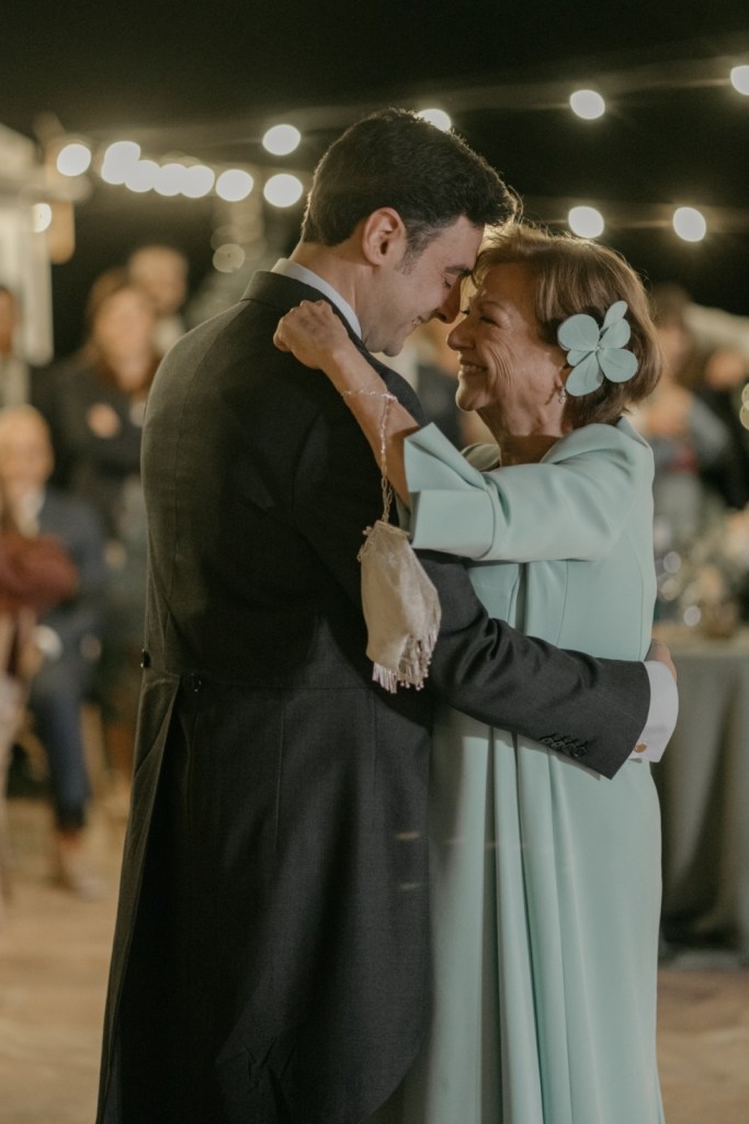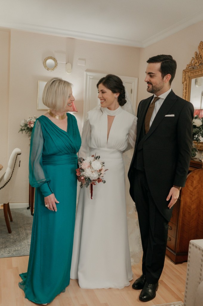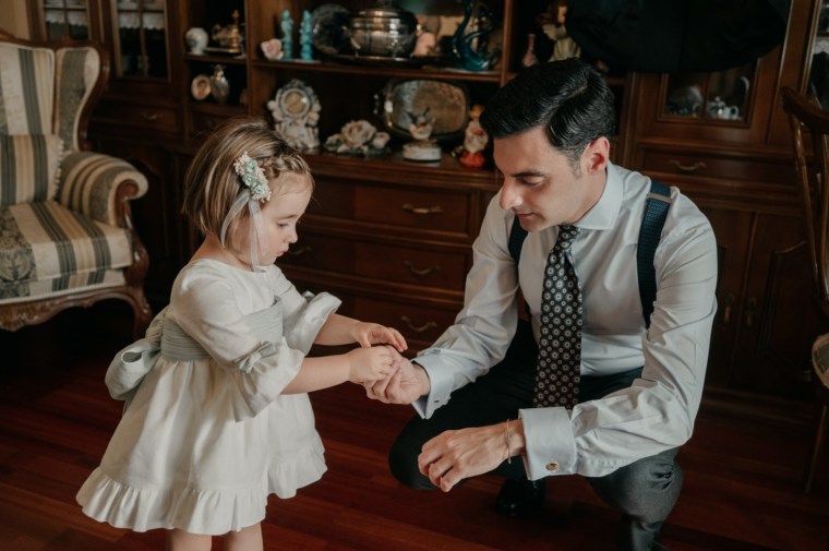 Ángel eligió el hogar de sus padres para prepararse, rodeado de su familia más cercana: padres, hermano, cuñada y su sobrina. Allí se vivieron momentos muy especiales, de esos que hablan de raíces, de cariño y de una complicidad que no necesita palabras. Para la ocasión, lució un impecable chaqué gris marengo de Old Jeffrey, acompañado de gemelos y alfiler dorados de herencia familiar, y una corbata azul marino con un original estampado geométrico que aportaba un toque muy personal.