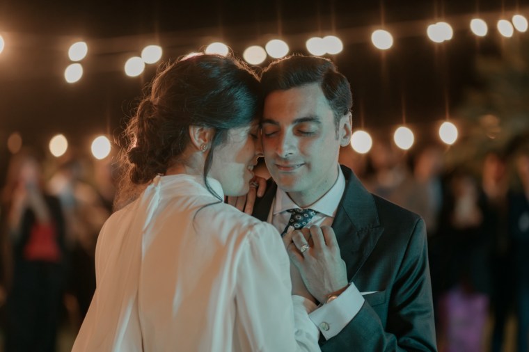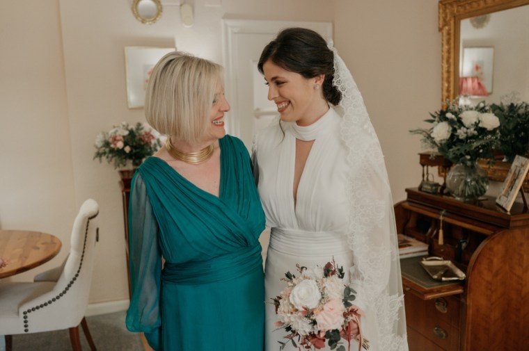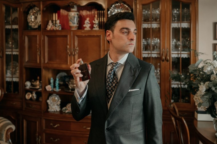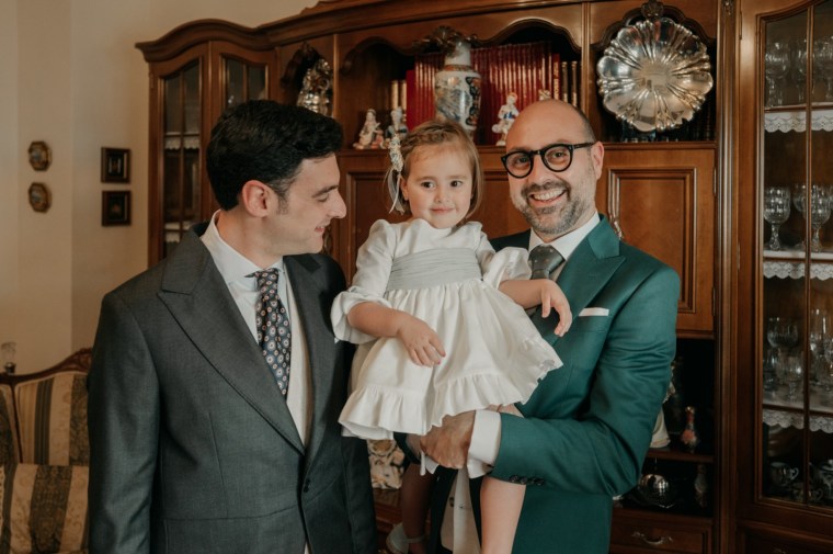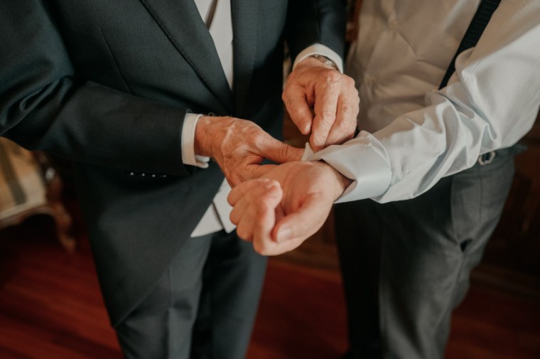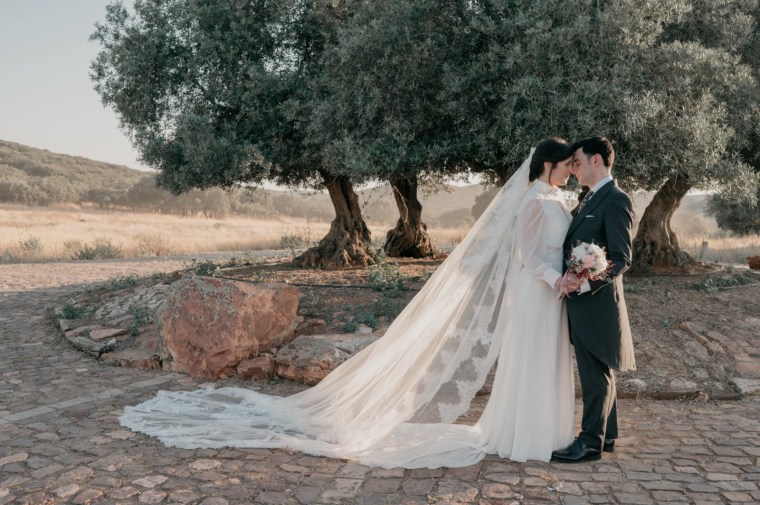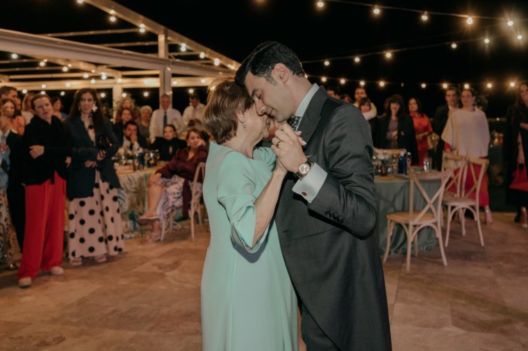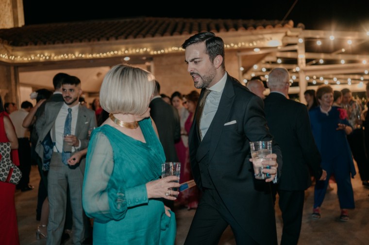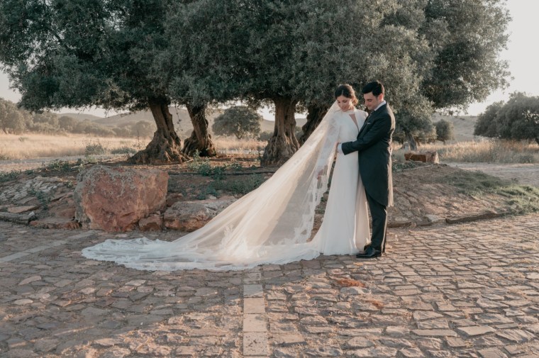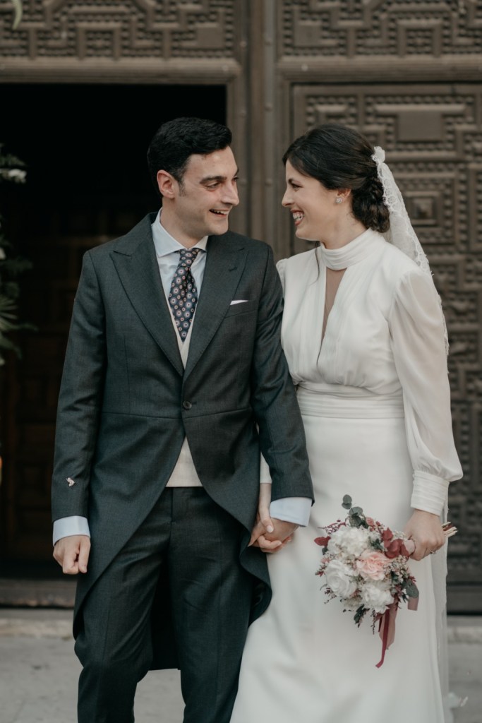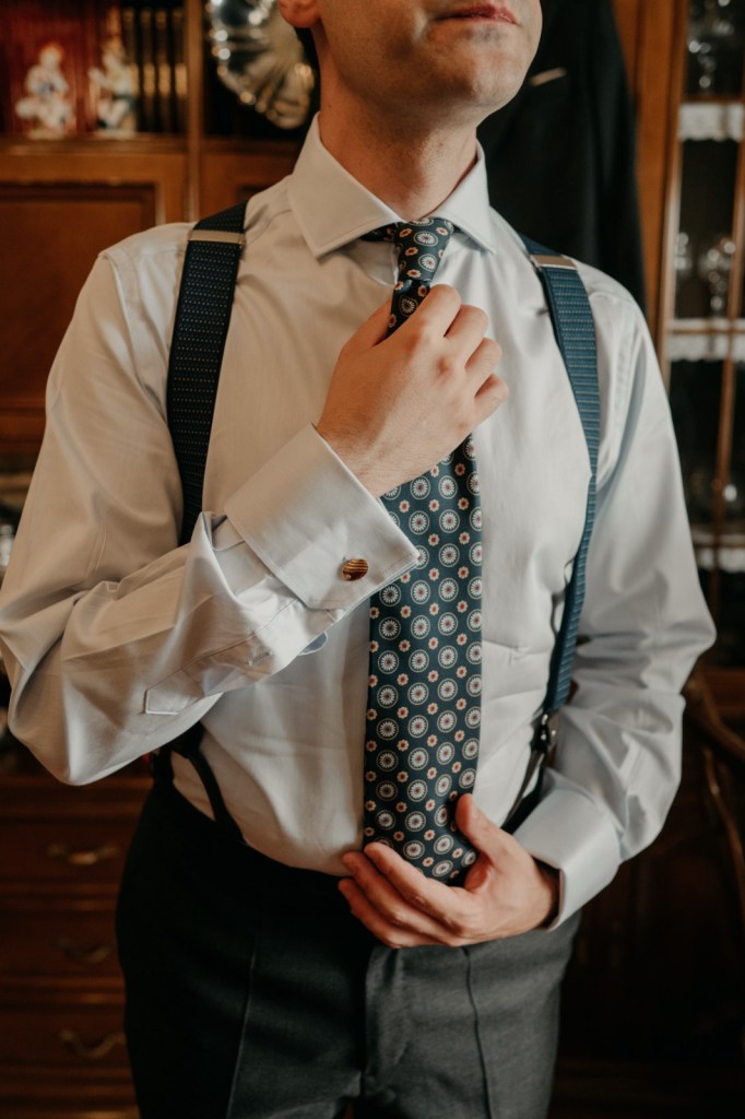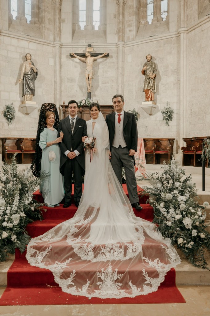 Ángel eligió el hogar de sus padres para prepararse, rodeado de su familia más cercana: padres, hermano, cuñada y su sobrina. Allí se vivieron momentos muy especiales, de esos que hablan de raíces, de cariño y de una complicidad que no necesita palabras. Para la ocasión, lució un impecable chaqué gris marengo de Old Jeffrey, acompañado de gemelos y alfiler dorados de herencia familiar, y una corbata azul marino con un original estampado geométrico que aportaba un toque muy personal.