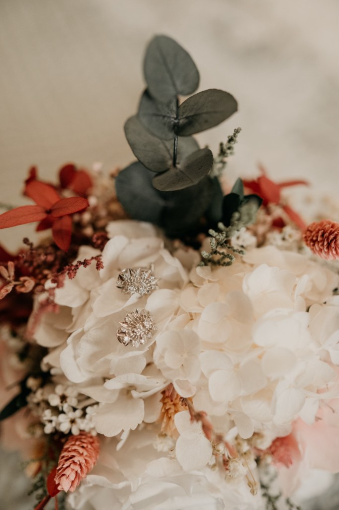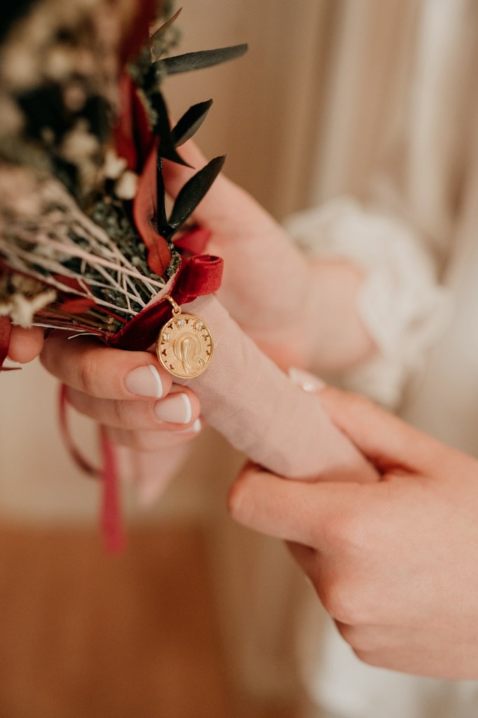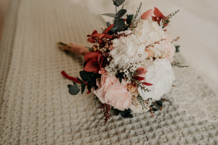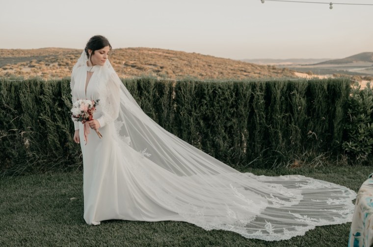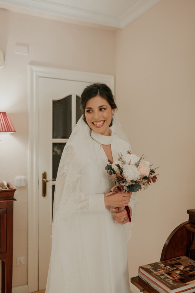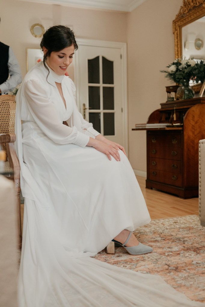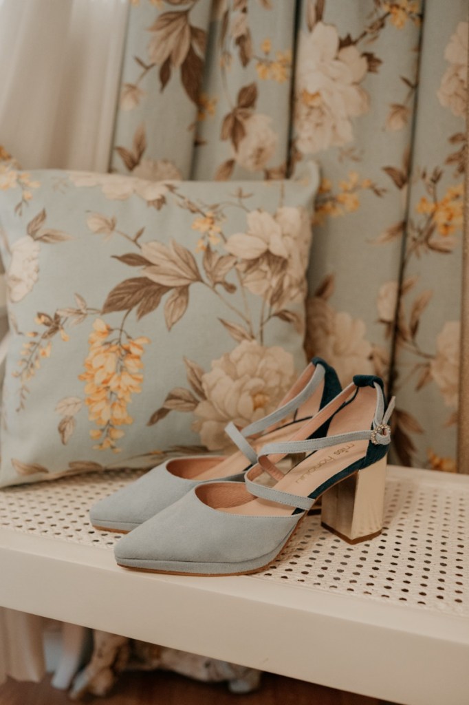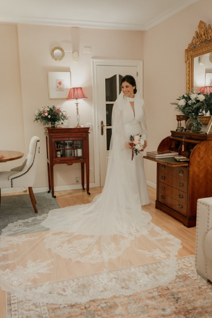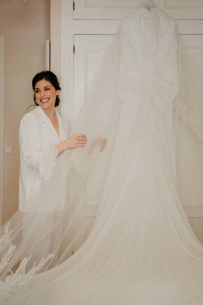 El conjunto se completaba con un largo velo bordado en encaje que aportaba aún más magia a su look. Como detalle de color, eligió unos zapatos de terciopelo azul celeste con tacón dorado de Miss Honolulu, y un ramo de flores preservadas en tonos blancos y rosas. Su recogido, natural y sofisticado, fue obra de Pureza Belleza Natural.