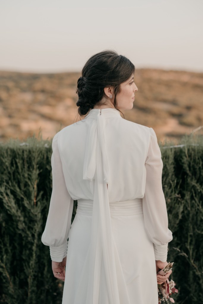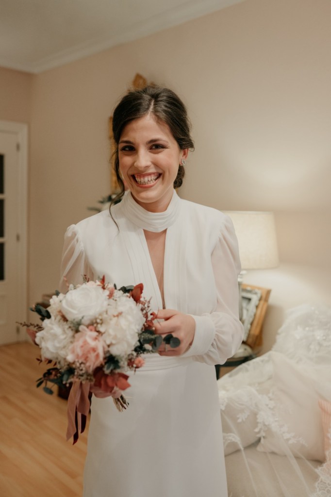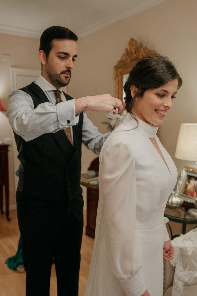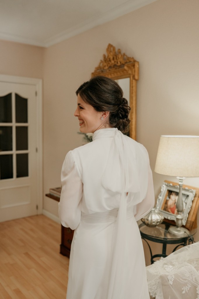 Arantxa, fiel a esa misma esencia íntima, también se preparó en su casa familiar junto a su madre y su hermano. Su vestido, de Pronovias, destacaba por su romanticismo y delicadeza: corte recto, escote en pico, mangas de tul y un elegante anudado al cuello que terminaba en un precioso lazo en la espalda.