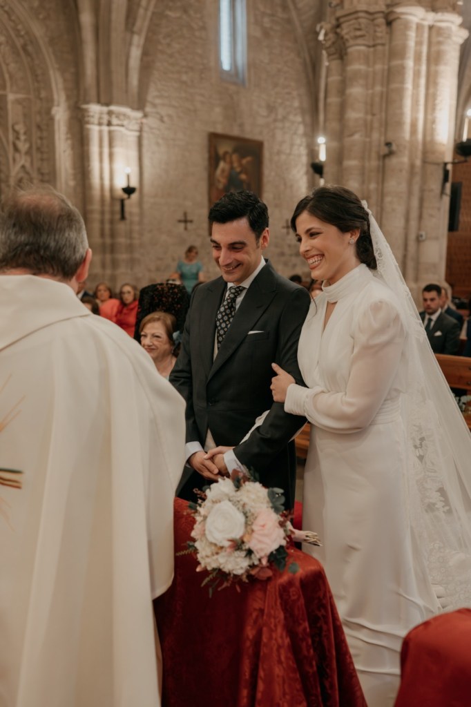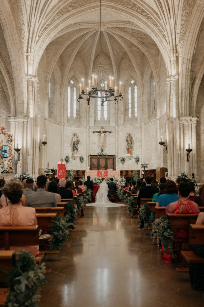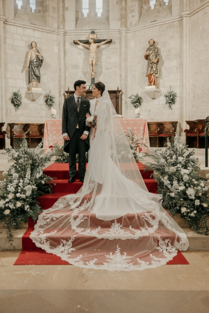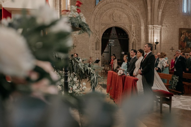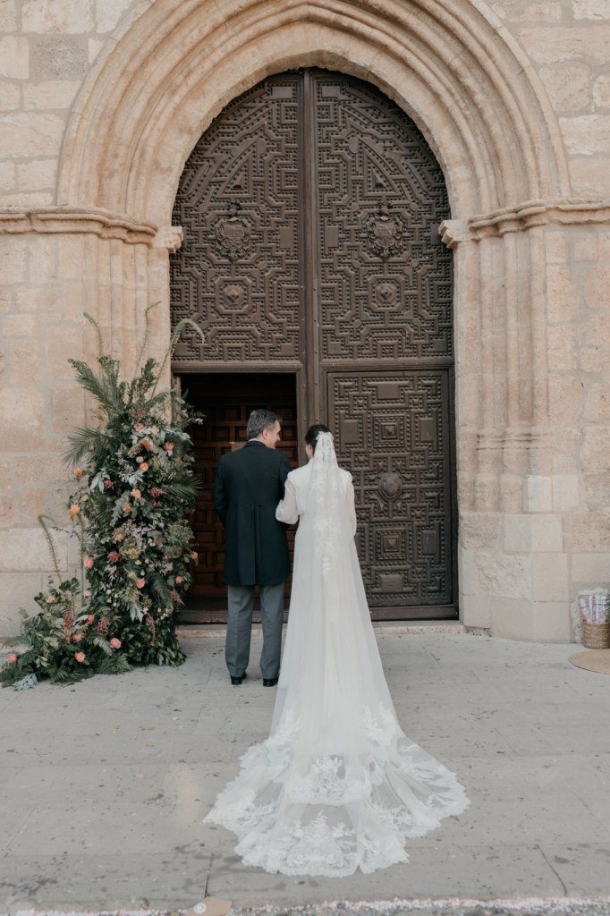 La ceremonia tuvo lugar en la majestuosa iglesia de San Pedro, en Ciudad Real, un escenario imponente que lucía aún más especial gracias a la cuidada decoración floral de Ingenia. A la entrada, una elegante columna de flores en tonos cálidos daba la bienvenida a los invitados.