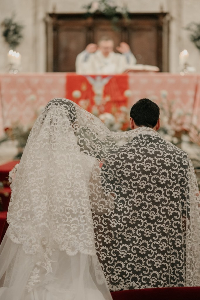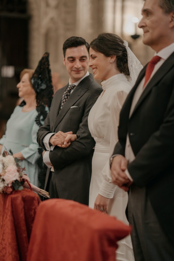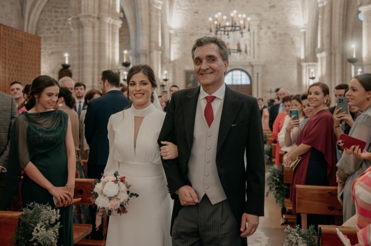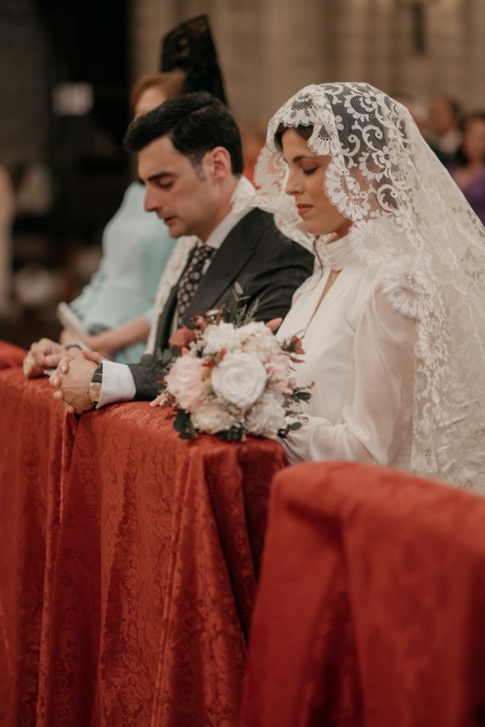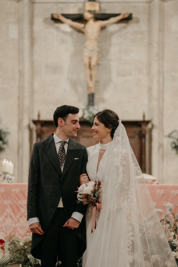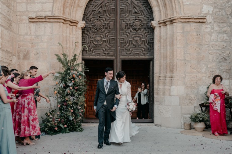 La ceremonia tuvo lugar en la majestuosa iglesia de San Pedro, en Ciudad Real, un escenario imponente que lucía aún más especial gracias a la cuidada decoración floral de Ingenia. A la entrada, una elegante columna de flores en tonos cálidos daba la bienvenida a los invitados.