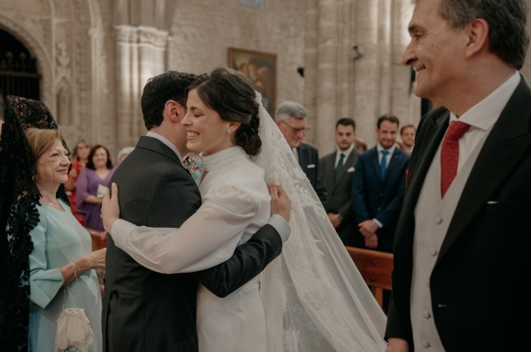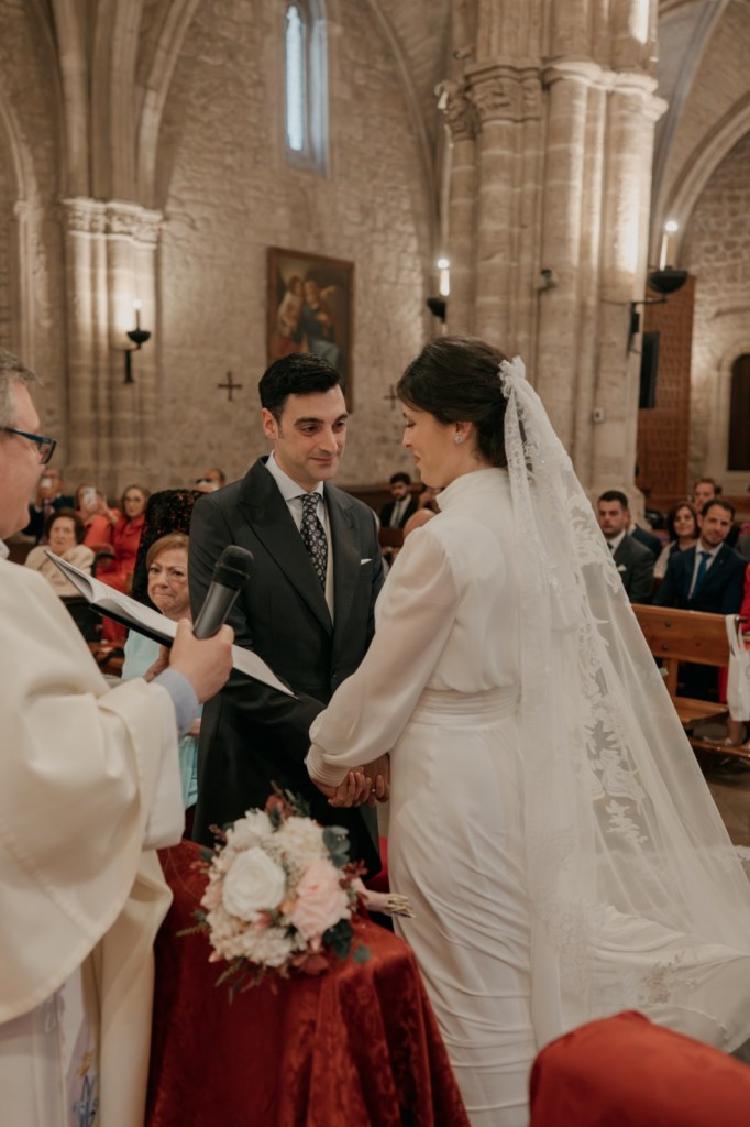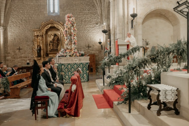 El pasillo central y el altar estaban adornados con eucalipto, helecho, rosas y claveles blancos, creando una atmósfera armoniosa y delicada. Uno de los momentos más emocionantes llegó con el primer encuentro de los novios, cuando se fundieron en un abrazo que reflejaba perfectamente todo lo que son. Además, la Virgen de Alarcos, presente en su paso en vísperas de su romería, fue testigo de esta unión tan especial.