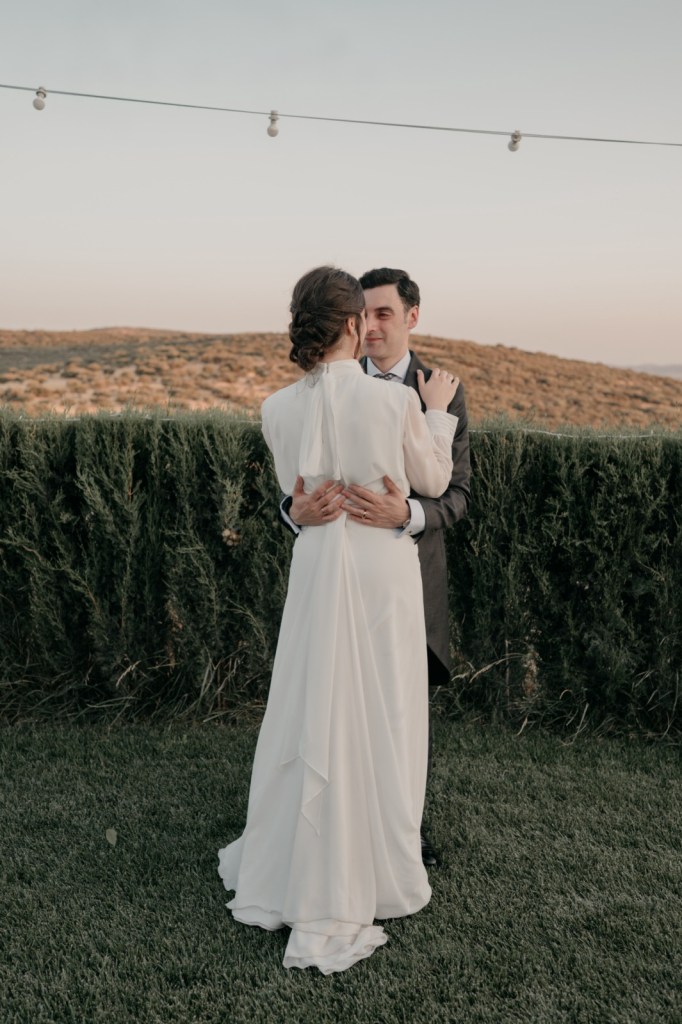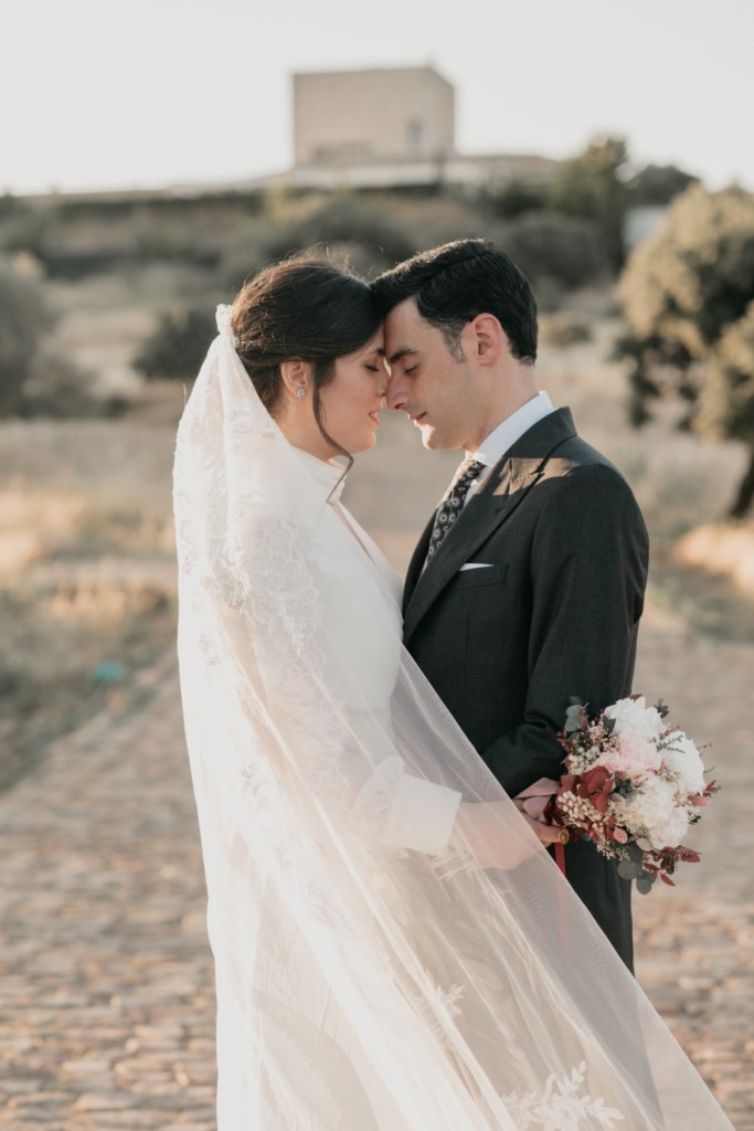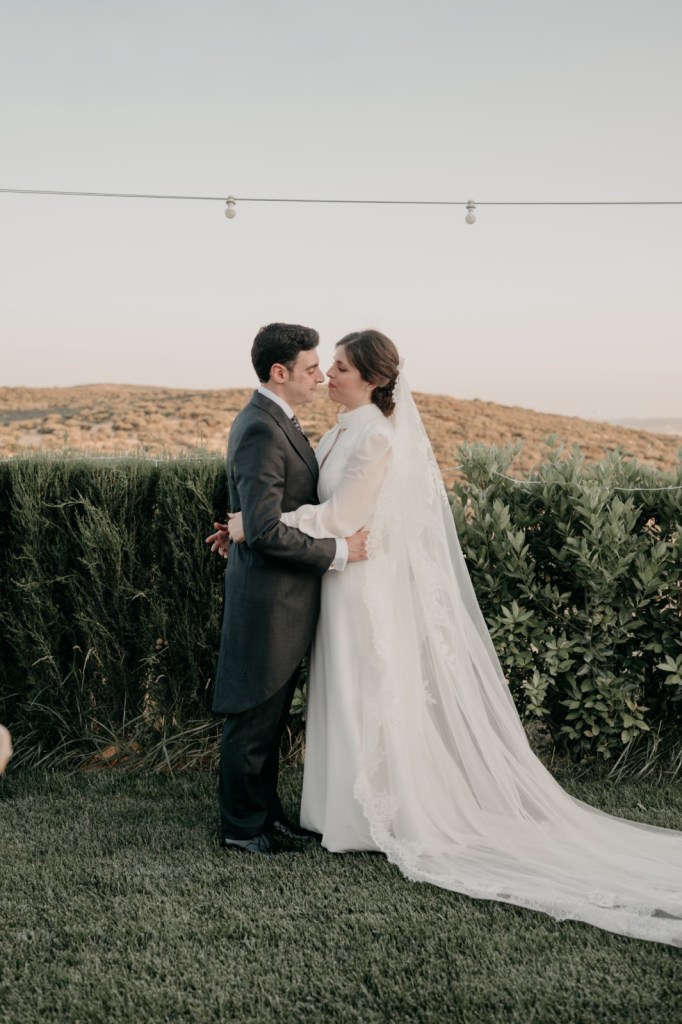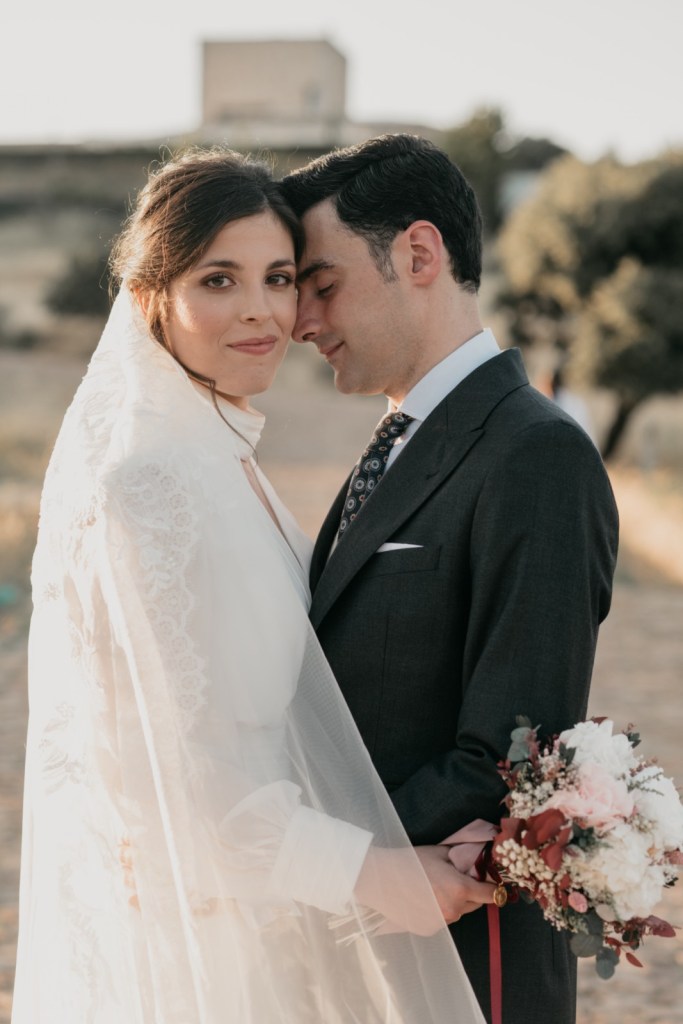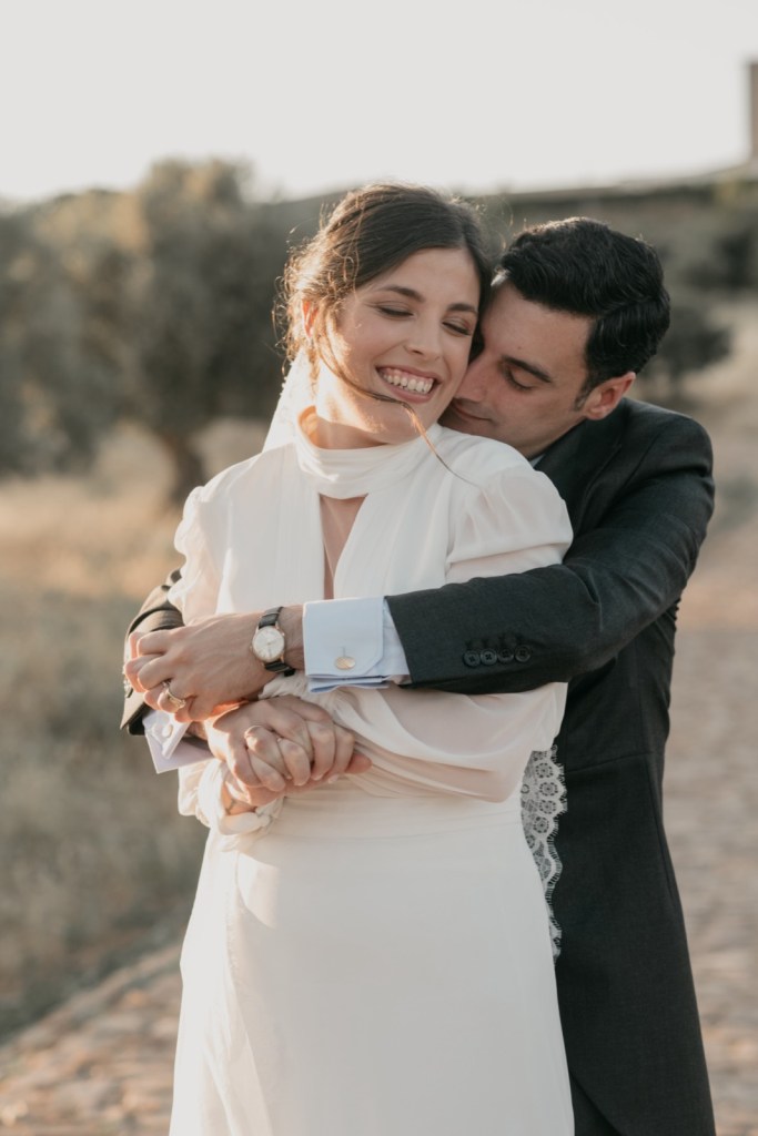 Tras la ceremonia y los abrazos a la salida de la iglesia, nos trasladamos a la finca El Mirador de la Dehesa, donde tendría lugar la celebración. Antes de comenzar el cóctel, aprovechamos la preciosa luz del atardecer para realizar una sesión de pareja llena de calma, complicidad y belleza natural.