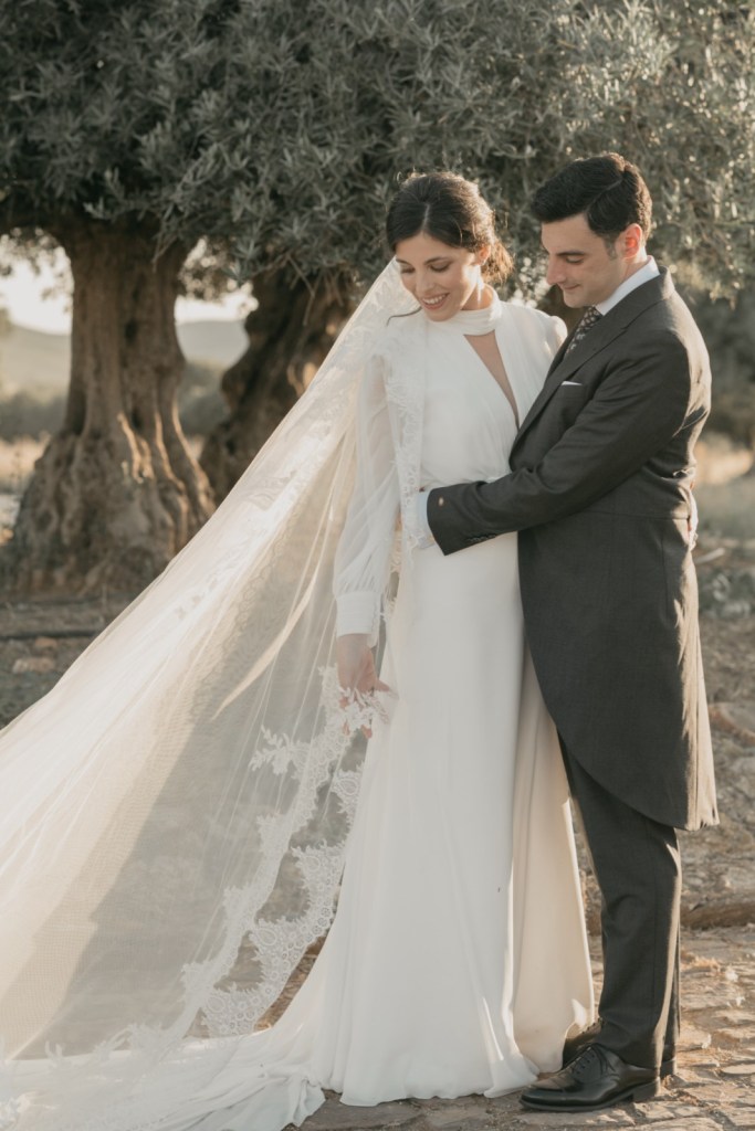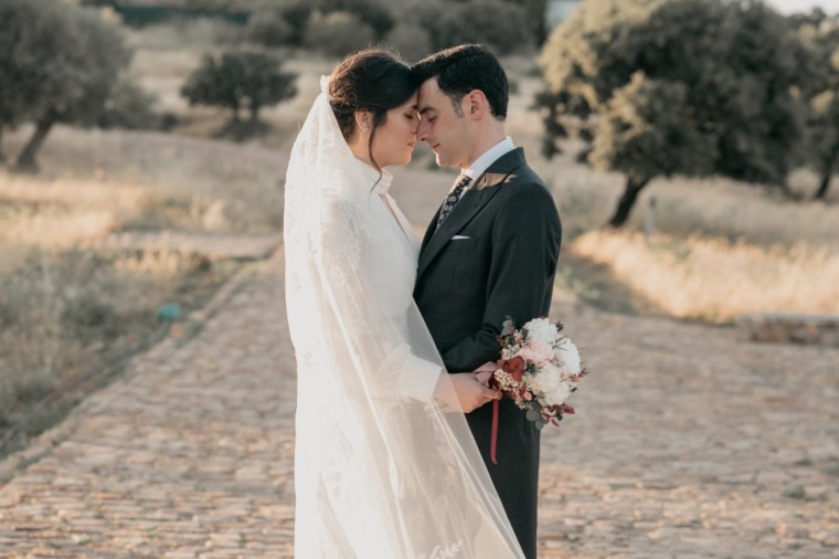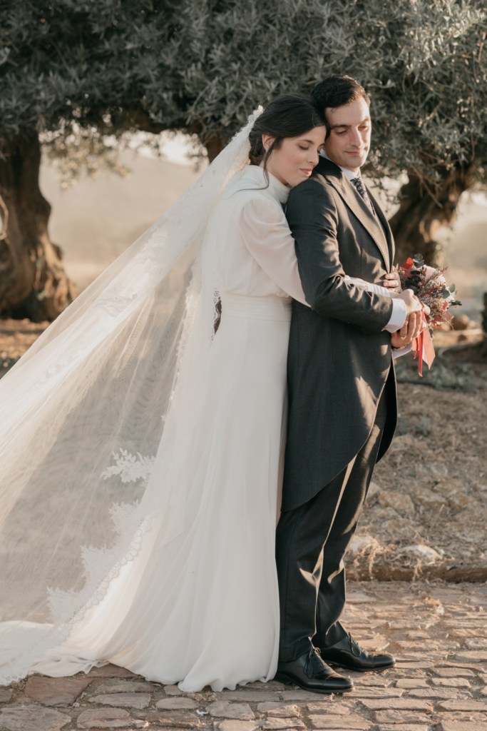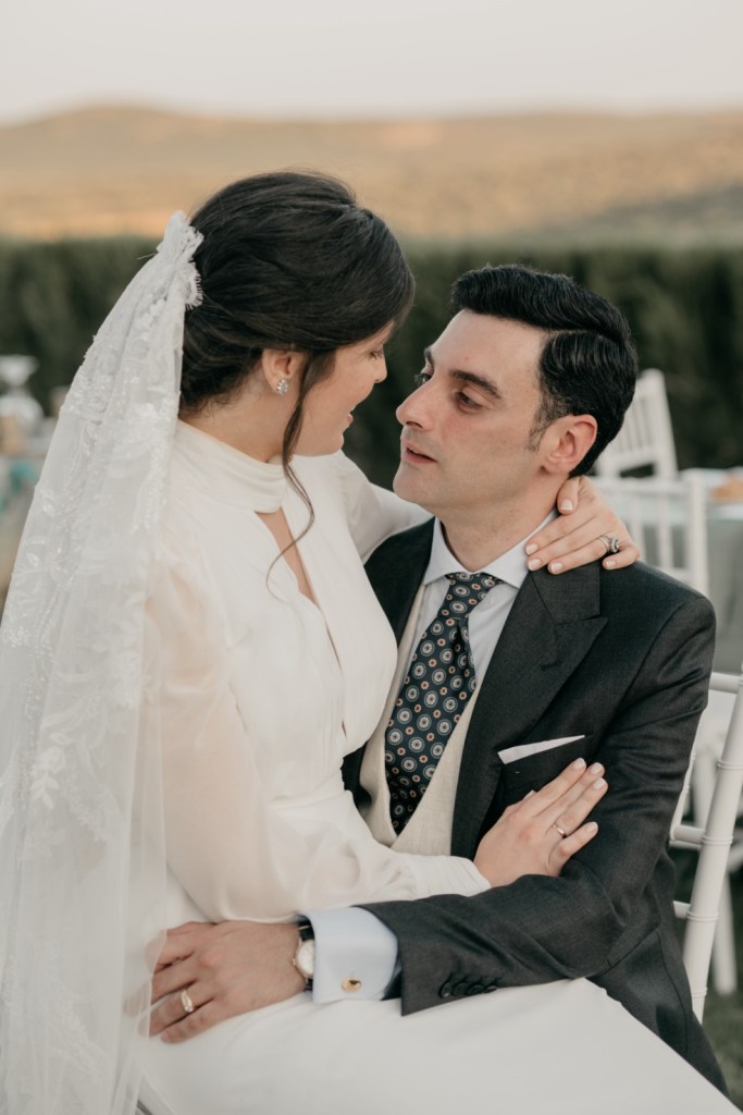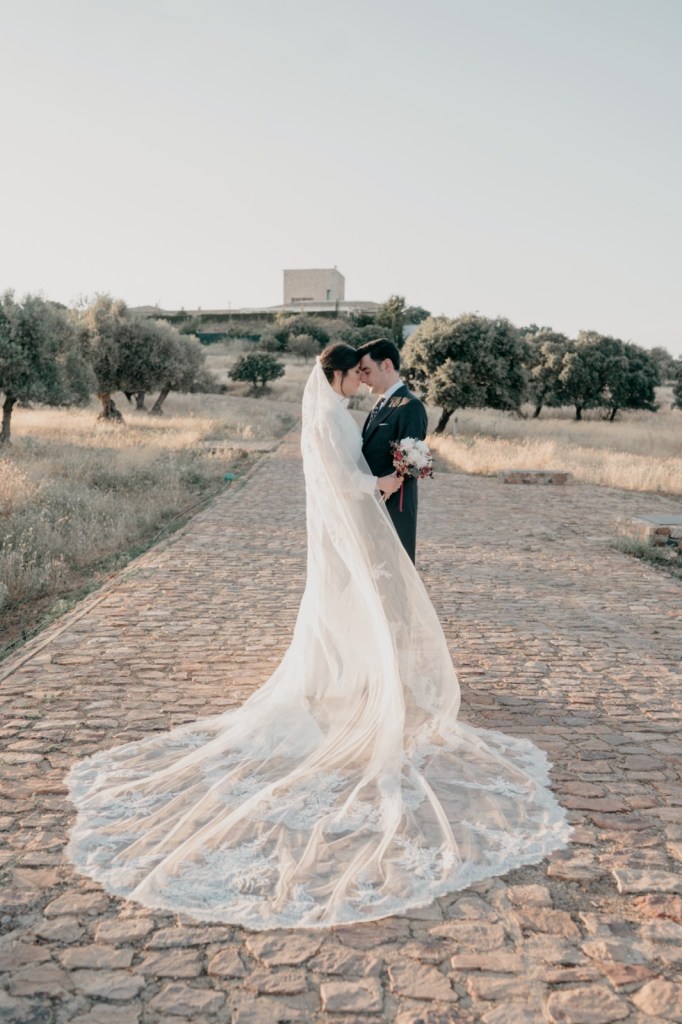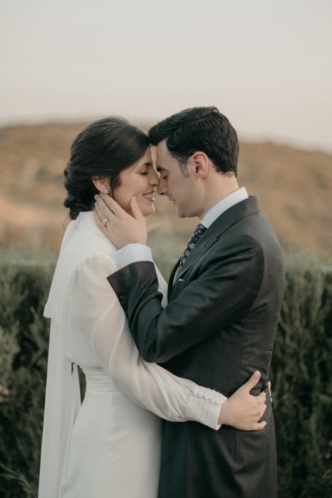 Tras la ceremonia y los abrazos a la salida de la iglesia, nos trasladamos a la finca El Mirador de la Dehesa, donde tendría lugar la celebración. Antes de comenzar el cóctel, aprovechamos la preciosa luz del atardecer para realizar una sesión de pareja llena de calma, complicidad y belleza natural.